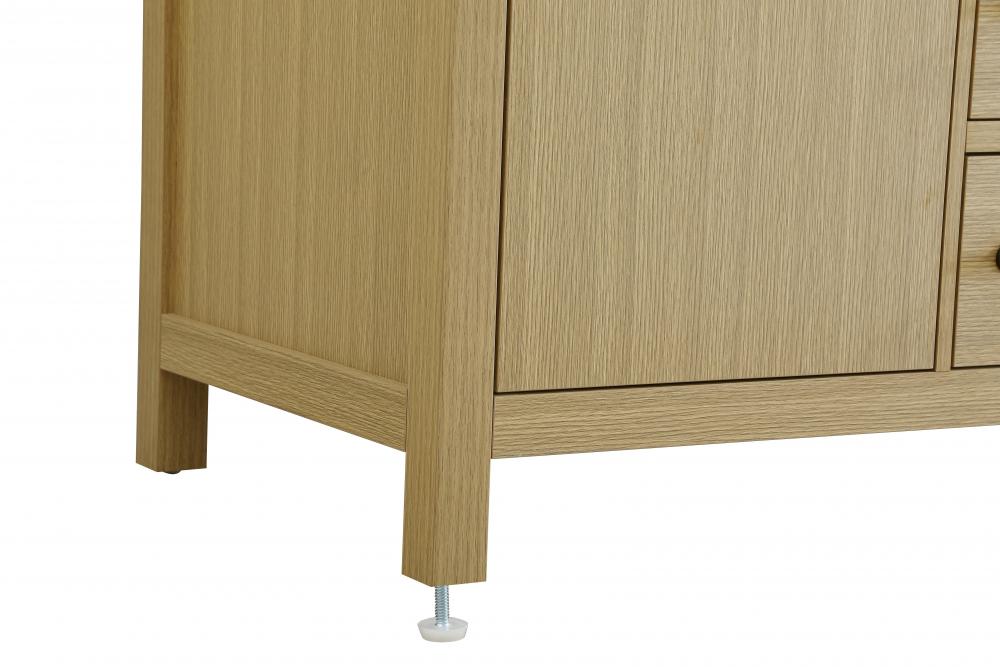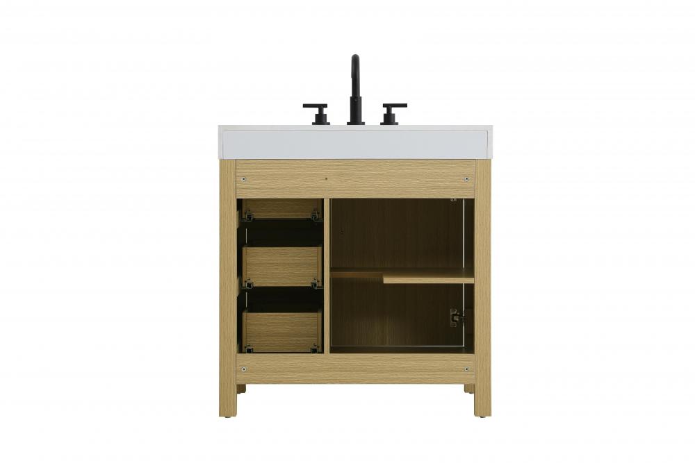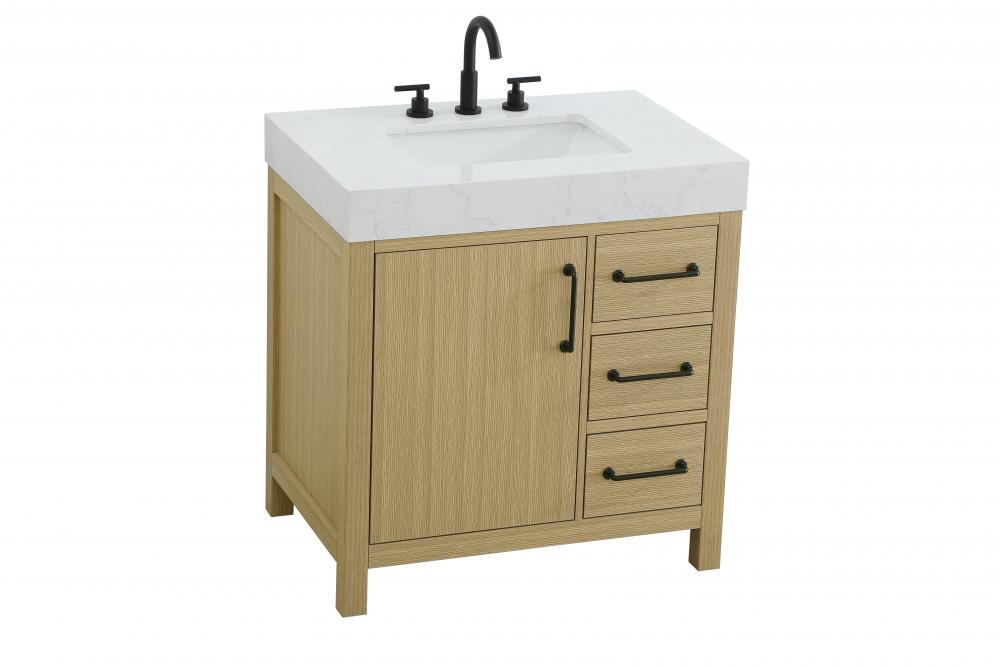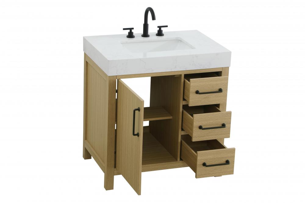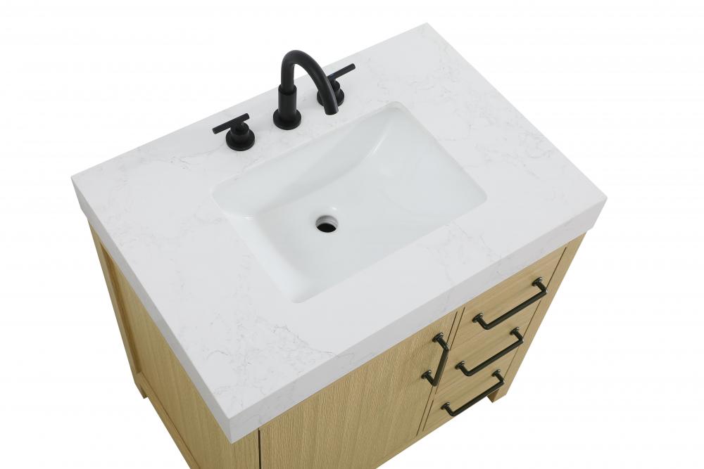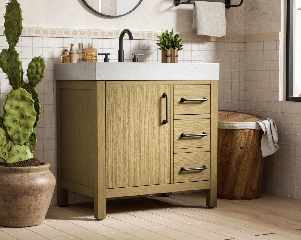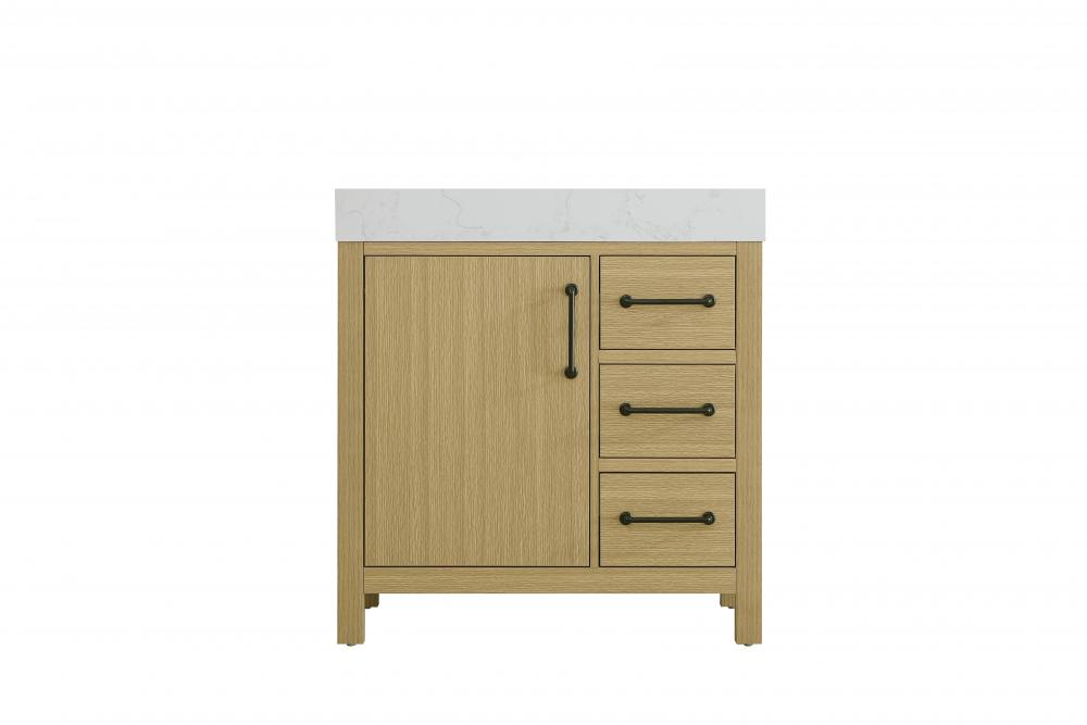 This bathroom vanity showcases a balanced blend of contemporary style and warm, natural-like elements, making it a versatile addition to various interior designs. The clean, straight edges and flat-panel doors lend a modern, streamlined look, while the soft, light wood finish highlights the faux grain pattern, adding warmth and a sense of organic texture to the piece. The vanity features a functional layout, with two cabinet doors on one side and three stacked drawers on the other, creating a balanced and organized look. Matte black hardware, including slim and cylindrical pulls, contrasts elegantly against the light wood, reinforcing its contemporary vibe while providing subtle visual interest. The thick engineered marble countertop in crisp white adds a sharp contrast to the light base, creating a visually dynamic combination that is both functional and stylish. This vanity is perfect for those seeking a design that combines modern simplicity with a touch of bold refinement. This vanity is delivered fully assembled and equipped with foot levelers for effortless installation and stability. Complete the setup with an optional matching backsplash, sold separately. Combining practicality and bold design, this vanity is UPC certified and ready to transform your bathroom space.