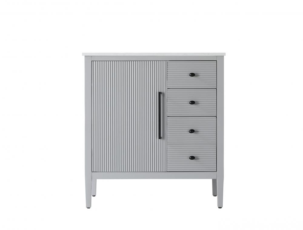 The textured fluted design on the door and drawer panels adds visual interest and elegance, creating a balance of classic charm and contemporary style.