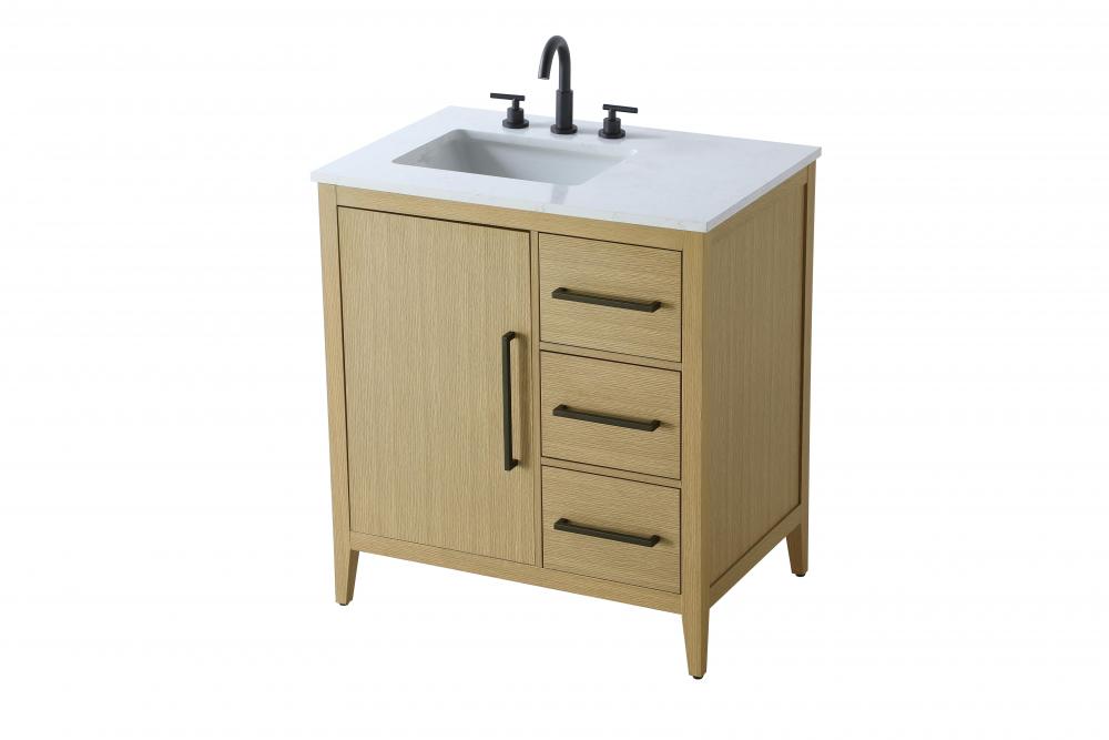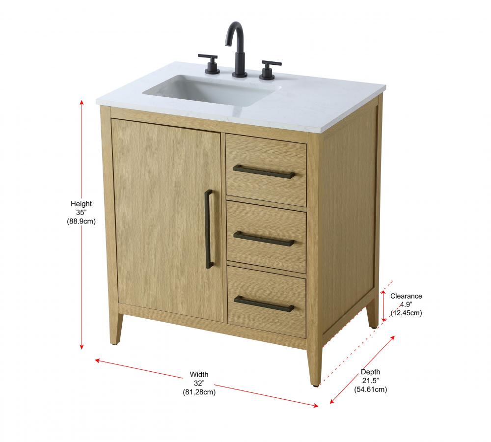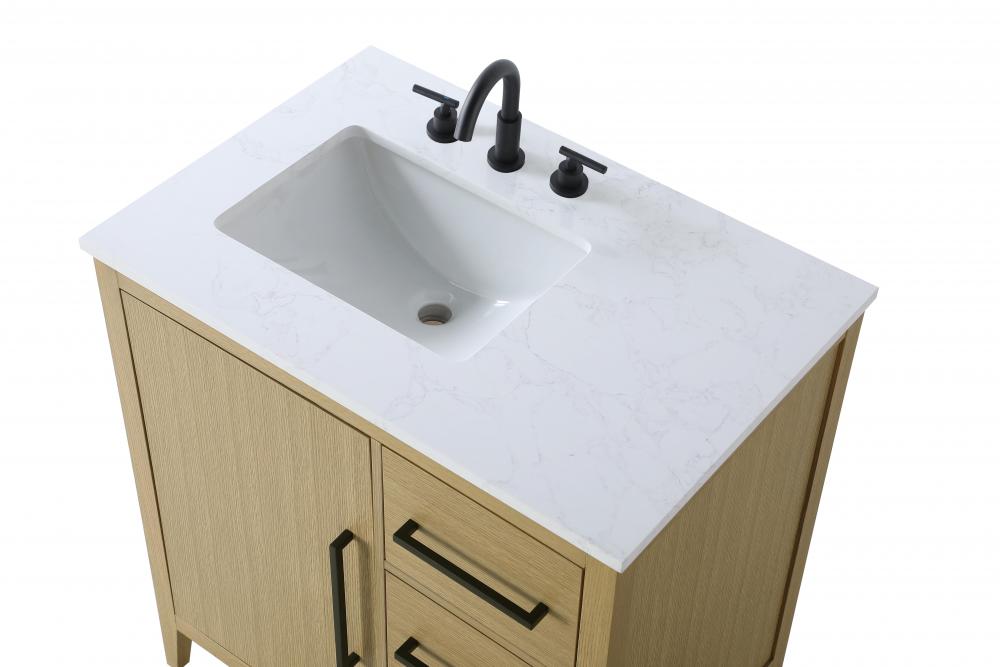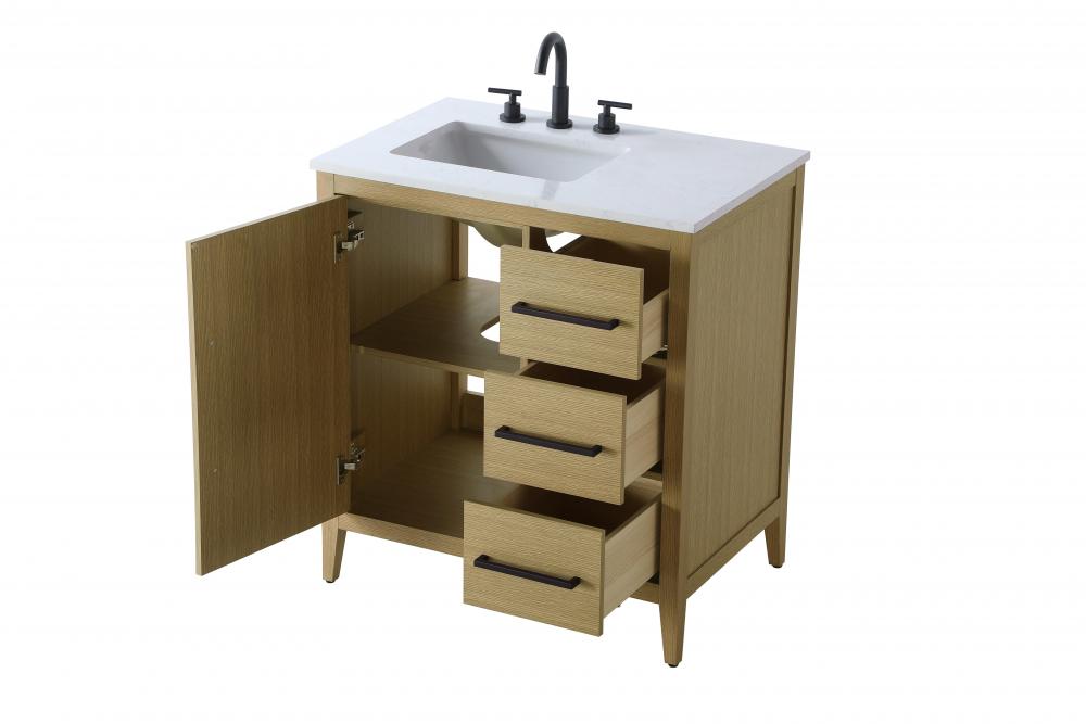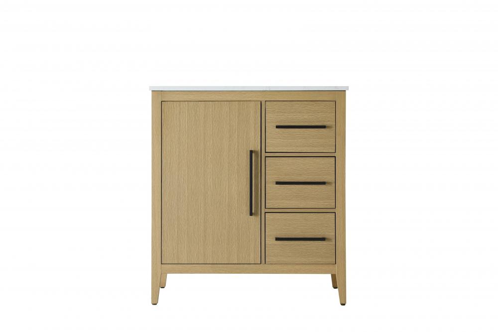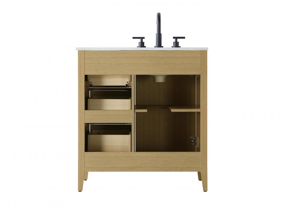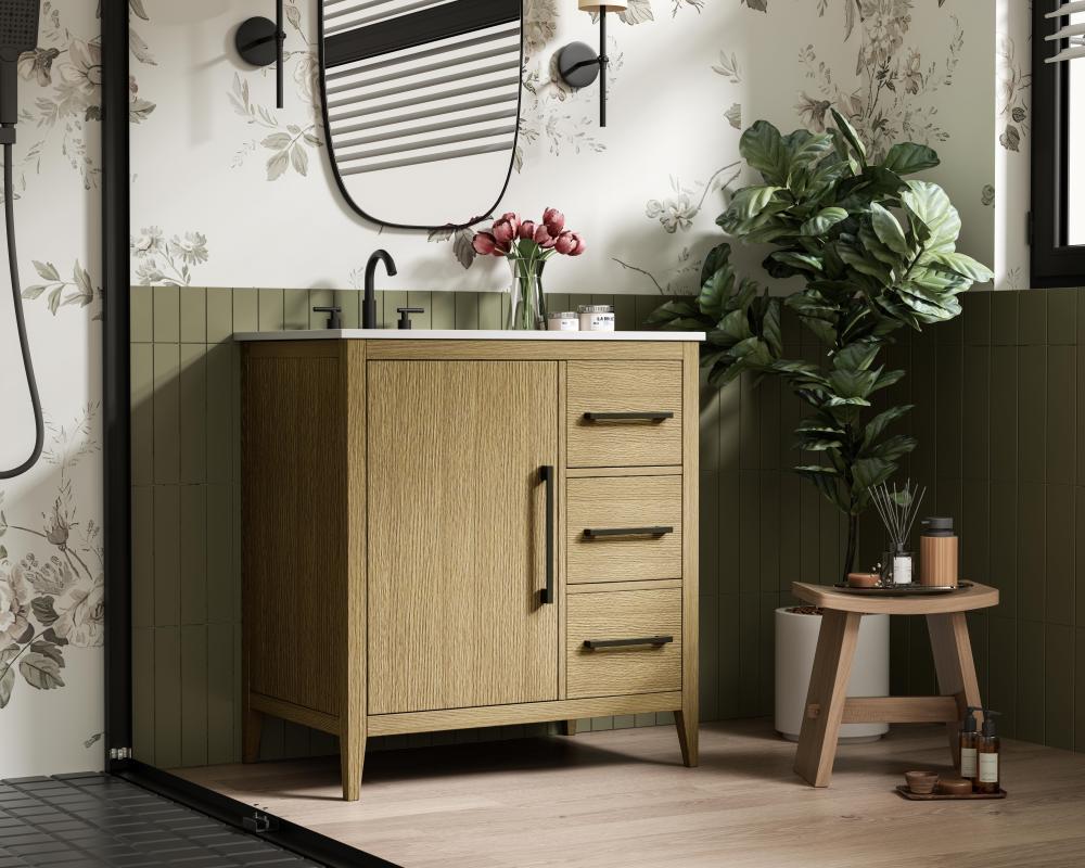 Bring both elegance and practicality to your bathroom with this transitional vanity, available in a selection of rich finishes that highlight the beauty of faux wood grain in shades of mocha, chestnut, and honey, along with classic white and modern grey. The flat door panels and sleek black metal pulls create a minimalist yet refined aesthetic, while the soft-closing drawers and tapered legs with levelers provide smooth, functional operation. Topped with a luxurious white engineered marble countertop and featuring a porcelain sink, this vanity combines timeless style with modern efficiency. Thoughtfully designed with U-shaped cutout for plumbing, it offers ample storage and easy installation, making it the perfect centerpiece for any bathroom.