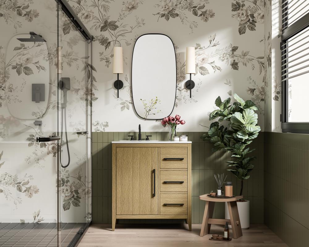The minimalist flat door panels create a sleek, modern appearance, perfect for blending into transitional and contemporary bathroom designs.