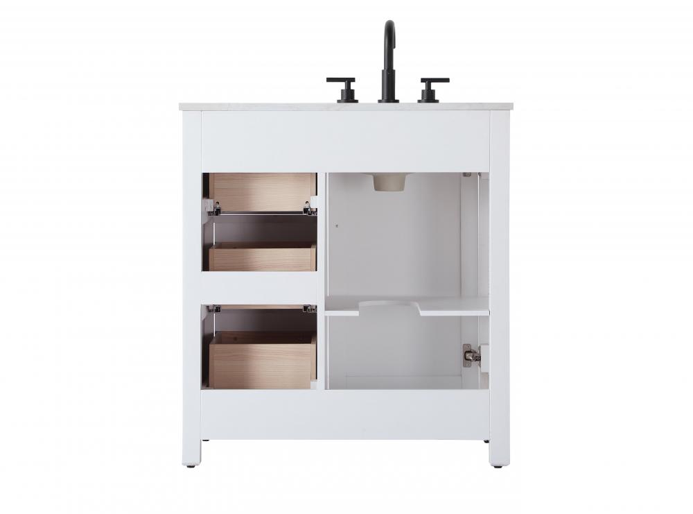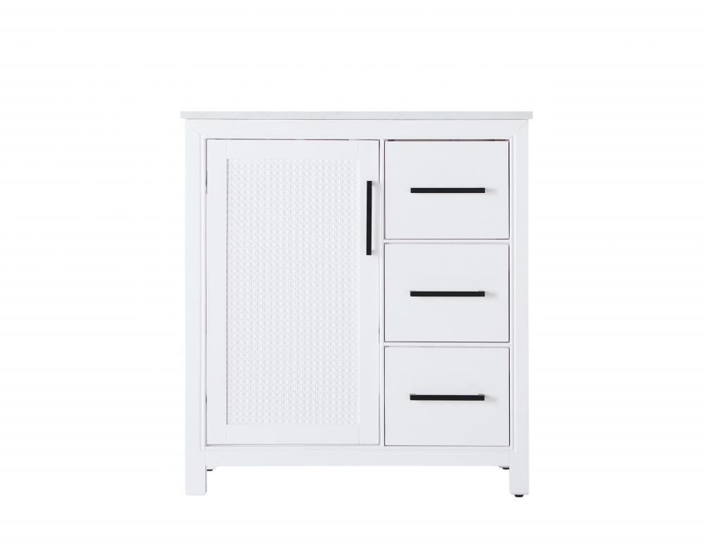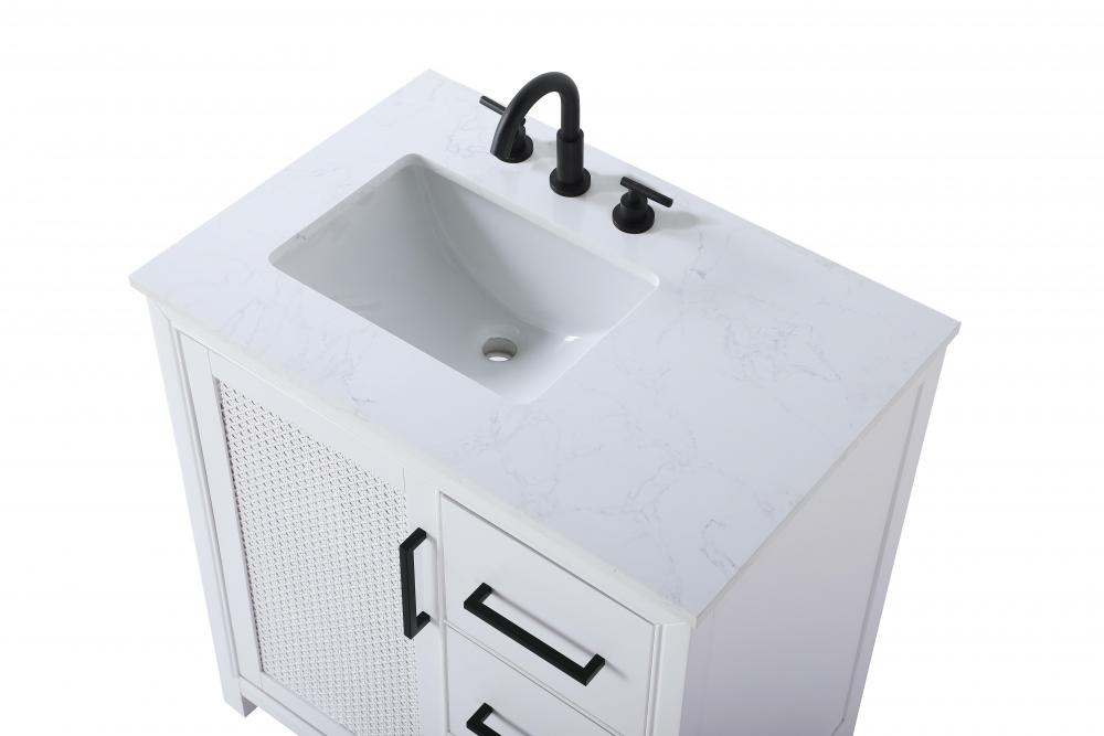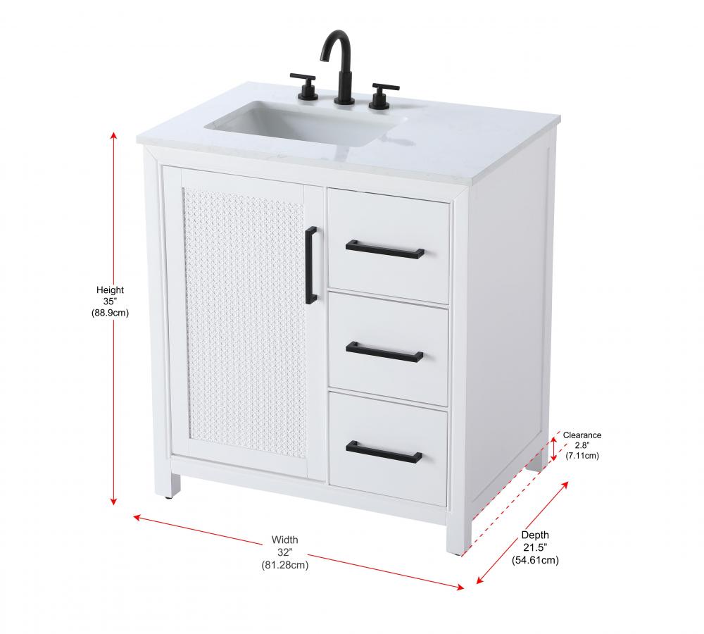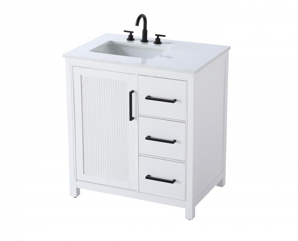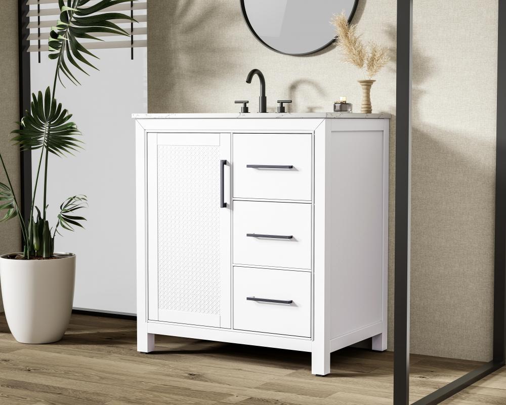 Perfect for those with an eye for detail and quality, this transitional vanity blends modern design with timeless elegance. Available in five stunning finishes, from Crisp White to Linen Oak, the wood grain visuals of the oak options bring warmth and character to any bathroom. The caning design on the Shaker-style door panels adds texture and a touch of refinement, while the soft-closing doors and drawers ensure smooth, quiet functionality. Topped with a white engineered marble countertop, the vanity offers both luxury and practicality, complete with pre-drilled faucet holes for customization. A concealed overflow and U-shaped shelf for plumbing make installation effortless, and the slender black metal pulls provide a sleek contrast.