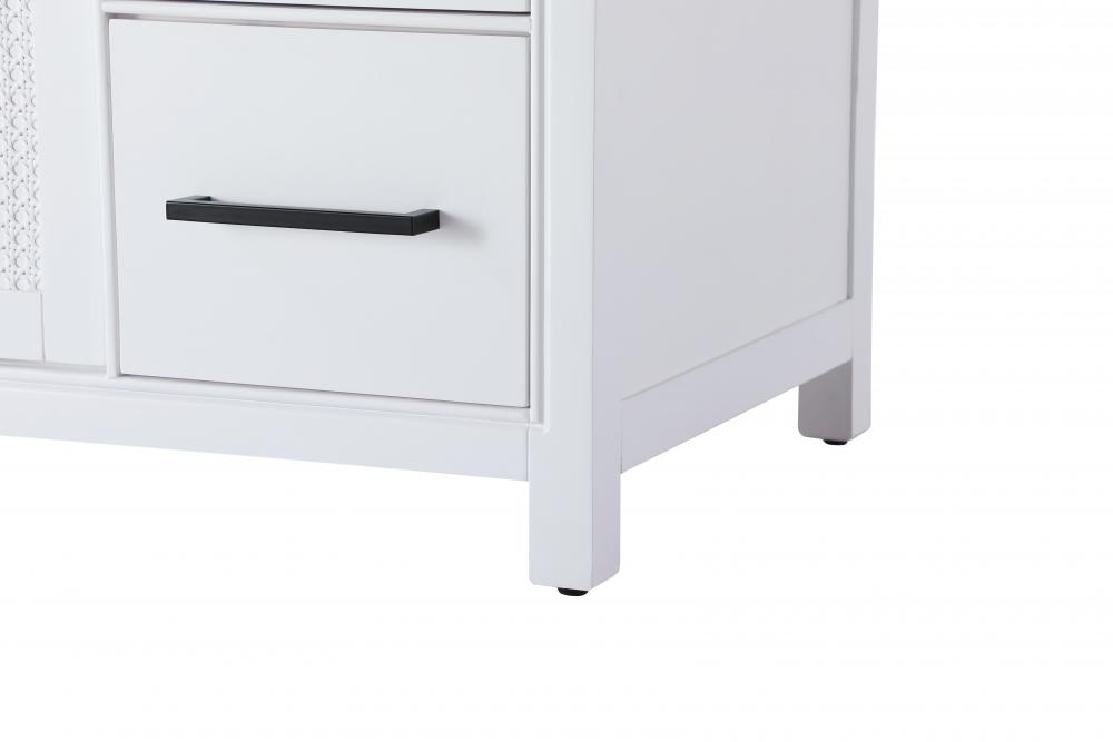 The slender black metal handle pulls on the doors and drawers offer a sleek, modern contrast to the white finish, adding to the vanity's sophisticated look.