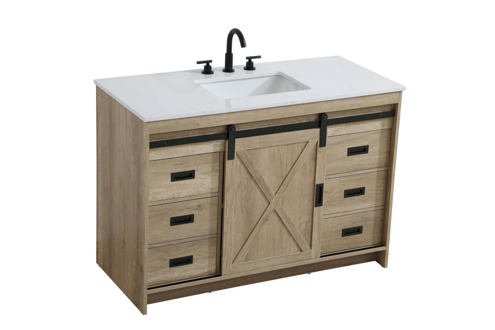 Transform your bathroom with this rustic barnyard-style vanity, designed to balance aesthetic appeal and functionality. Featuring a sliding barn door with black metal hardware and complementary handle pulls, this piece blends rugged charm with practical design. The engineered marble countertop displays unique marbling, while the porcelain undermount sink offers easy maintenance and durability. Available in Espresso, Natural Oak, and Rustic Grey finishes, this vanity suits a range of styles. It includes a deep storage drawer for larger items, a hidden shelf for towels or décor, and adjustable foot levelers for added stability on uneven floors. With pre-drilled faucet holes for easy setup, this vanity delivers style and substance to enhance your bathroom.
