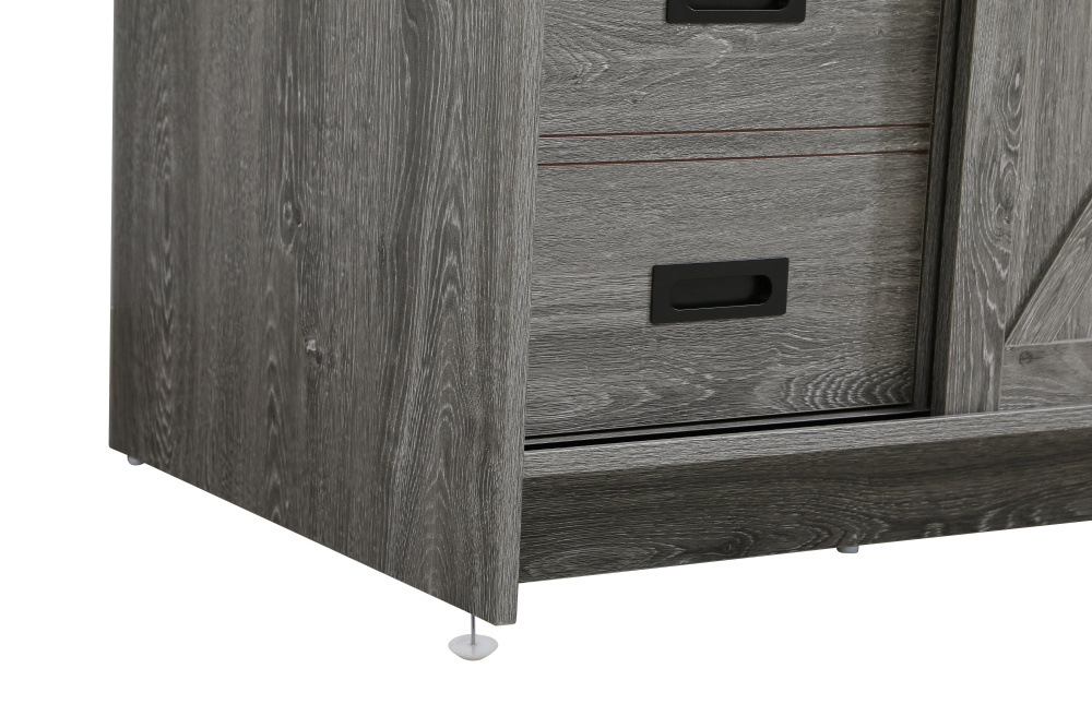 Features two unique sliding barn doors with black metal hardware for a farmhouse-inspired aesthetic