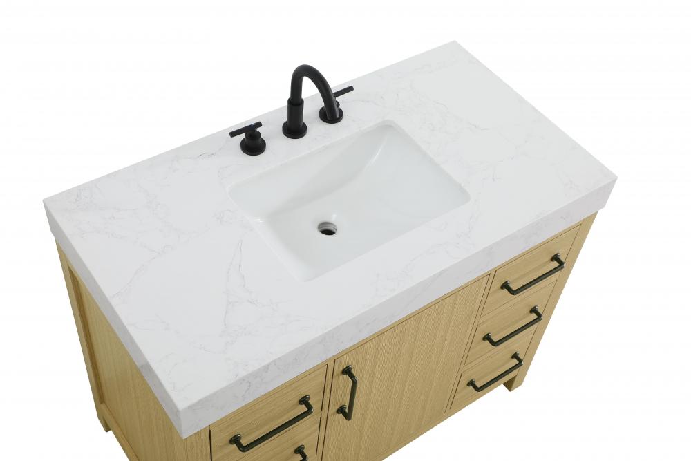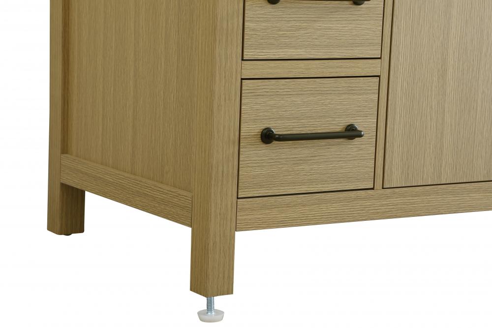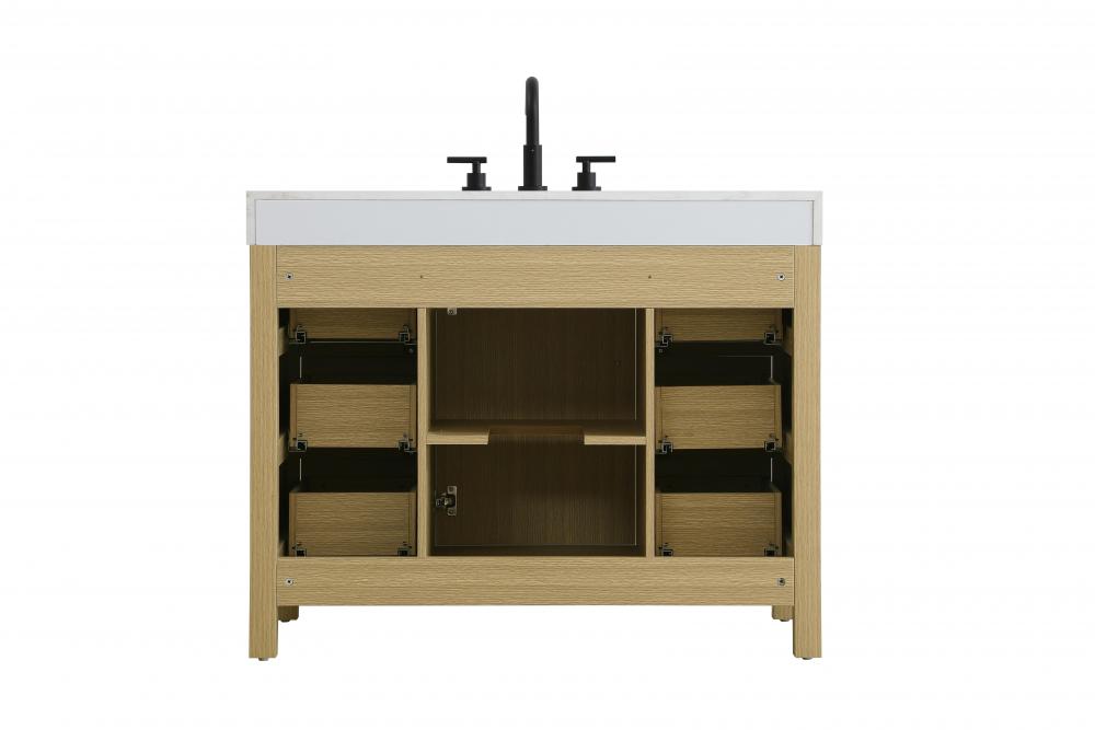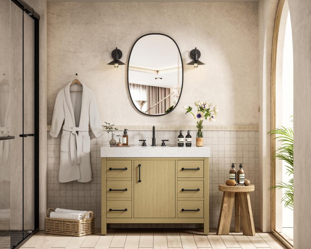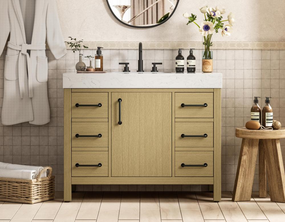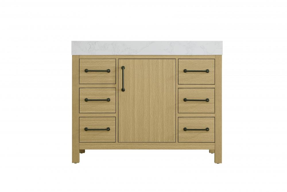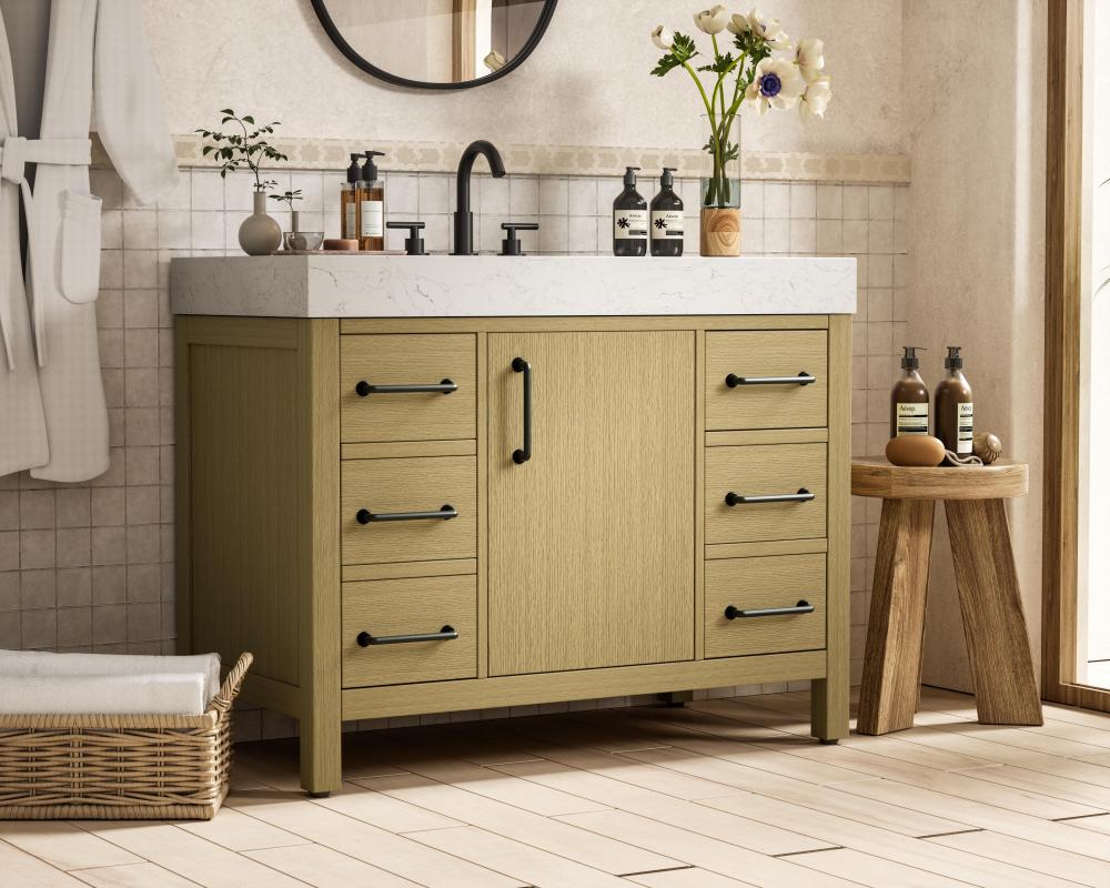 This bathroom vanity showcases a balanced blend of contemporary style and warm, natural-like elements, making it a versatile addition to various interior designs. The clean, straight edges and flat-panel doors lend a modern, streamlined look, while the soft, light wood finish highlights the faux grain pattern, adding warmth and a sense of organic texture to the piece. Its structured design, featuring symmetrical drawers on either side and a centered door, adds balance and organization to the overall aesthetic. Matte black hardware, including slim and cylindrical pulls, contrasts elegantly against the light wood, reinforcing its contemporary vibe while providing subtle visual interest. The thick engineered marble countertop in crisp white adds a sharp contrast to the light base, creating a visually dynamic combination that is both functional and stylish. This vanity is perfect for those seeking a design that combines modern simplicity with a touch of bold refinement. This vanity is delivered fully assembled and equipped with foot levelers for effortless installation and stability. Combining practicality and bold design, this vanity is UPC certified and ready to transform your bathroom space. Complete the setup with an optional matching backsplash, sold separately.