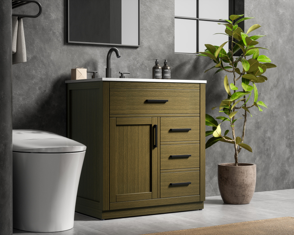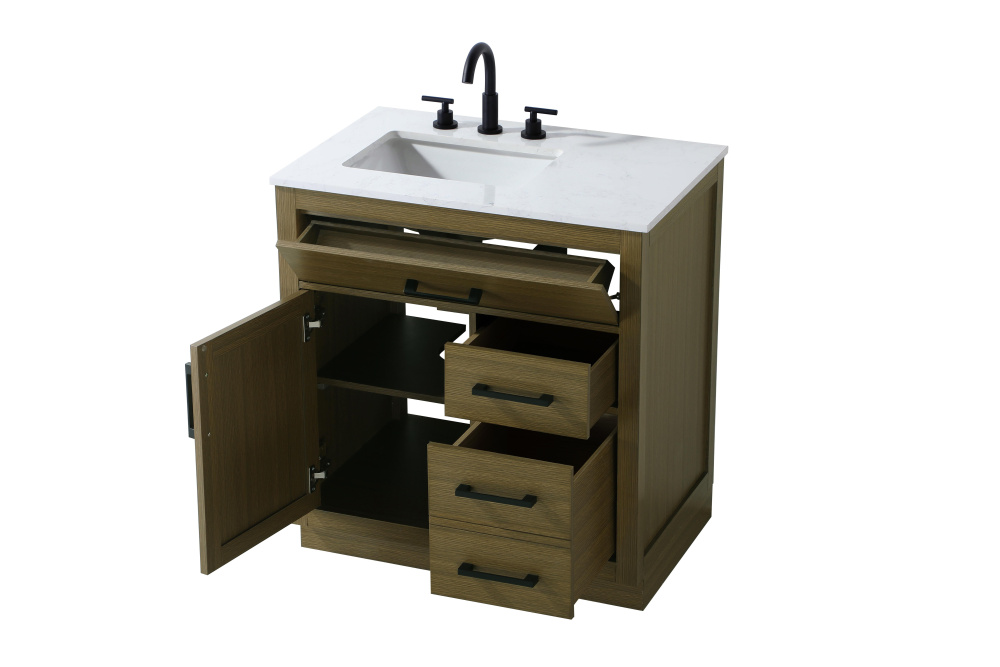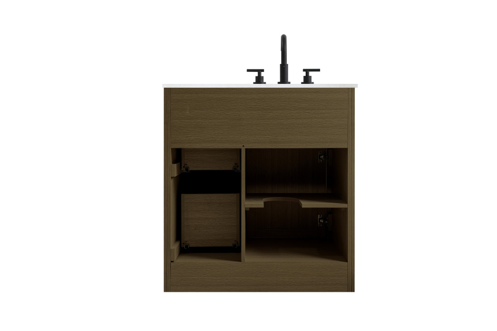 Introduce a perfect balance of functionality and style to your bathroom with this thoughtfully designed vanity. Constructed with a combination of solid wood and MDF, it offers durability and a sturdy build. The sleek engineered marble countertop with subtle grey marbling complements the rustic wood grain finish, creating a stylish and inviting centerpiece for your bathroom. Designed in a contemporary style with a transitional flair, it features a U-shaped shelf for seamless plumbing integration and multiple soft-close drawers for clutter-free organization. A pull-down drawer enhances convenience, while the toe kick adds a refined, clean-lined appearance and simplifies cleaning underneath. Matte black hardware contrasts beautifully with the cabinet finish, tying the look together. Delivered fully assembled and equipped with foot levelers, this vanity combines practicality and aesthetic appeal to suit modern and transitional bathrooms alike.