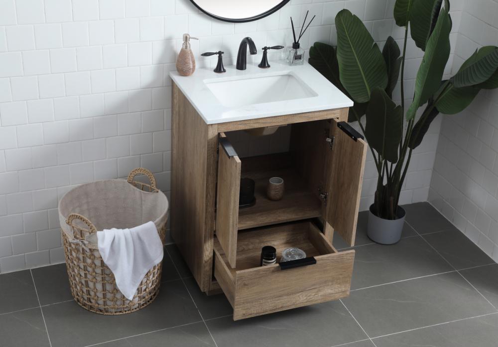 Compact yet impactful, our vanity, measuring 24 inches long, is designed to optimize space without compromising on style, making it the perfect addition for smaller bathrooms or as a stylish accent in any space.