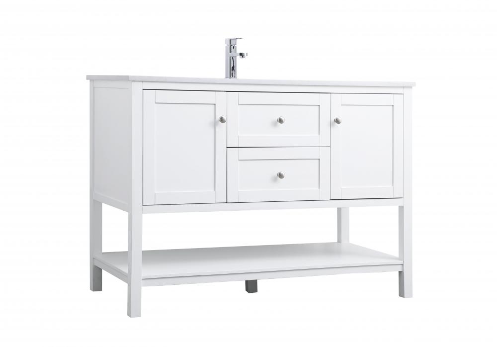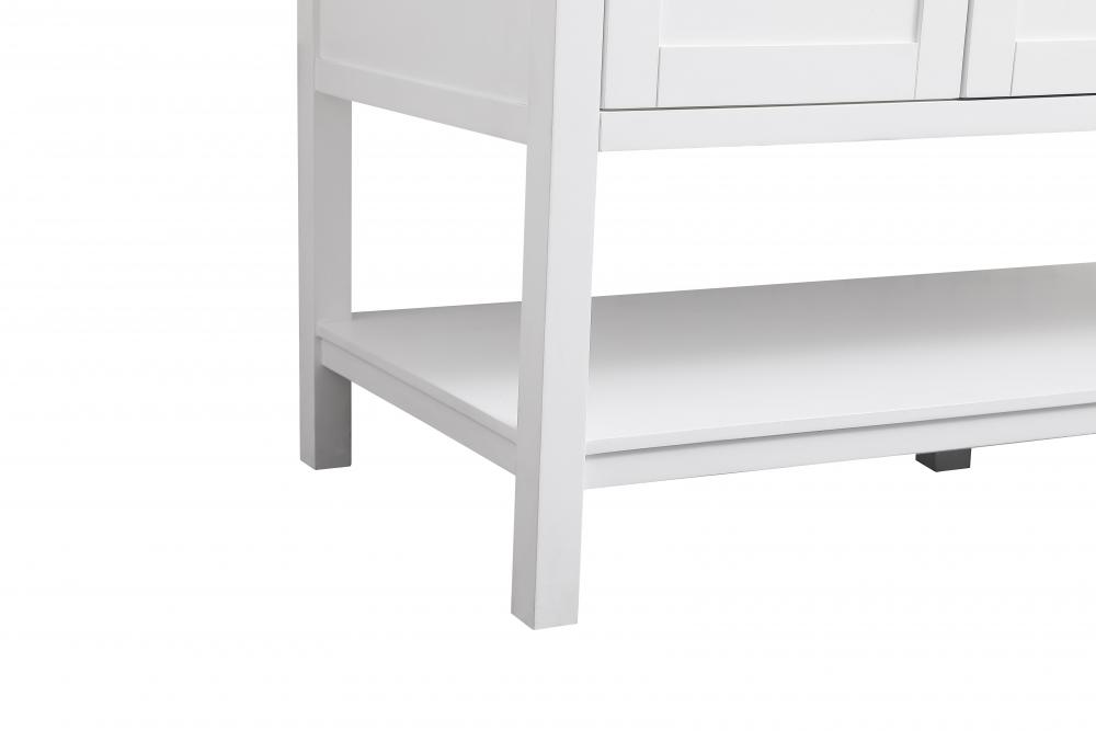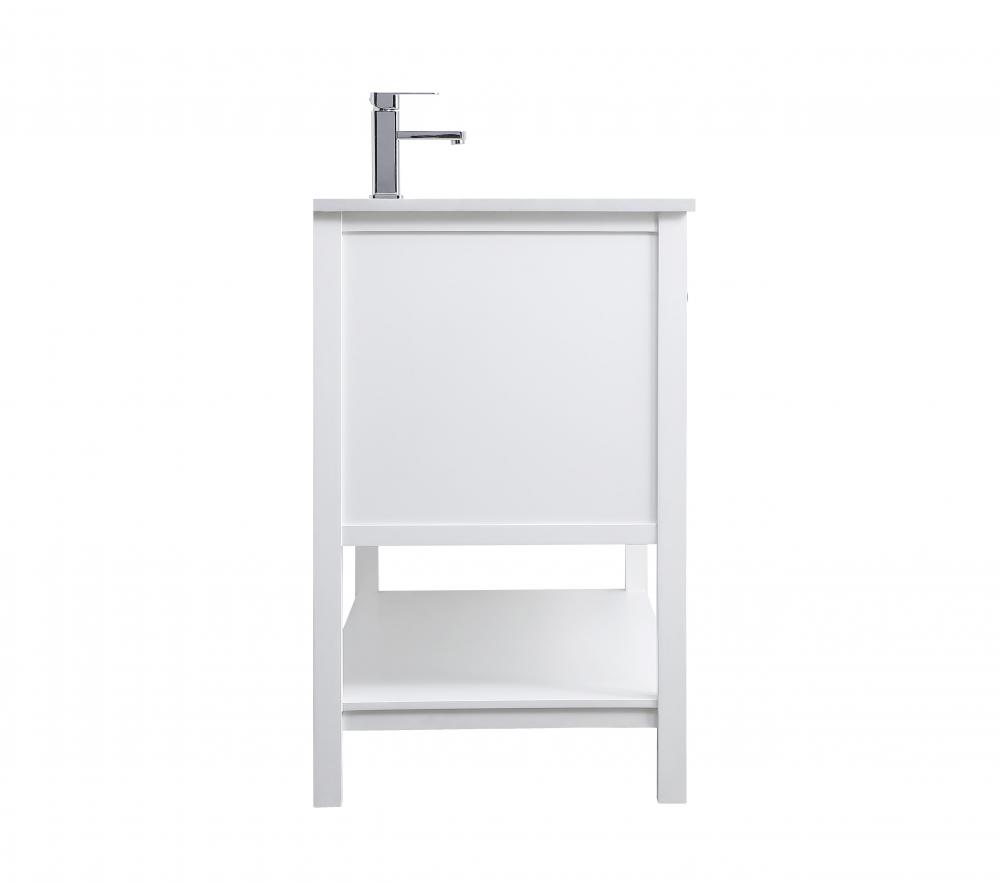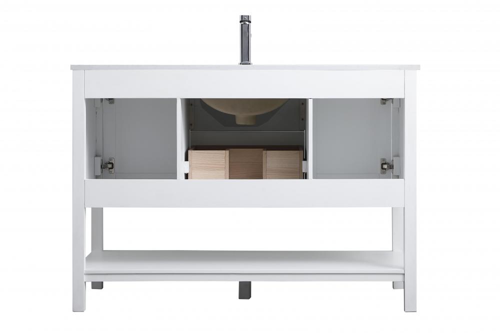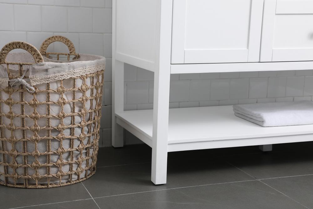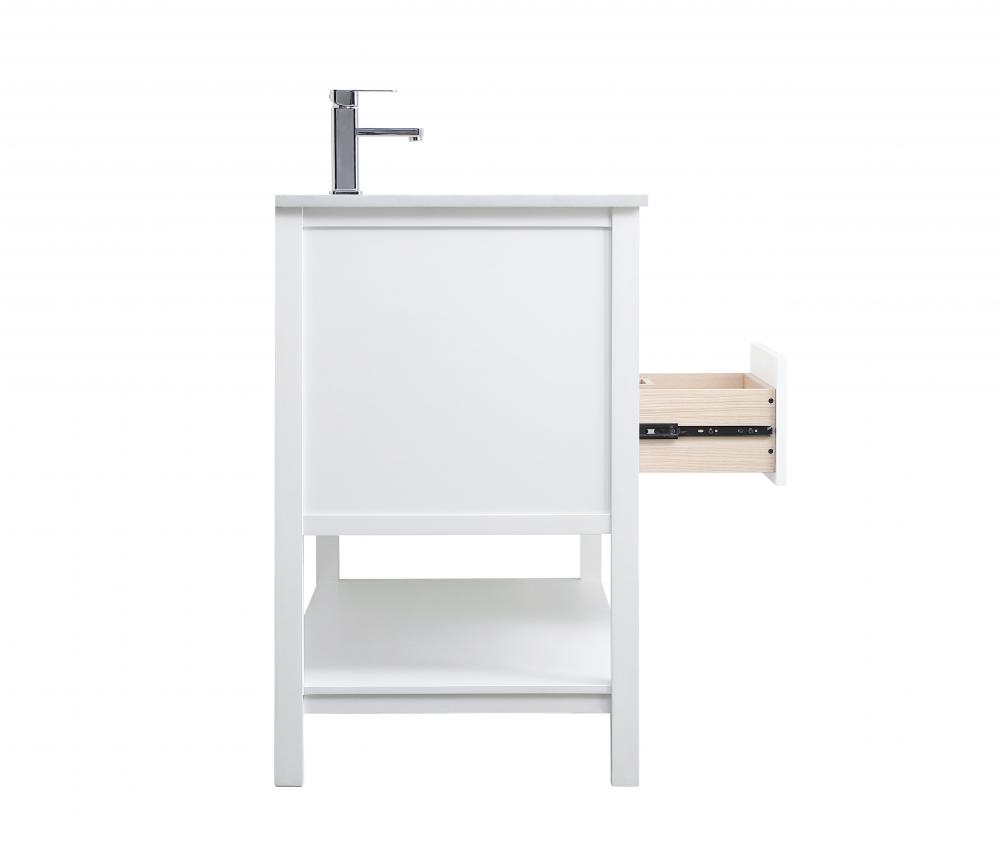 Boasting a lower open shelf for additional storage, this vanity offers a practical area to display decor or stow away essentials, seamlessly blending functionality with a touch of style for your bathroom.