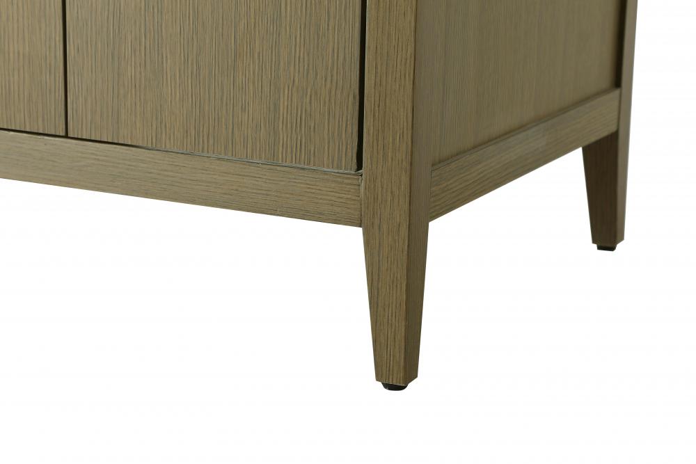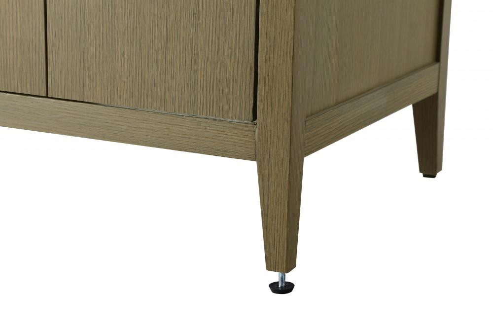 The vanity stands on tapered 5-inch solid wood legs with levelers for a balanced, polished look, combining modern style with practicality.