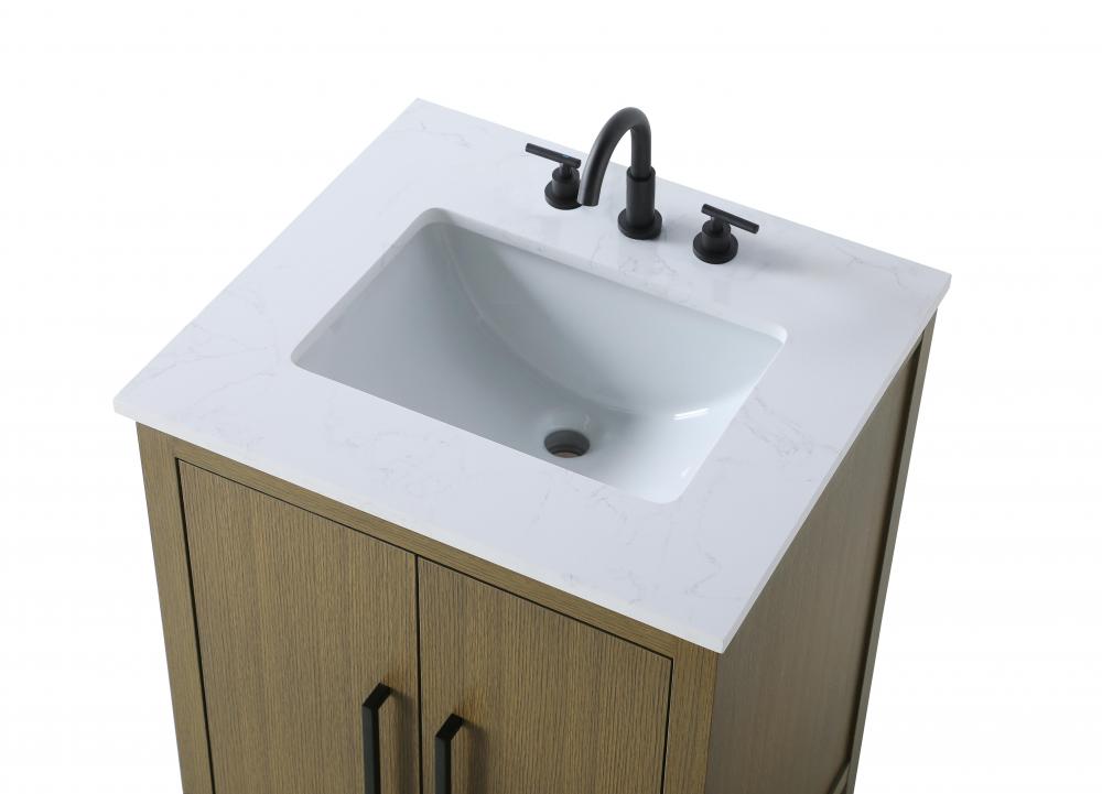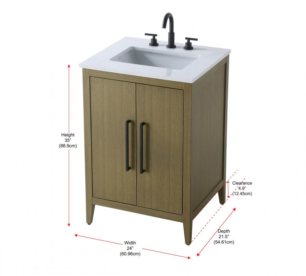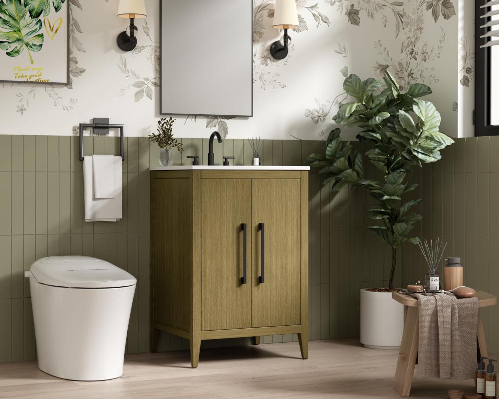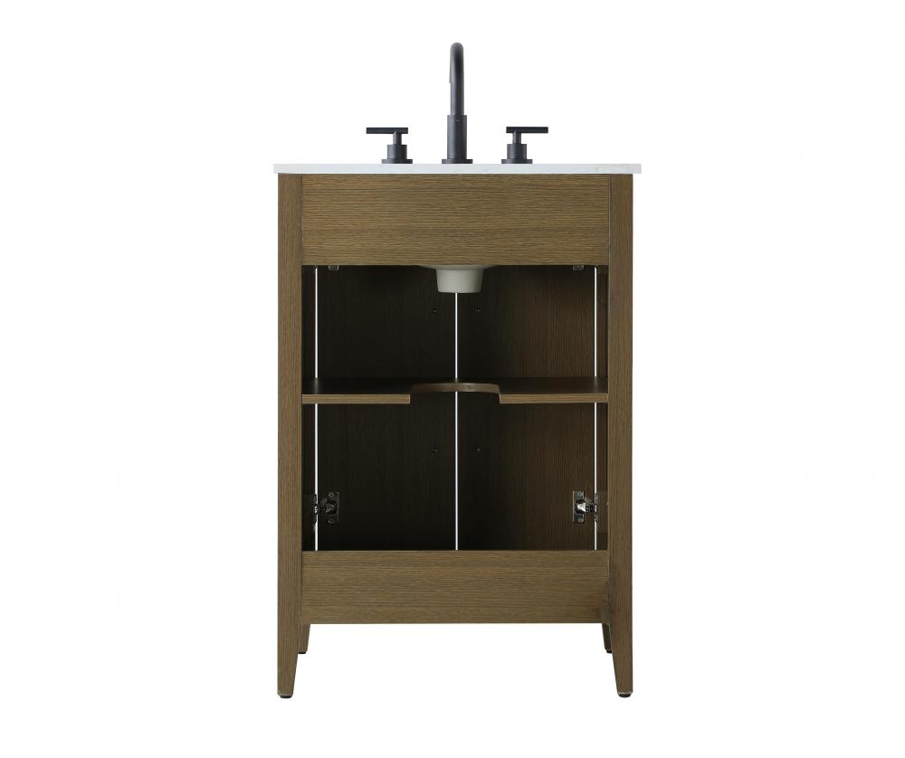 Bring both elegance and practicality to your bathroom with this transitional vanity, available in a selection of rich finishes that highlight the beauty of faux wood grain in shades of mocha, chestnut, and honey, along with classic white and modern grey. The flat door panels and sleek black metal pulls create a minimalist yet refined aesthetic, while the soft-closing drawers and tapered legs with levelers provide smooth, functional operation. Topped with a luxurious white engineered marble countertop and featuring a porcelain sink, this vanity combines timeless style with modern efficiency. Thoughtfully designed with U-shaped cutout for plumbing, it offers ample storage and easy installation, making it the perfect centerpiece for any bathroom.