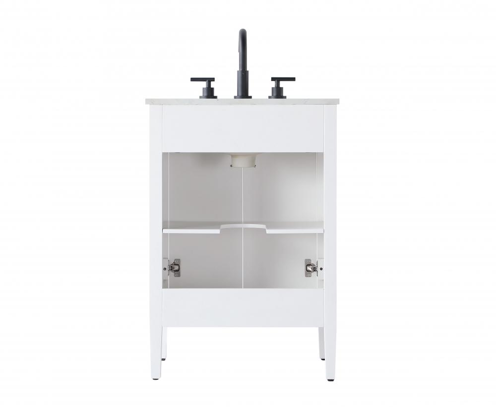 The vanity is topped with a stunning white engineered marble countertop with natural veining that adds luxurious detail and durability.