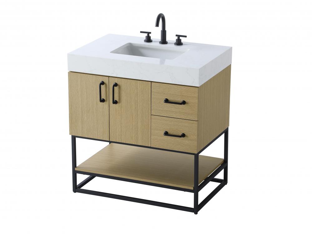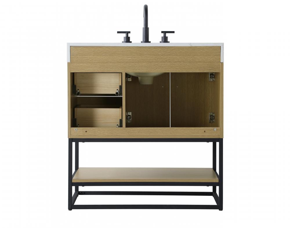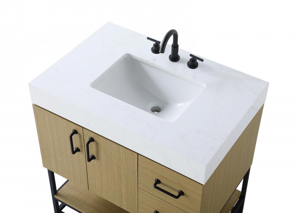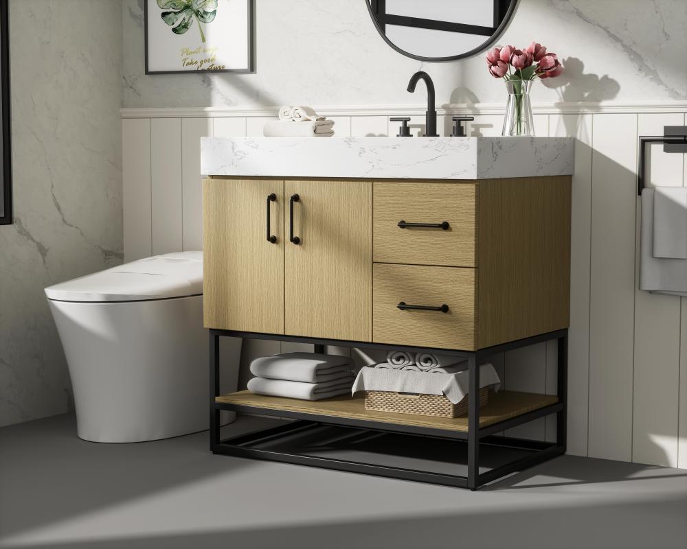 Upgrade your bathroom with this stylish transitional vanity, available in five stunning finishes, from crisp white to warm honey brown, designed to suit a variety of decor styles. The minimalist flat door panels and open wood shelf create a functional yet visually appealing storage solution, while the slender black metal legs elevate the look with modern sophistication. The 4-inch thick white engineered marble countertop, accented with natural veining, adds a luxurious touch, perfectly complemented by soft-closing doors with sleek black metal bar pulls. Thoughtful details like the concealed overflow, back panel cutout for plumbing, and 3 pre-drilled holes for an 8-inch faucet make installation easy and efficient. with a porcelain sink and farmhouse-inspired touches, this vanity brings both elegance and practicality to any bathroom setting.