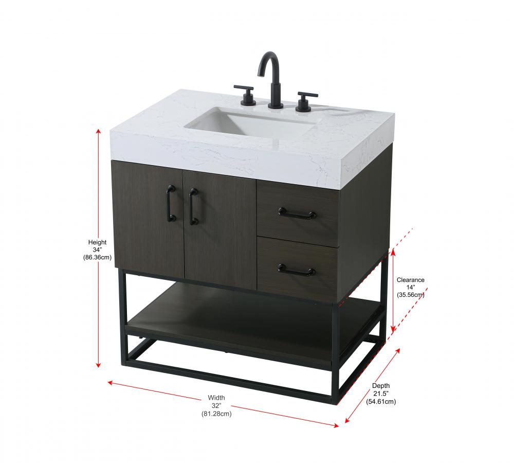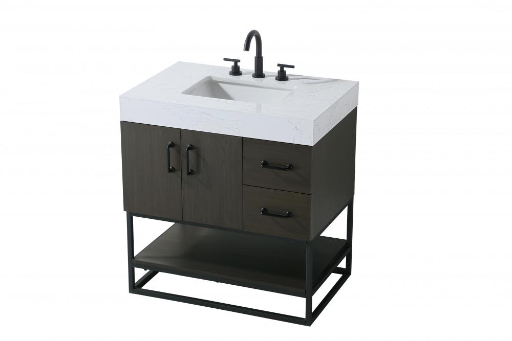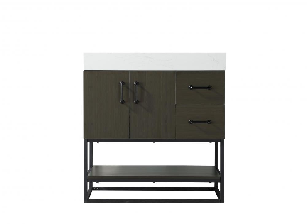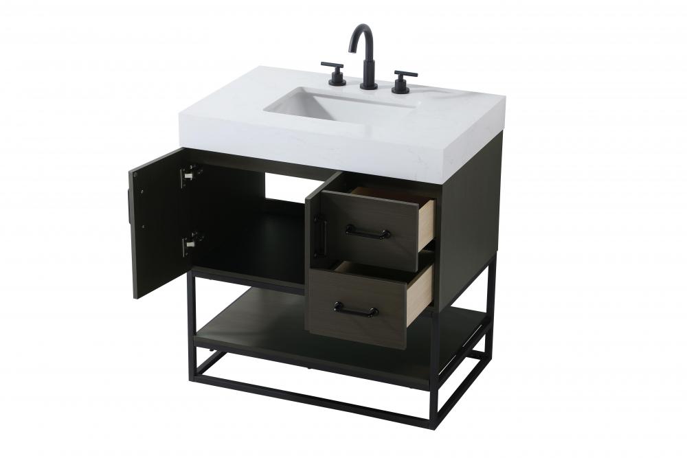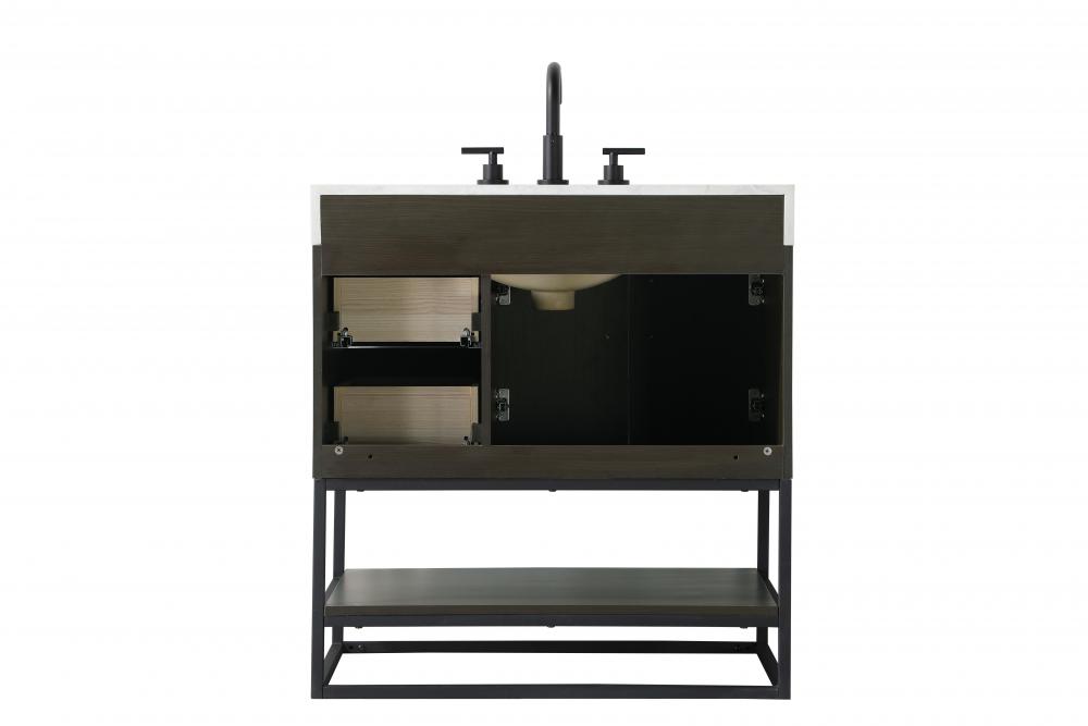 Upgrade your bathroom with this stylish transitional vanity, available in five stunning finishes, from crisp white to warm honey brown, designed to suit a variety of decor styles. The minimalist flat door panels and open wood shelf create a functional yet visually appealing storage solution, while the slender black metal legs elevate the look with modern sophistication. The 4-inch thick white engineered marble countertop, accented with natural veining, adds a luxurious touch, perfectly complemented by soft-closing doors with sleek black metal bar pulls. Thoughtful details like the concealed overflow, back panel cutout for plumbing, and 3 pre-drilled holes for an 8-inch faucet make installation easy and efficient. with a porcelain sink and farmhouse-inspired touches, this vanity brings both elegance and practicality to any bathroom setting.