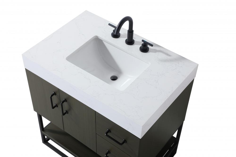 Topped with a thick, 4-inch white engineered marble countertop featuring natural veining, this vanity combines luxurious aesthetics with durability.