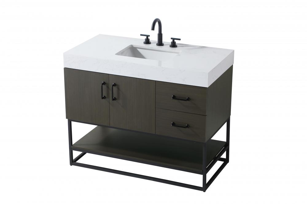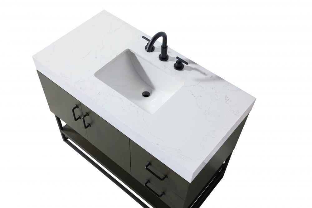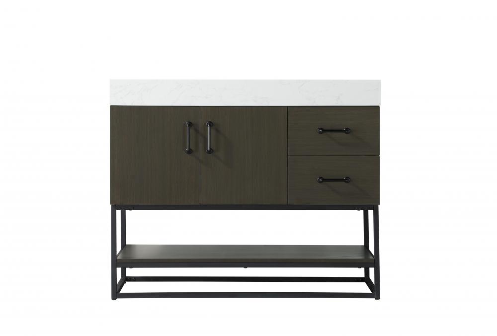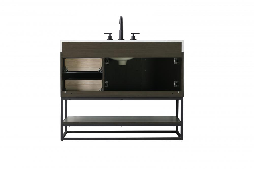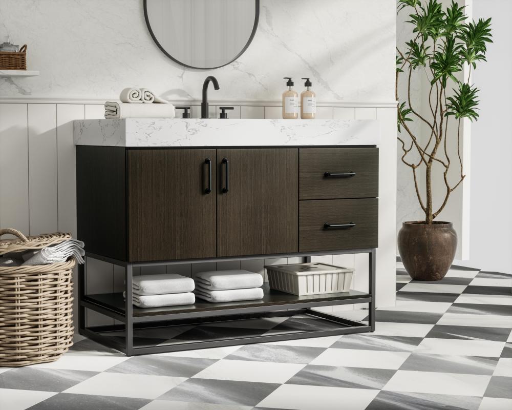 Upgrade your bathroom with this stylish transitional vanity, available in five stunning finishes, from crisp white to warm honey brown, designed to suit a variety of decor styles. The minimalist flat door panels and open wood shelf create a functional yet visually appealing storage solution, while the slender black metal legs elevate the look with modern sophistication. The 4-inch thick white engineered marble countertop, accented with natural veining, adds a luxurious touch, perfectly complemented by soft-closing doors with sleek black metal bar pulls. Thoughtful details like the concealed overflow, back panel cutout for plumbing, and 3 pre-drilled holes for an 8-inch faucet make installation easy and efficient. with a porcelain sink and farmhouse-inspired touches, this vanity brings both elegance and practicality to any bathroom setting.