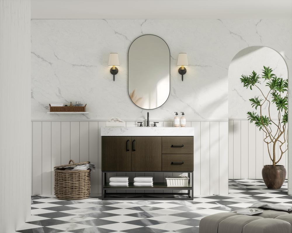 This transitional bathroom vanity is available in five curated finishes to suit any style: Crisp White for timeless elegance, Sleek Grey for a modern touch, Mocha Brown for a rich, luxurious feel.