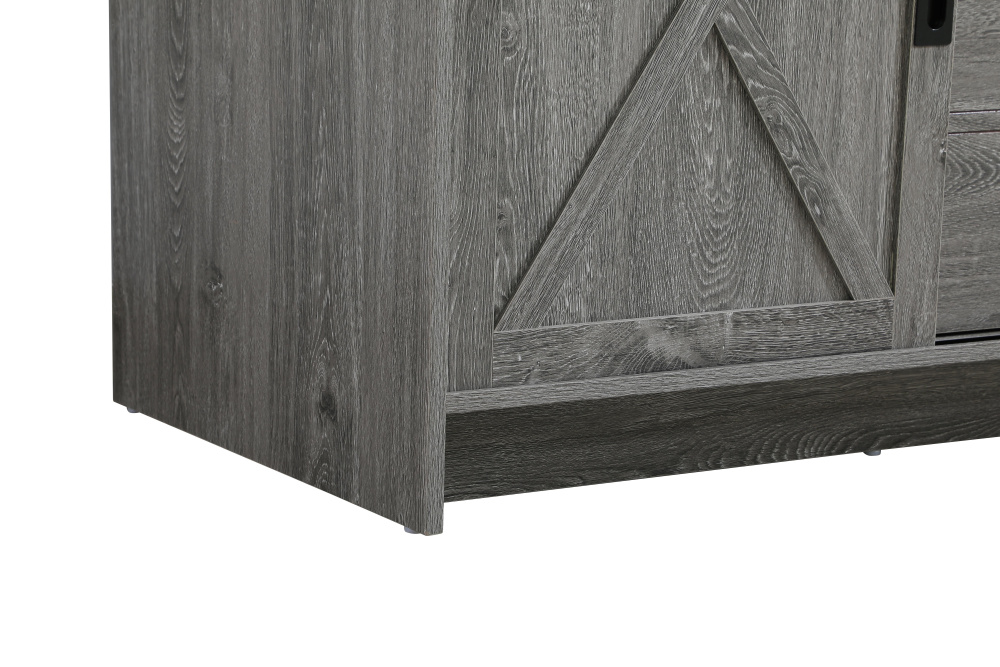 Features two unique sliding barn doors with black metal hardware for a farmhouse-inspired aesthetic