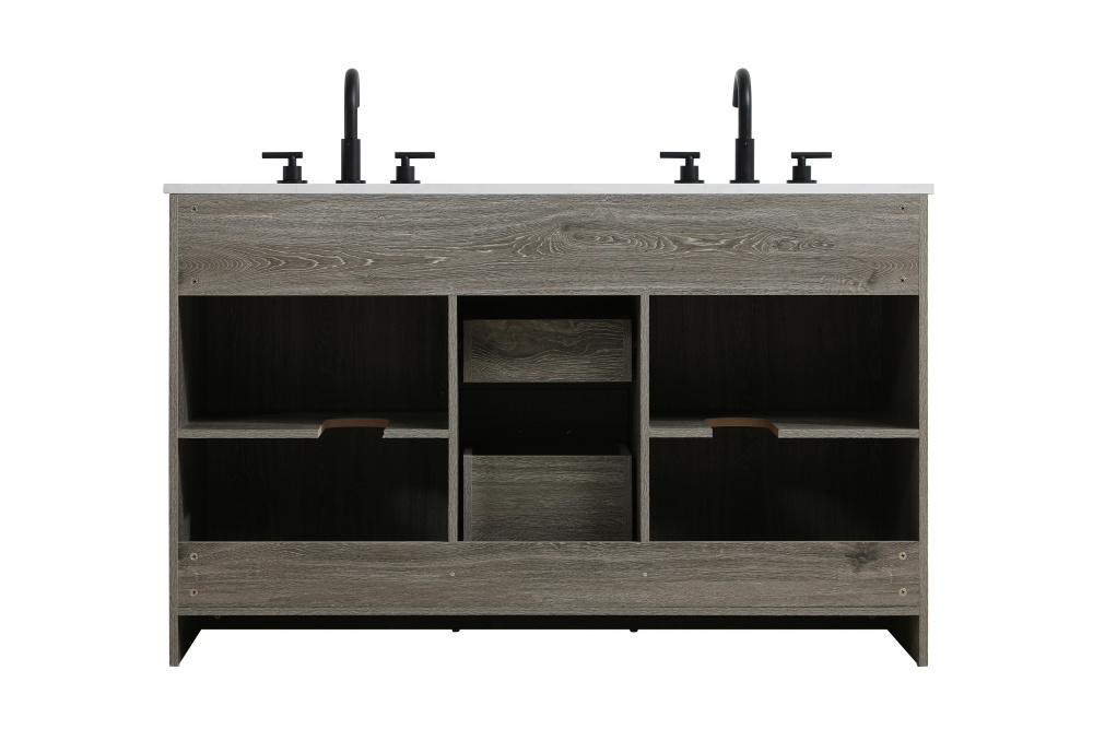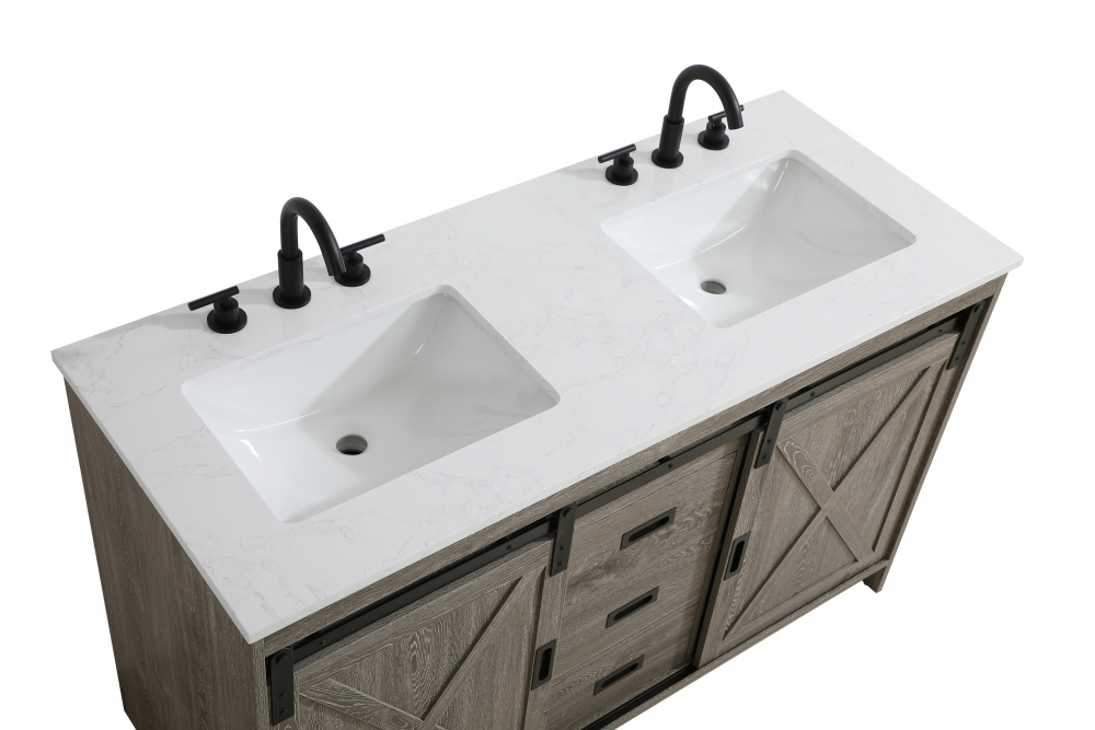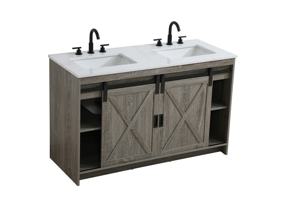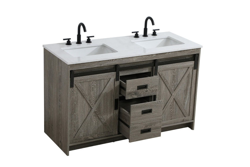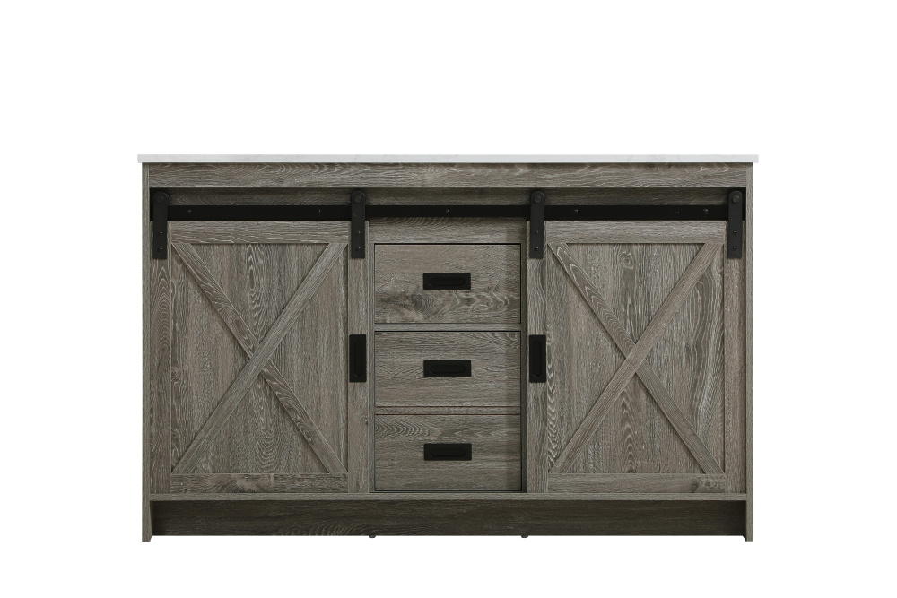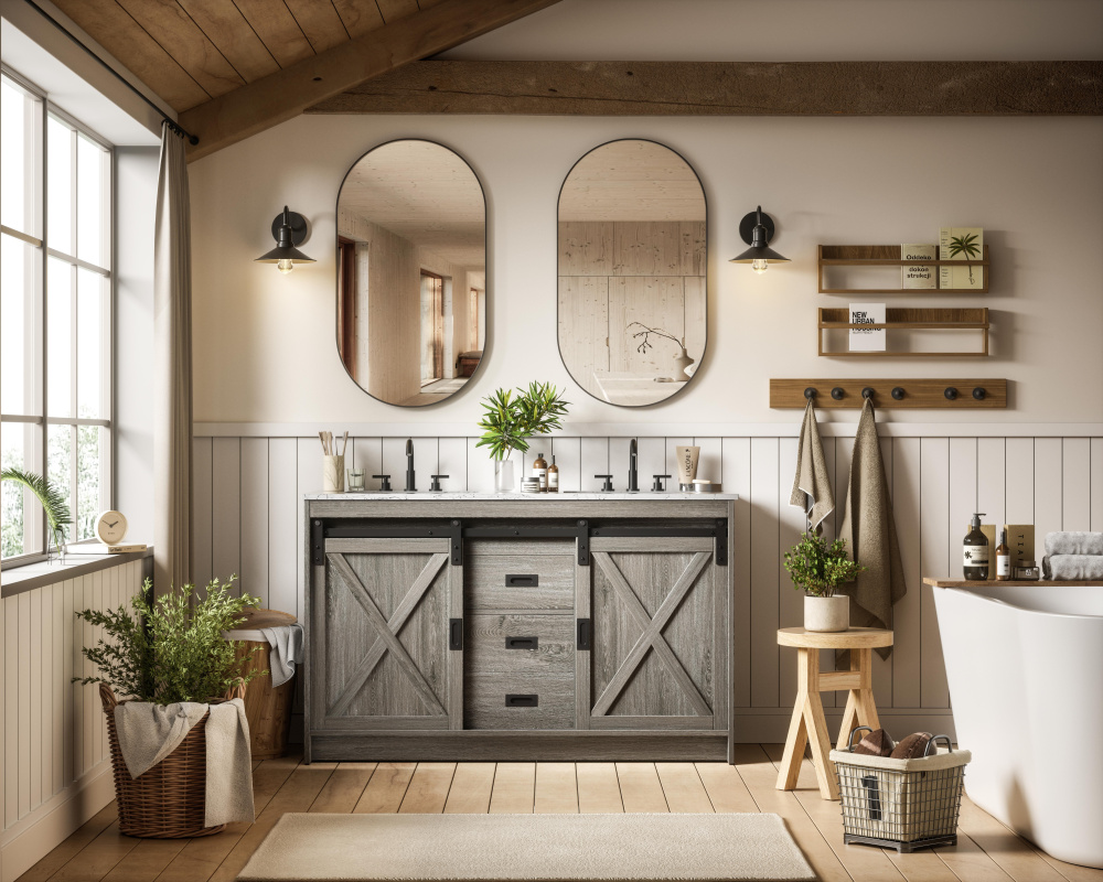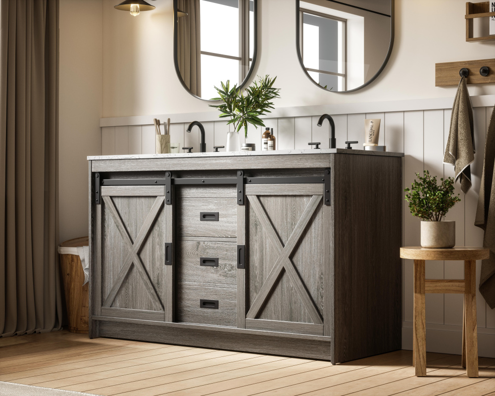 Transform your bathroom with this rustic barnyard-style vanity, designed to balance aesthetic appeal and functionality. Featuring a sliding barn door with black metal hardware and complementary handle pulls, this piece blends rugged charm with practical design. The engineered marble countertop displays unique marbling, while the porcelain undermount sink offers easy maintenance and durability. Available in Espresso, Natural Oak, and Rustic Grey finishes, this vanity suits a range of styles. It includes a deep storage drawer for larger items, a hidden shelf for towels or décor, and adjustable foot levelers for added stability on uneven floors. With pre-drilled faucet holes for easy setup, this vanity delivers style and substance to enhance your bathroom.