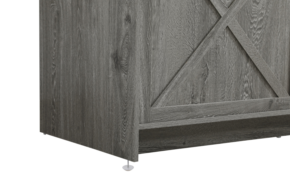 Features two unique sliding barn doors with black metal hardware for a farmhouse-inspired aesthetic