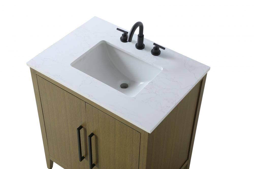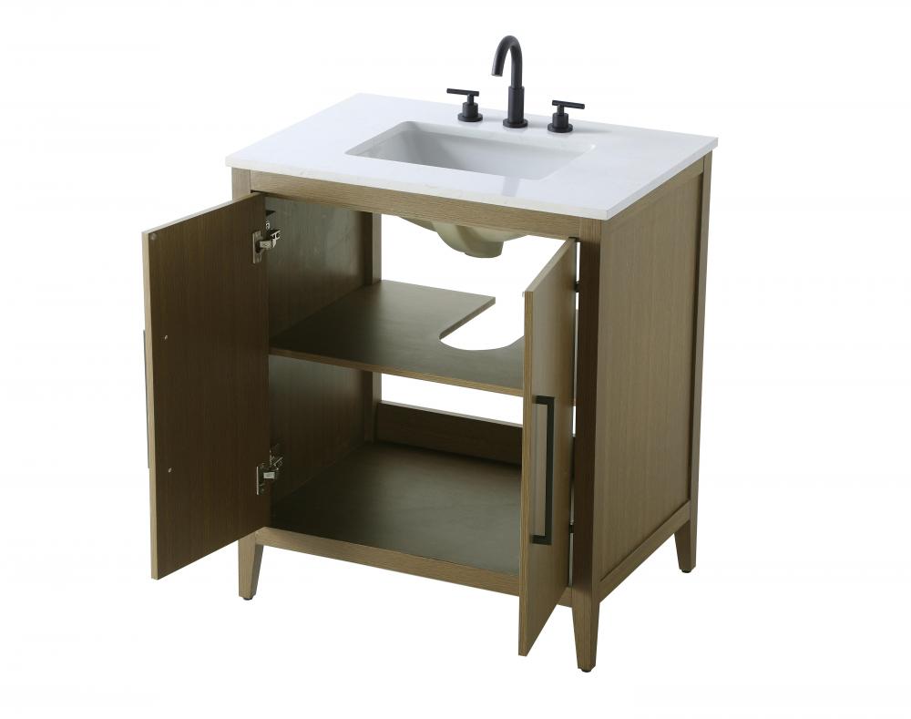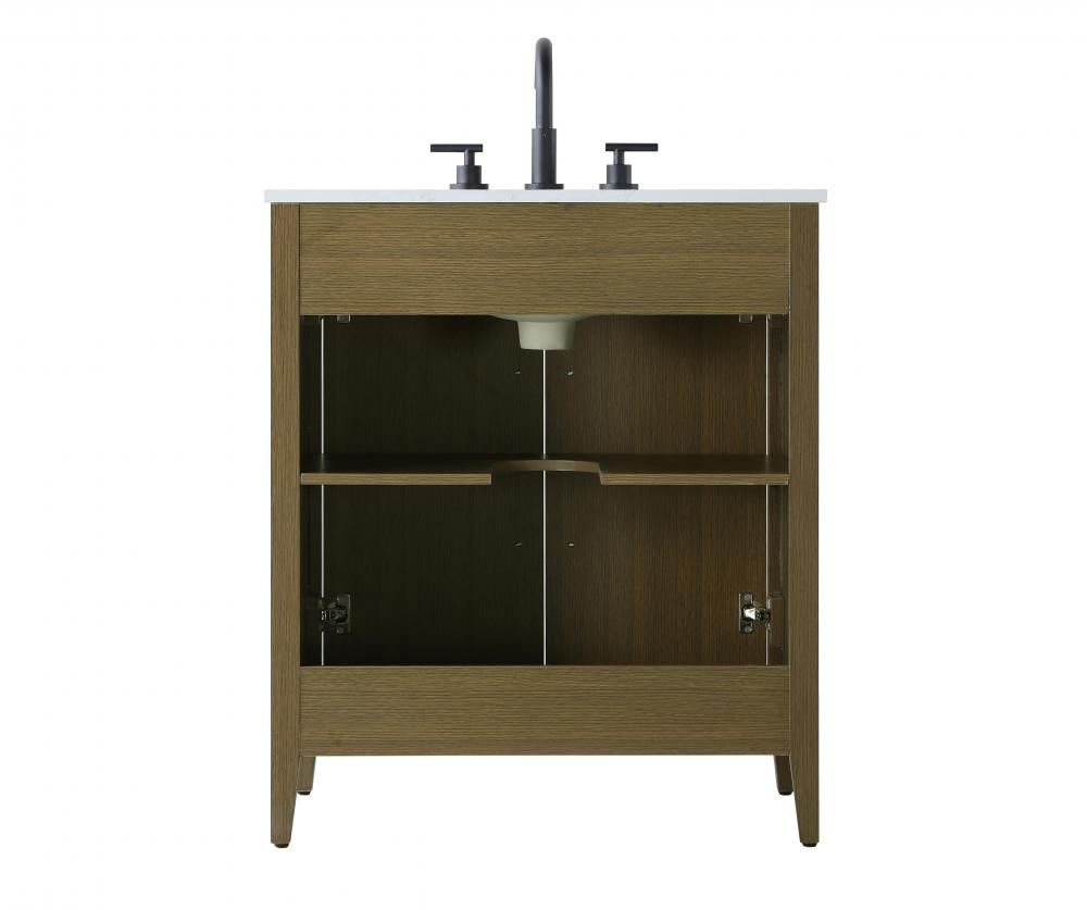 Bring both elegance and practicality to your bathroom with this transitional vanity, available in a selection of rich finishes that highlight the beauty of faux wood grain in shades of mocha, chestnut, and honey, along with classic white and modern grey. The flat door panels and sleek black metal pulls create a minimalist yet refined aesthetic, while the soft-closing drawers and tapered legs with levelers provide smooth, functional operation. Topped with a luxurious white engineered marble countertop and featuring a porcelain sink, this vanity combines timeless style with modern efficiency. Thoughtfully designed with U-shaped cutout for plumbing, it offers ample storage and easy installation, making it the perfect centerpiece for any bathroom.
