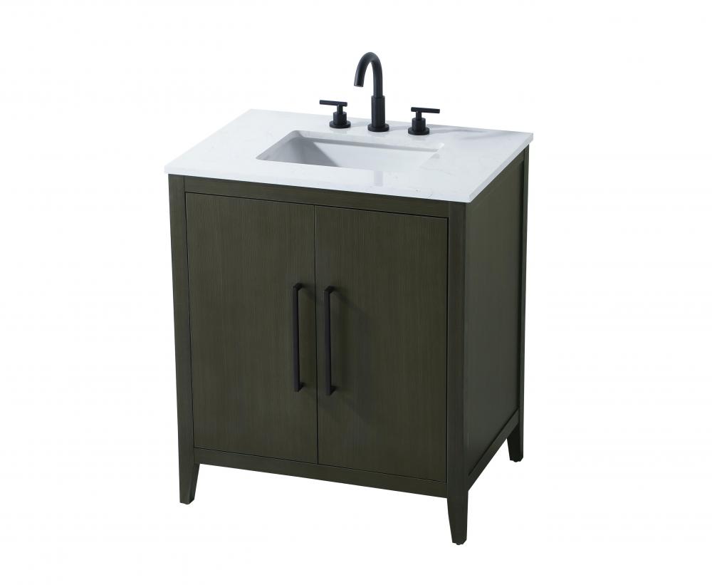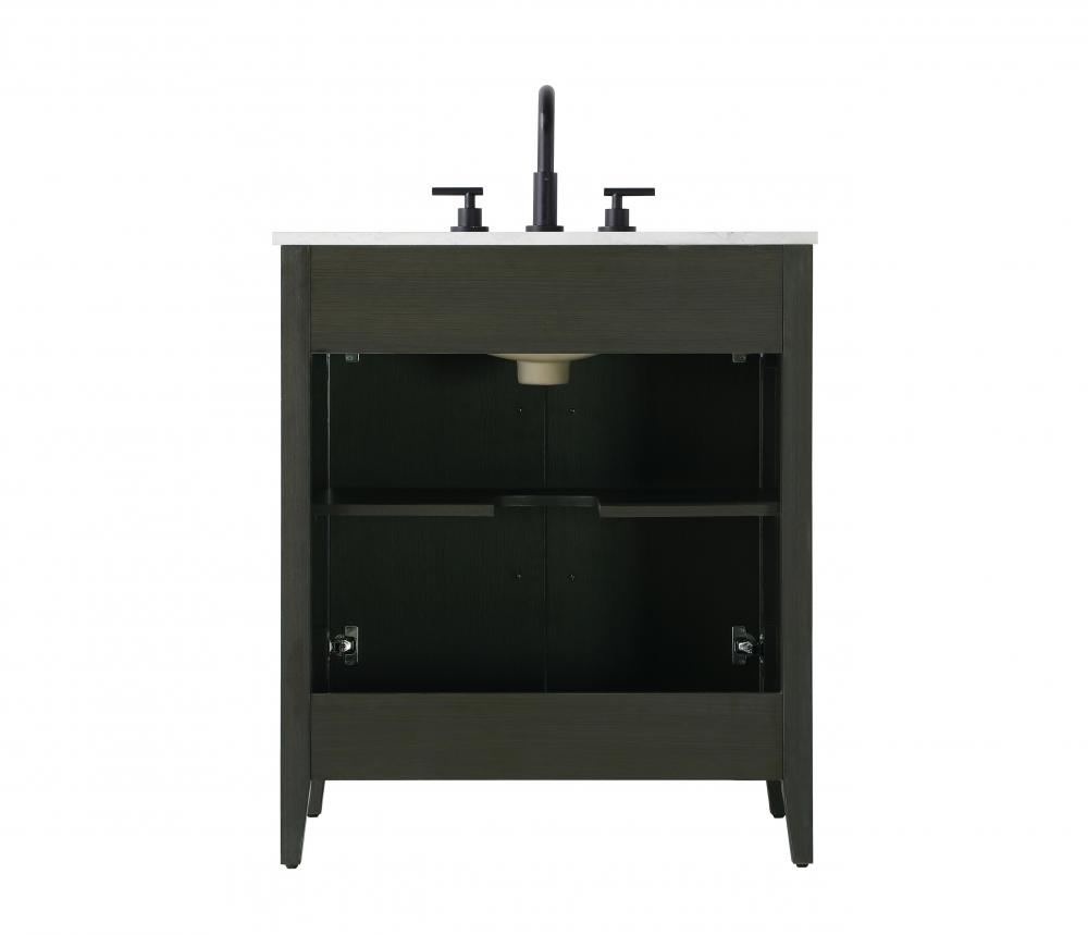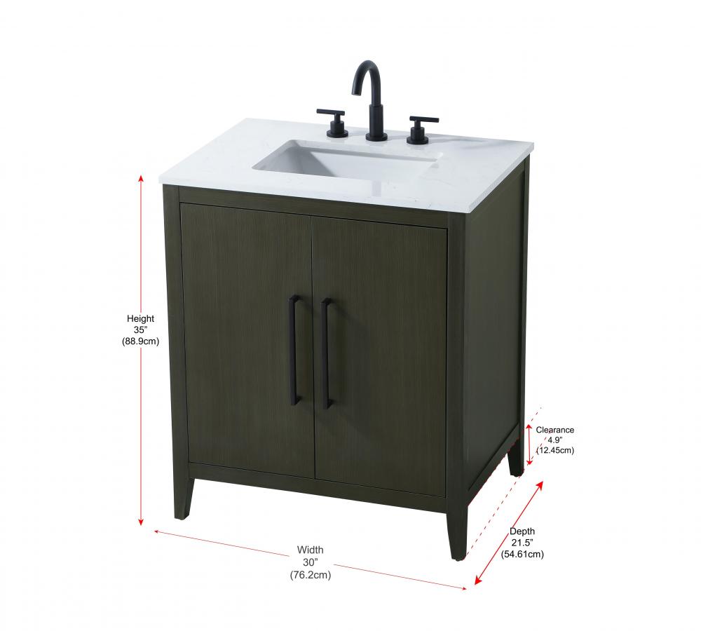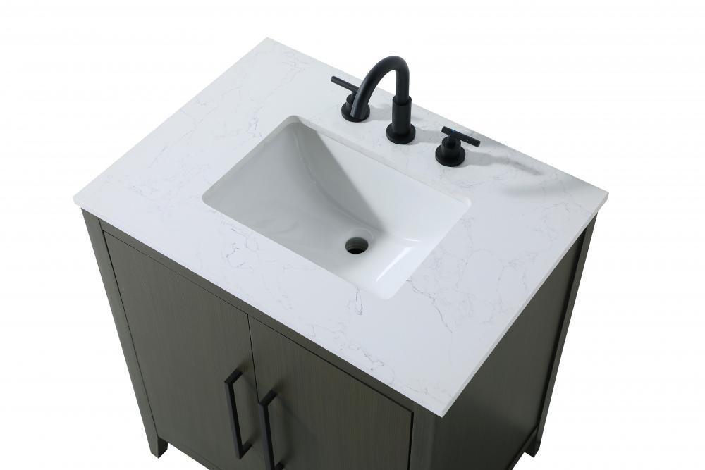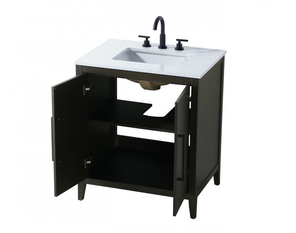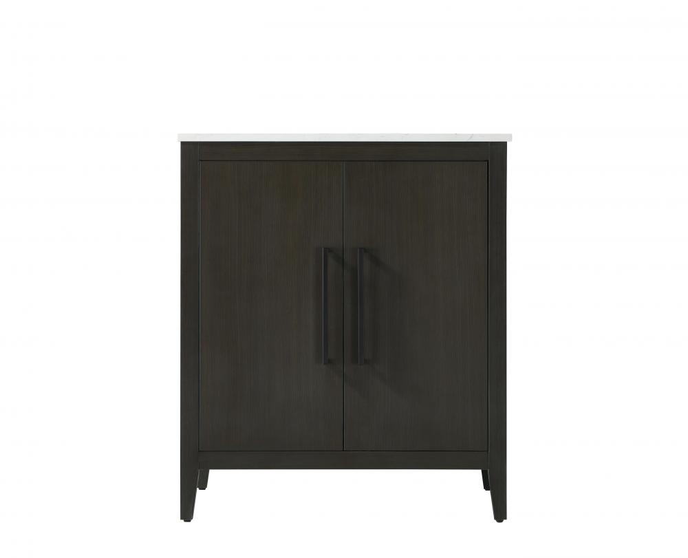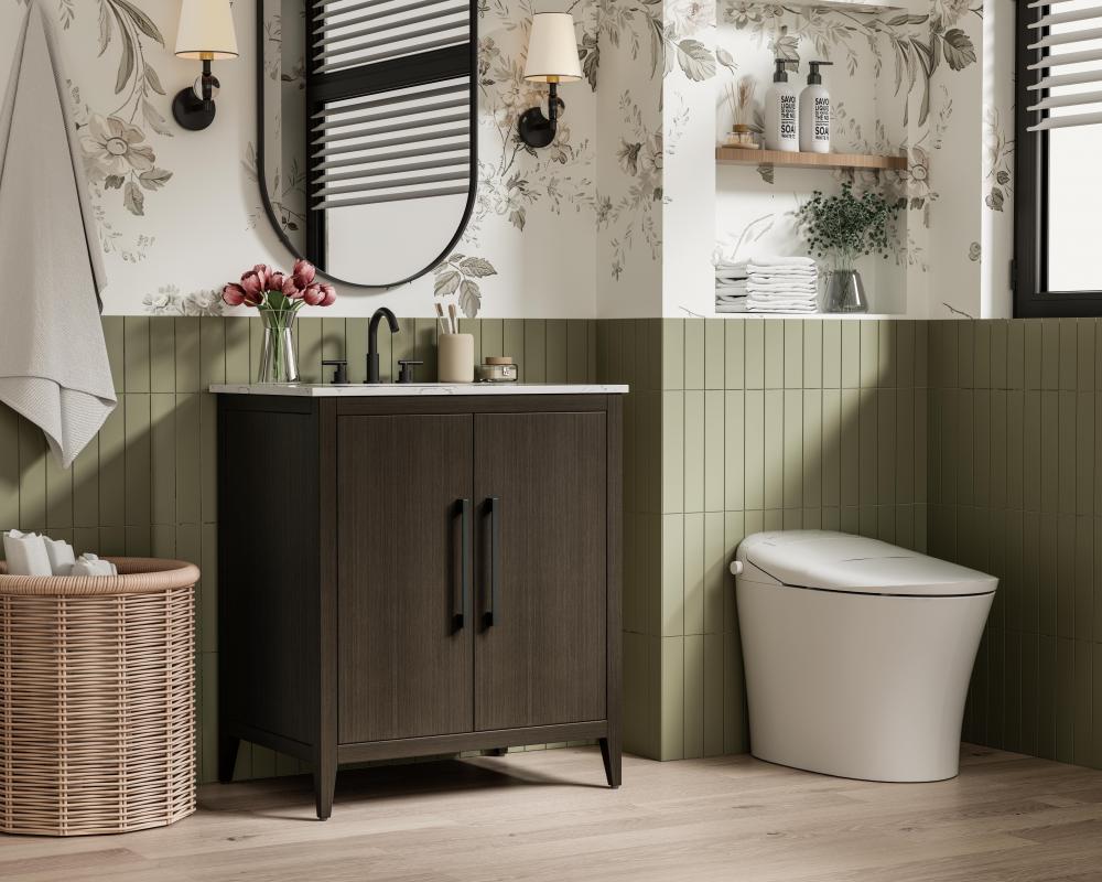 Bring both elegance and practicality to your bathroom with this transitional vanity, available in a selection of rich finishes that highlight the beauty of faux wood grain in shades of mocha, chestnut, and honey, along with classic white and modern grey. The flat door panels and sleek black metal pulls create a minimalist yet refined aesthetic, while the soft-closing drawers and tapered legs with levelers provide smooth, functional operation. Topped with a luxurious white engineered marble countertop and featuring a porcelain sink, this vanity combines timeless style with modern efficiency. Thoughtfully designed with U-shaped cutout for plumbing, it offers ample storage and easy installation, making it the perfect centerpiece for any bathroom.
