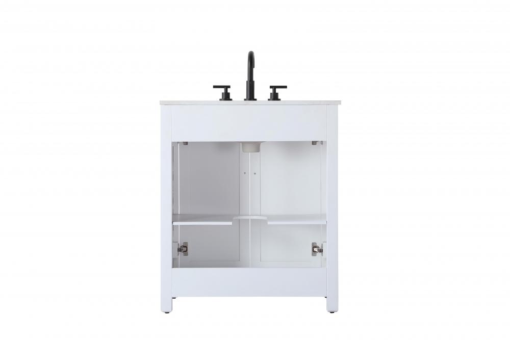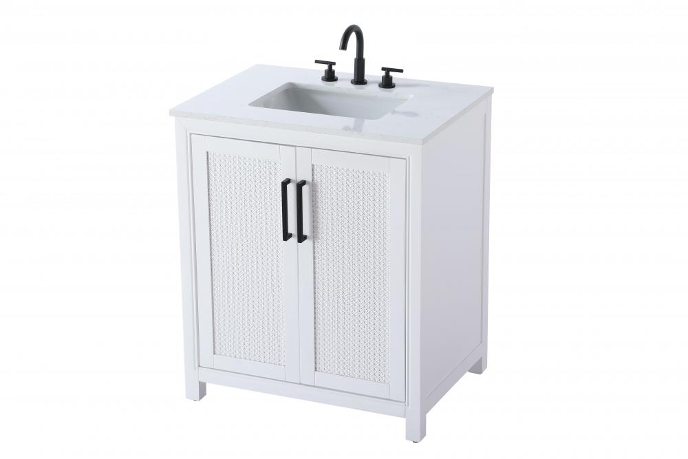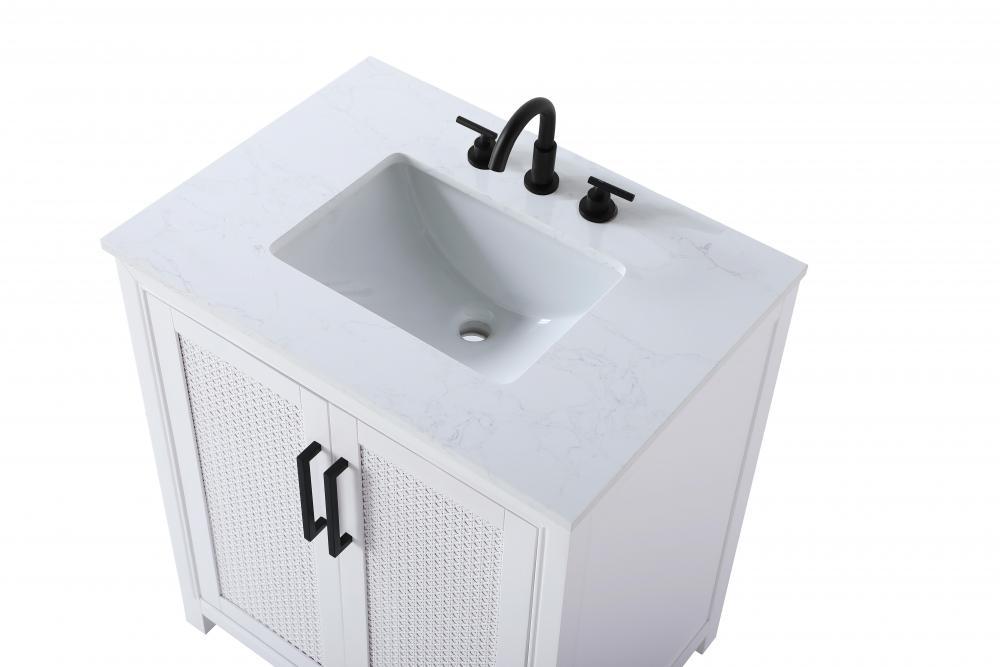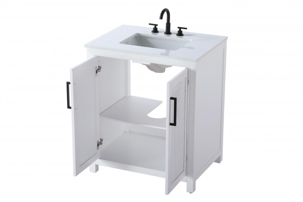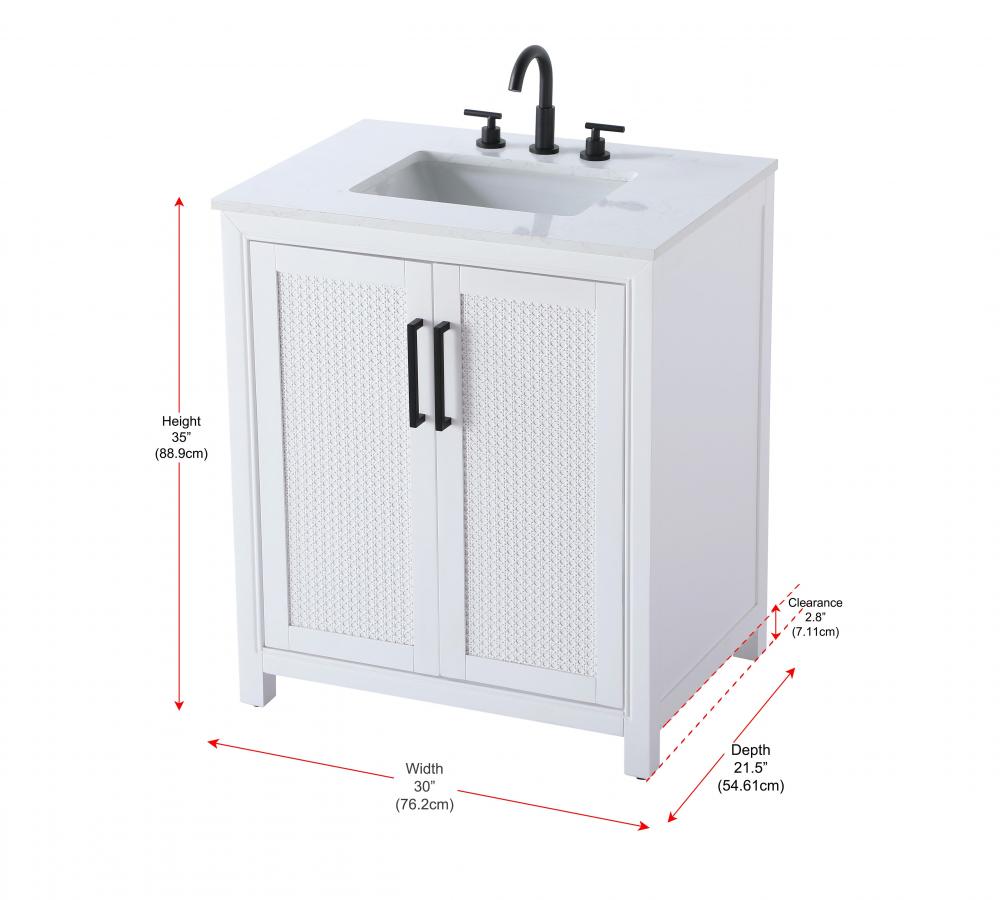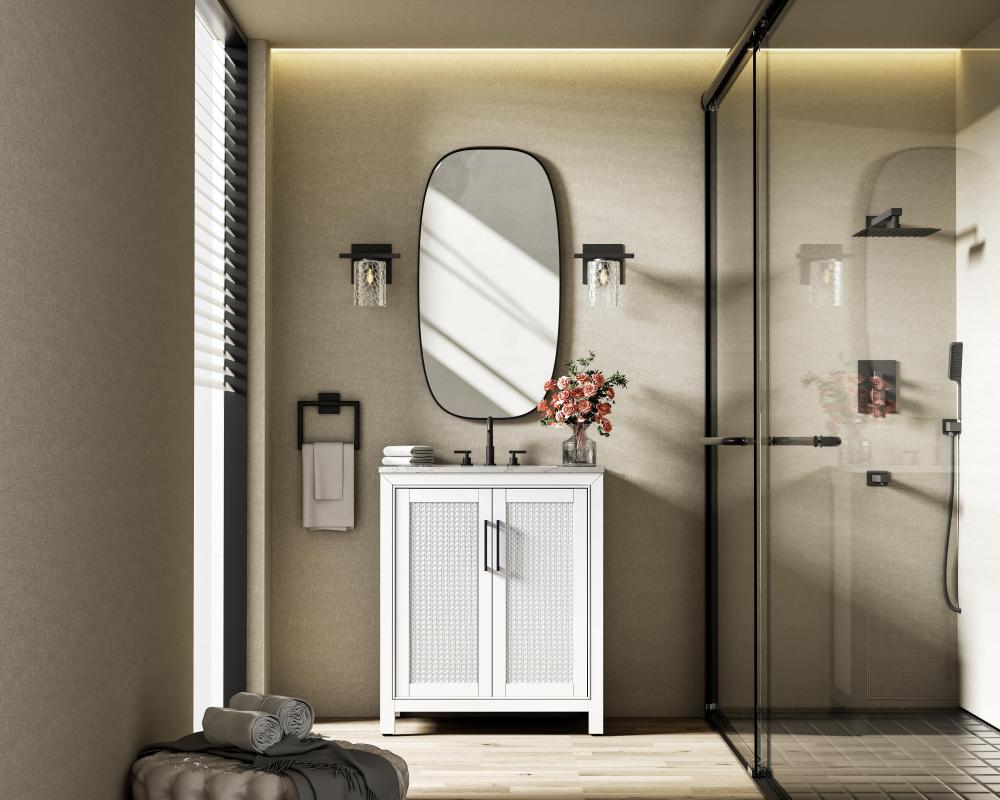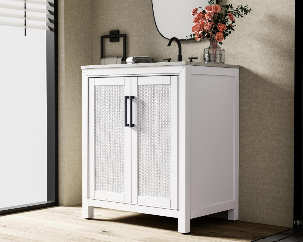 Perfect for those with an eye for detail and quality, this transitional vanity blends modern design with timeless elegance. Available in five stunning finishes, from Crisp White to Linen Oak, the wood grain visuals of the oak options bring warmth and character to any bathroom. The caning design on the Shaker-style door panels adds texture and a touch of refinement, while the soft-closing doors ensure smooth, quiet functionality. Topped with a white engineered marble countertop, the vanity offers both luxury and practicality, complete with pre-drilled faucet holes for customization. A concealed overflow and U-shaped shelf for plumbing make installation effortless, and the slender black metal pulls provide a sleek contrast.