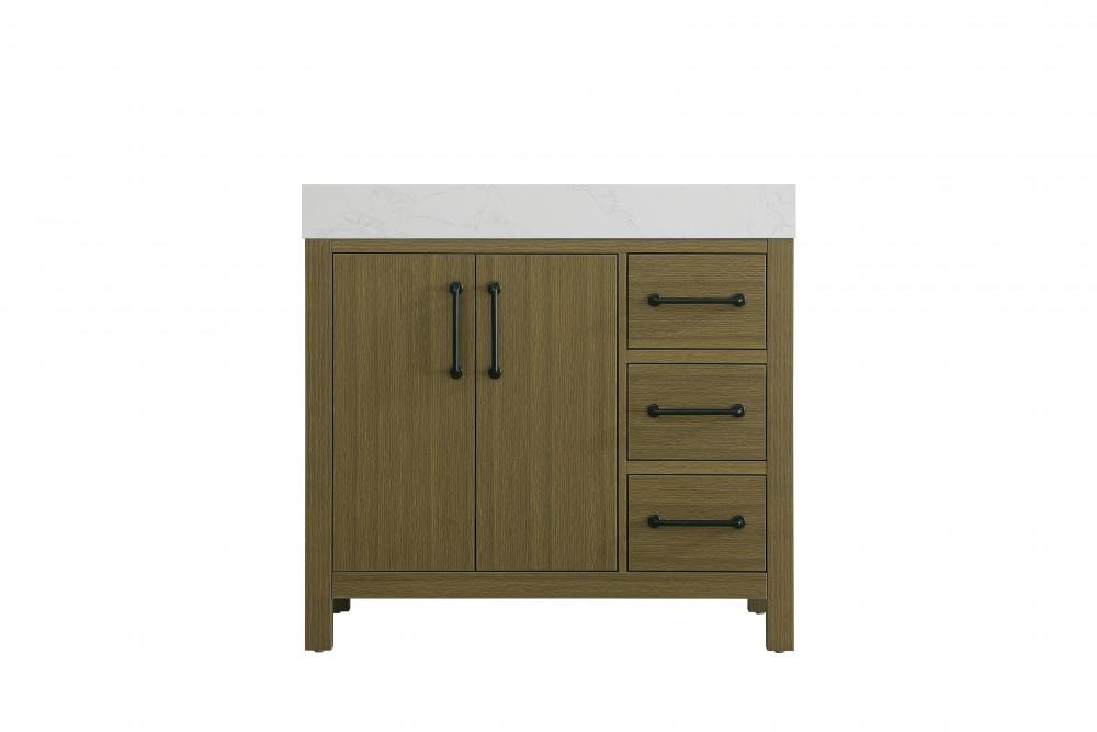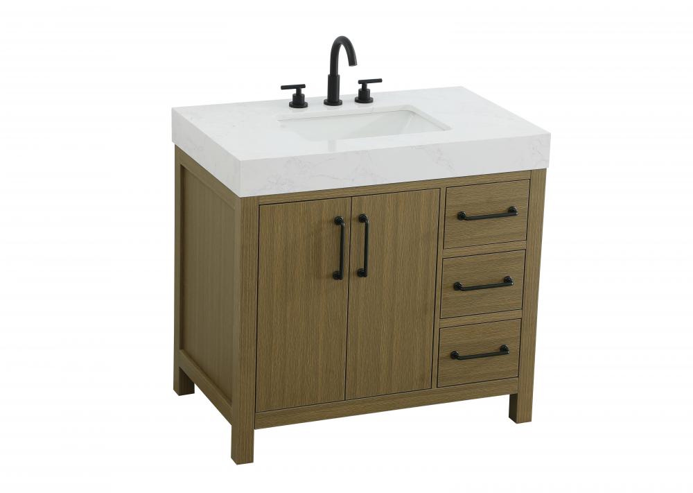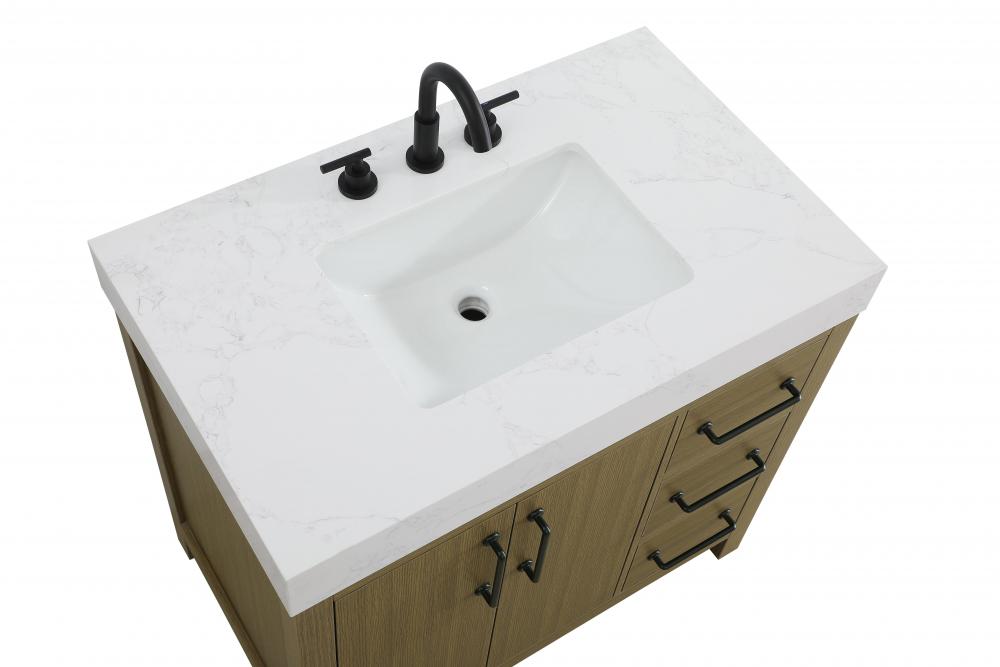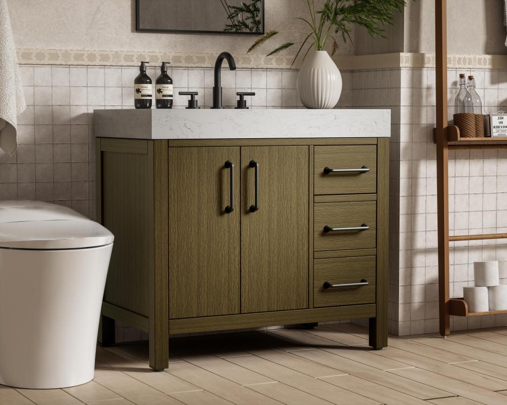 This bathroom vanity embodies a clean, minimalist design, perfectly suited for modern and transitional spaces. Its straight, sleek lines and flat-paneled doors create a refined yet approachable look. The warm, honey-toned finish highlights the subtle faux wood grain, adding visual interest while maintaining a sense of balance and simplicity. The vanity features a functional layout, with two cabinet doors on one side and three stacked drawers on the other, creating a balanced and organized look. Matte black hardware, including slim and cylindrical pulls, contrasts elegantly against the warm wood, reinforcing its contemporary vibe while providing subtle visual interest. The thick engineered marble countertop in crisp white adds a sharp contrast to the warm base, creating a visually dynamic combination that is both functional and stylish. This vanity is perfect for those seeking a design that combines modern simplicity with a touch of bold refinement. This vanity is delivered fully assembled and equipped with foot levelers for effortless installation and stability. Complete the setup with an optional matching backsplash, sold separately. Combining practicality and bold design, this vanity is UPC certified and ready to transform your bathroom space.
