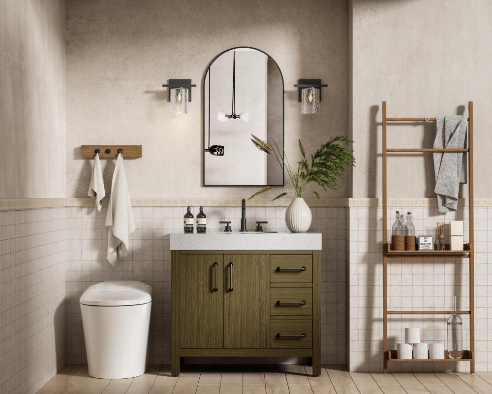 The engineered marble countertop stands out with its bold 4-inch thickness and natural veining, creating a commanding presence in any bathroom.