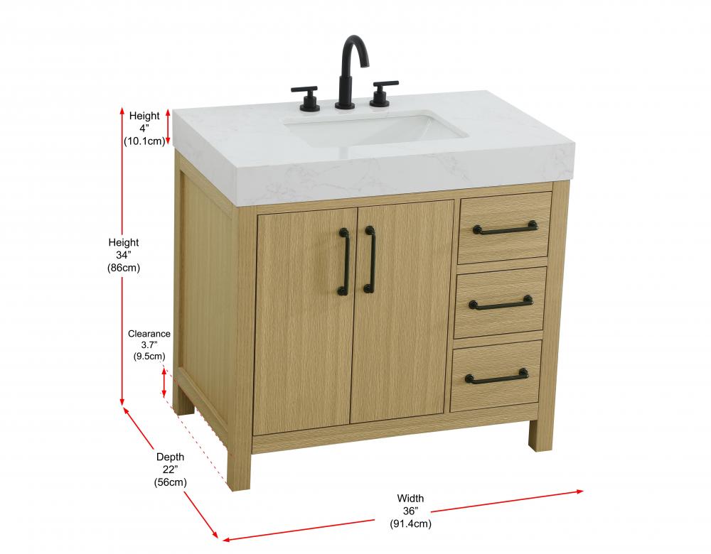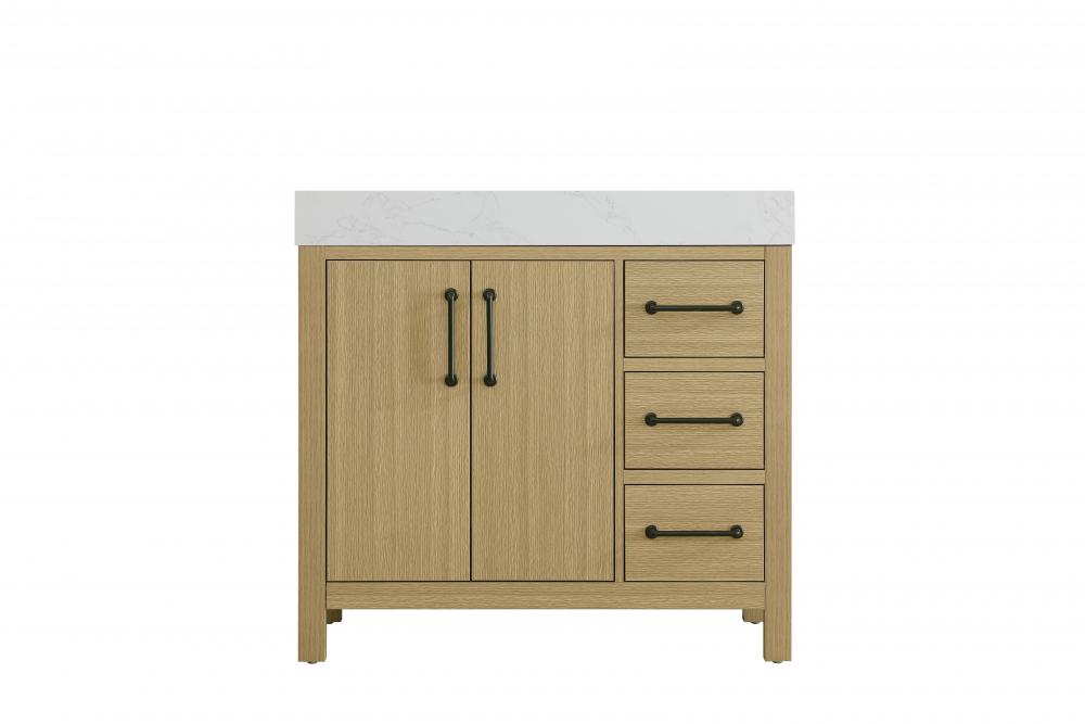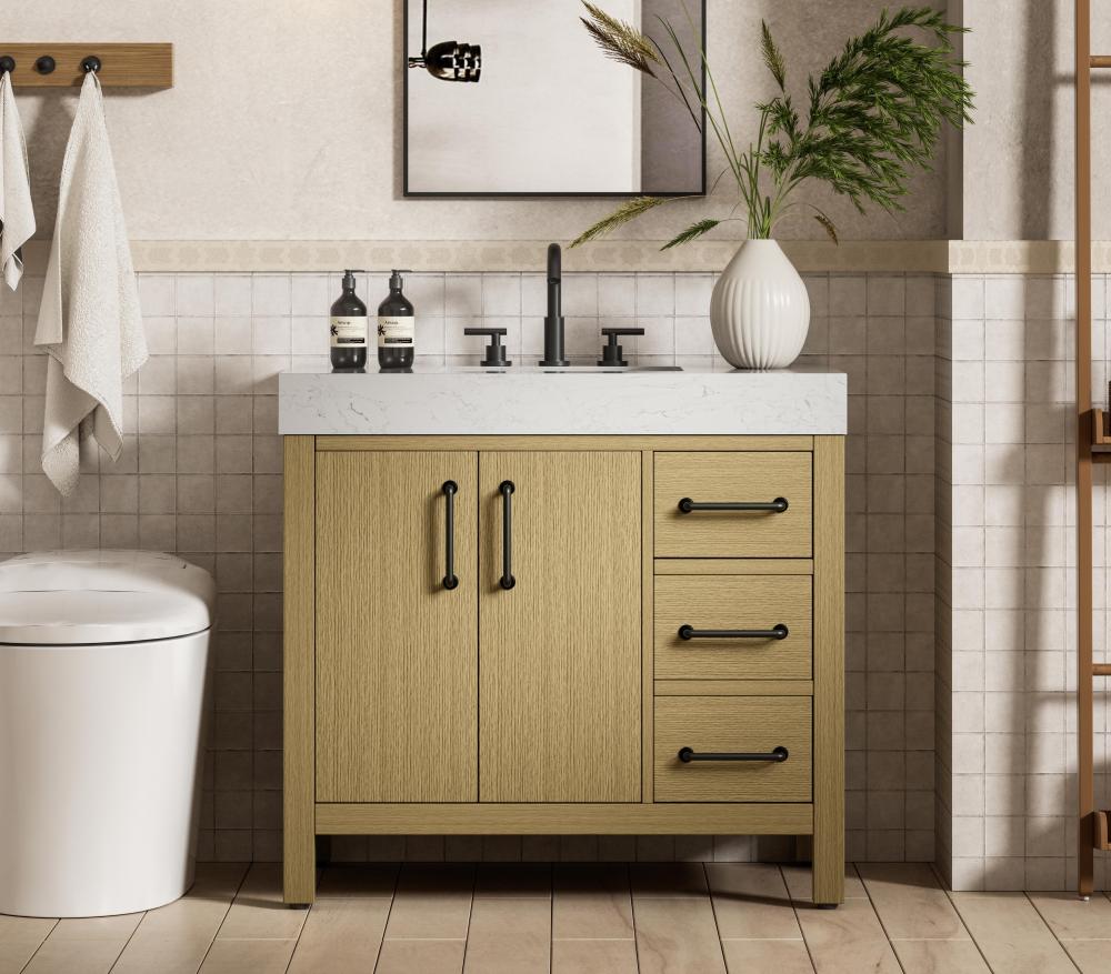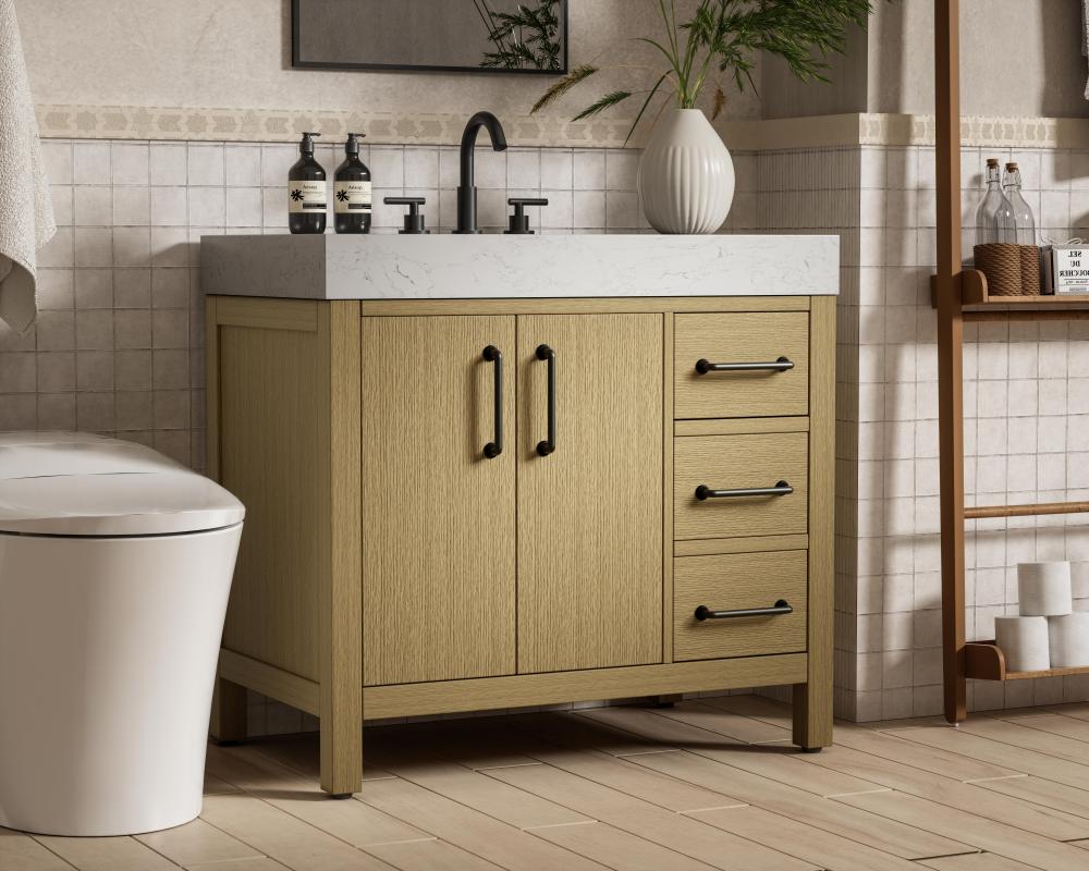 This bathroom vanity showcases a balanced blend of contemporary style and warm, natural-like elements, making it a versatile addition to various interior designs. The clean, straight edges and flat-panel doors lend a modern, streamlined look, while the soft, light wood finish highlights the faux grain pattern, adding warmth and a sense of organic texture to the piece. The vanity features a functional layout, with two cabinet doors on one side and three stacked drawers on the other, creating a balanced and organized look. Matte black hardware, including slim and cylindrical pulls, contrasts elegantly against the light wood, reinforcing its contemporary vibe while providing subtle visual interest. The thick engineered marble countertop in crisp white adds a sharp contrast to the light base, creating a visually dynamic combination that is both functional and stylish. This vanity is perfect for those seeking a design that combines modern simplicity with a touch of bold refinement. This vanity is delivered fully assembled and equipped with foot levelers for effortless installation and stability. Combining practicality and bold design, this vanity is UPC certified and ready to transform your bathroom space. Complete the setup with an optional matching backsplash, sold separately