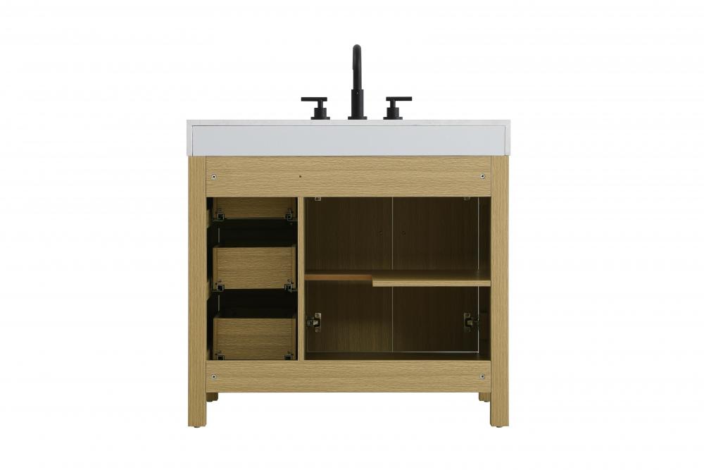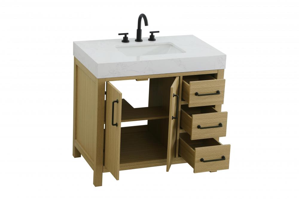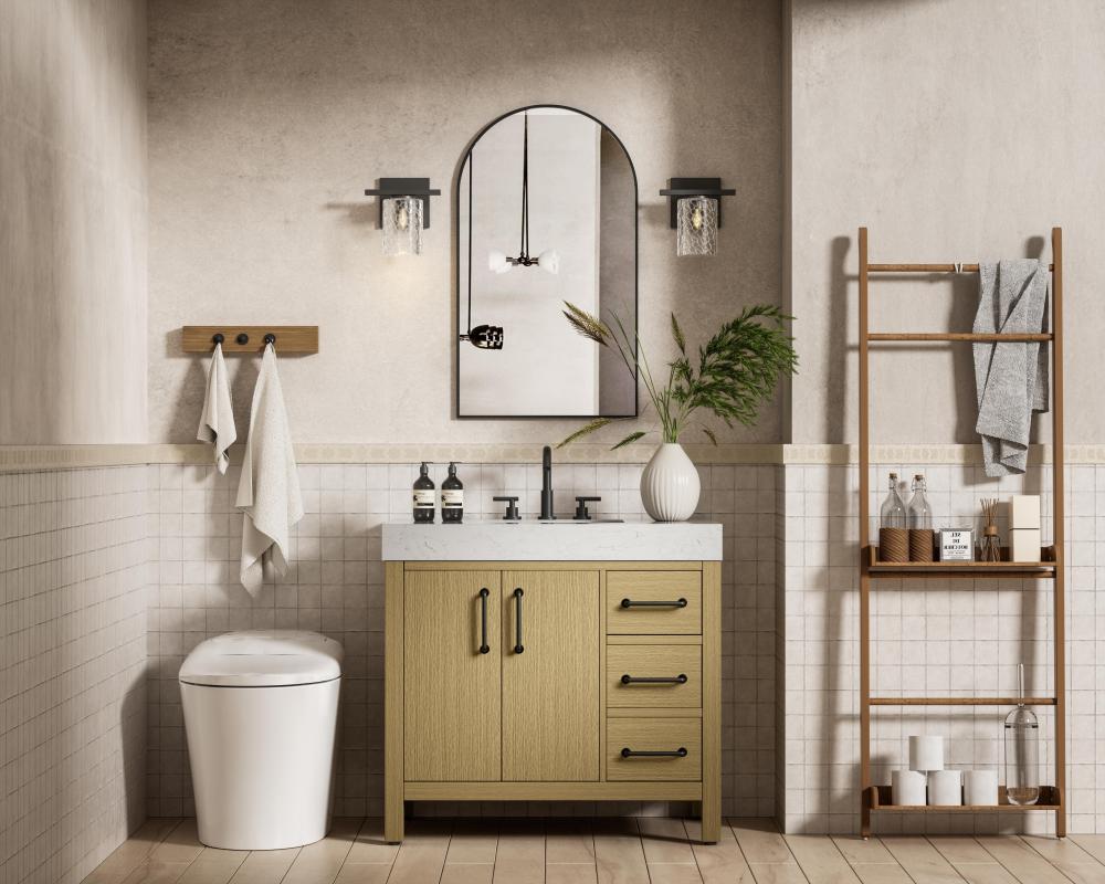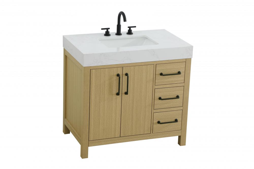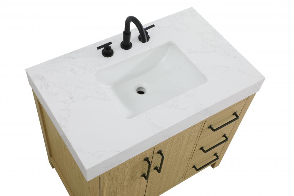 This bathroom vanity showcases a balanced blend of contemporary style and warm, natural-like elements, making it a versatile addition to various interior designs. The clean, straight edges and flat-panel doors lend a modern, streamlined look, while the soft, light wood finish highlights the faux grain pattern, adding warmth and a sense of organic texture to the piece. The vanity features a functional layout, with two cabinet doors on one side and three stacked drawers on the other, creating a balanced and organized look. Matte black hardware, including slim and cylindrical pulls, contrasts elegantly against the light wood, reinforcing its contemporary vibe while providing subtle visual interest. The thick engineered marble countertop in crisp white adds a sharp contrast to the light base, creating a visually dynamic combination that is both functional and stylish. This vanity is perfect for those seeking a design that combines modern simplicity with a touch of bold refinement. This vanity is delivered fully assembled and equipped with foot levelers for effortless installation and stability. Combining practicality and bold design, this vanity is UPC certified and ready to transform your bathroom space. Complete the setup with an optional matching backsplash, sold separately