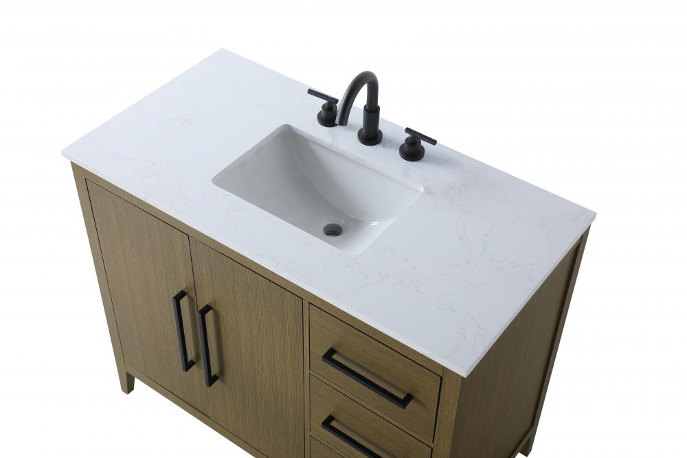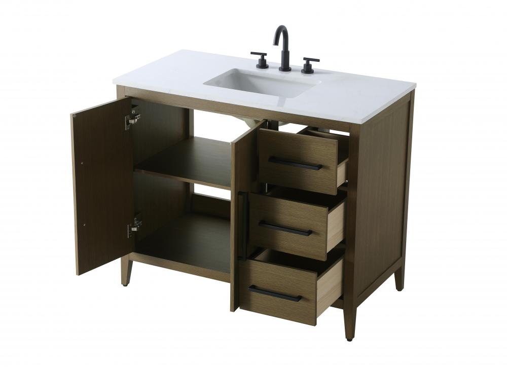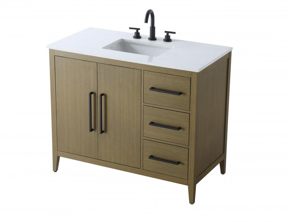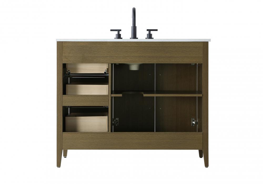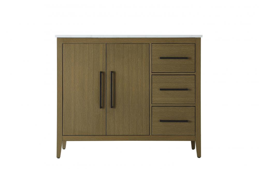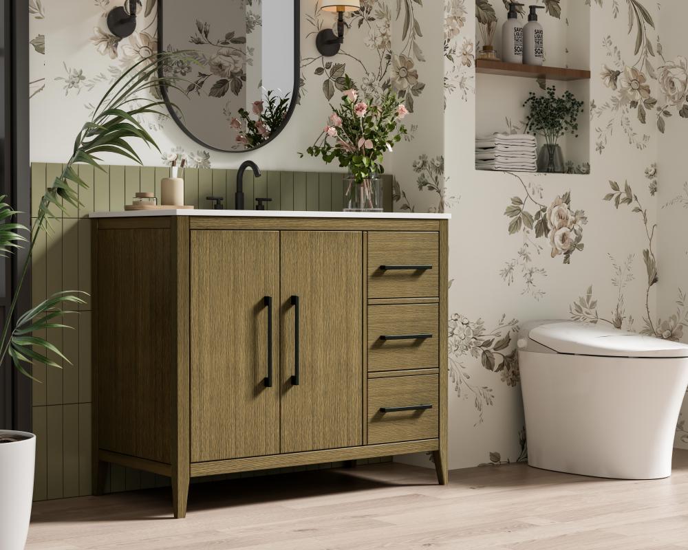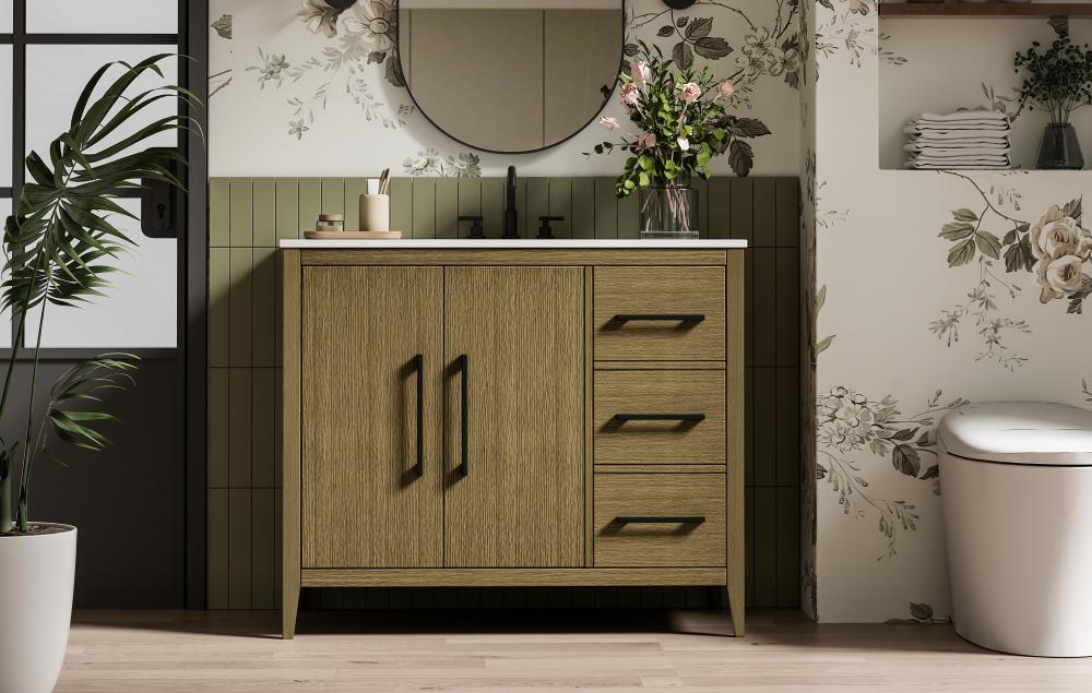 Bring both elegance and practicality to your bathroom with this transitional vanity, available in a selection of rich finishes that highlight the beauty of faux wood grain in shades of mocha, chestnut, and honey, along with classic white and modern grey. The flat door panels and sleek black metal pulls create a minimalist yet refined aesthetic, while the soft-closing drawers and tapered legs with levelers provide smooth, functional operation. Topped with a luxurious white engineered marble countertop and featuring a porcelain sink, this vanity combines timeless style with modern efficiency. Thoughtfully designed with U-shaped cutout for plumbing, it offers ample storage and easy installation, making it the perfect centerpiece for any bathroom.