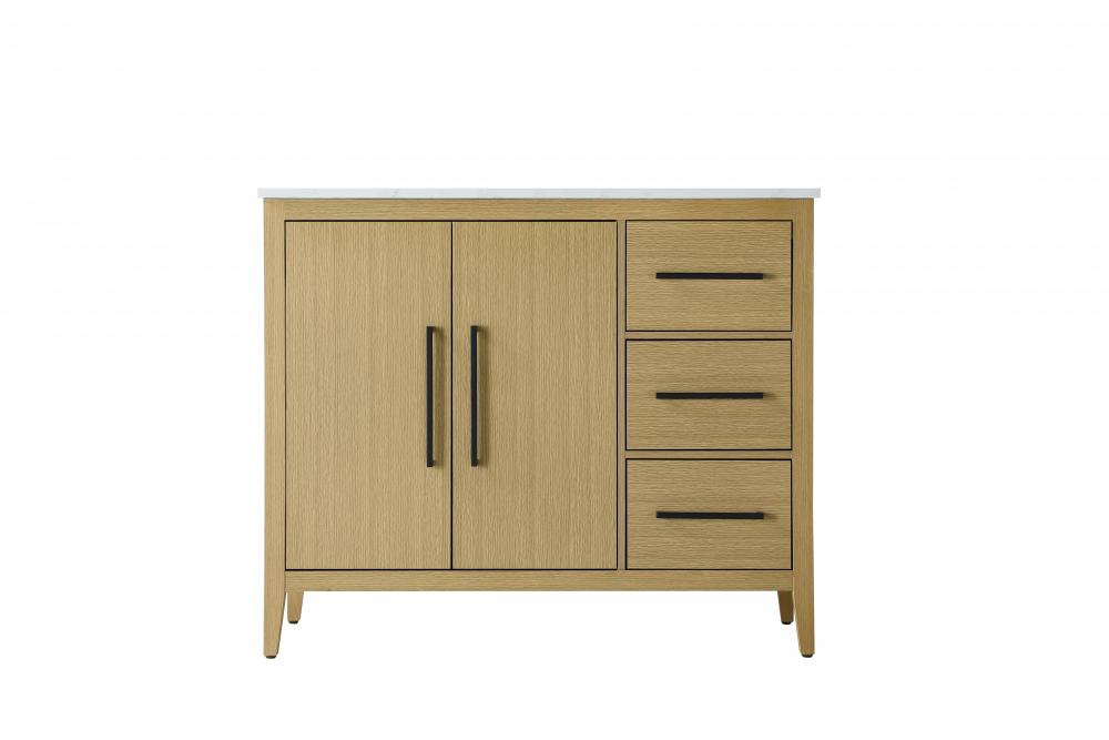 The vanity stands on tapered 5-inch solid wood legs with levelers for a balanced, polished look, combining modern style with practicality.