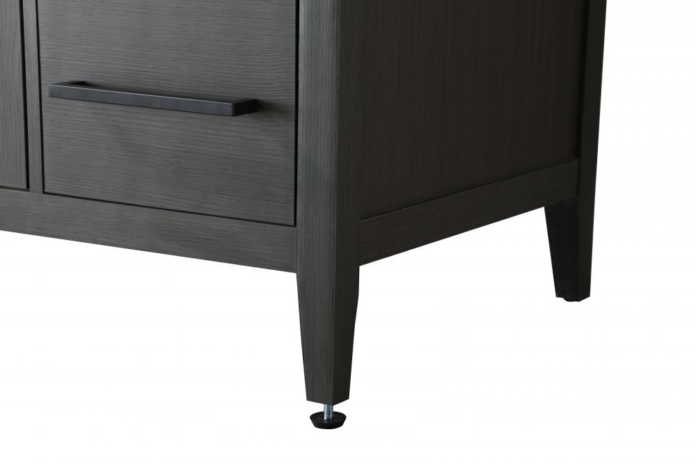 The vanity stands on tapered 5-inch solid wood legs with levelers for a balanced, polished look, combining modern style with practicality.