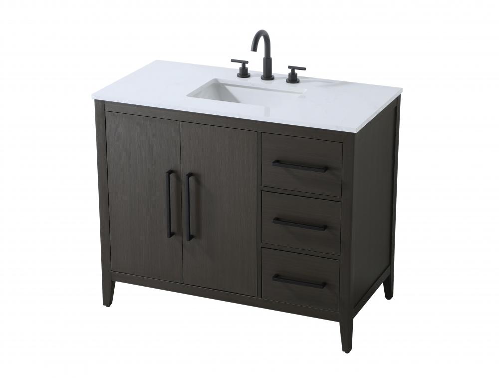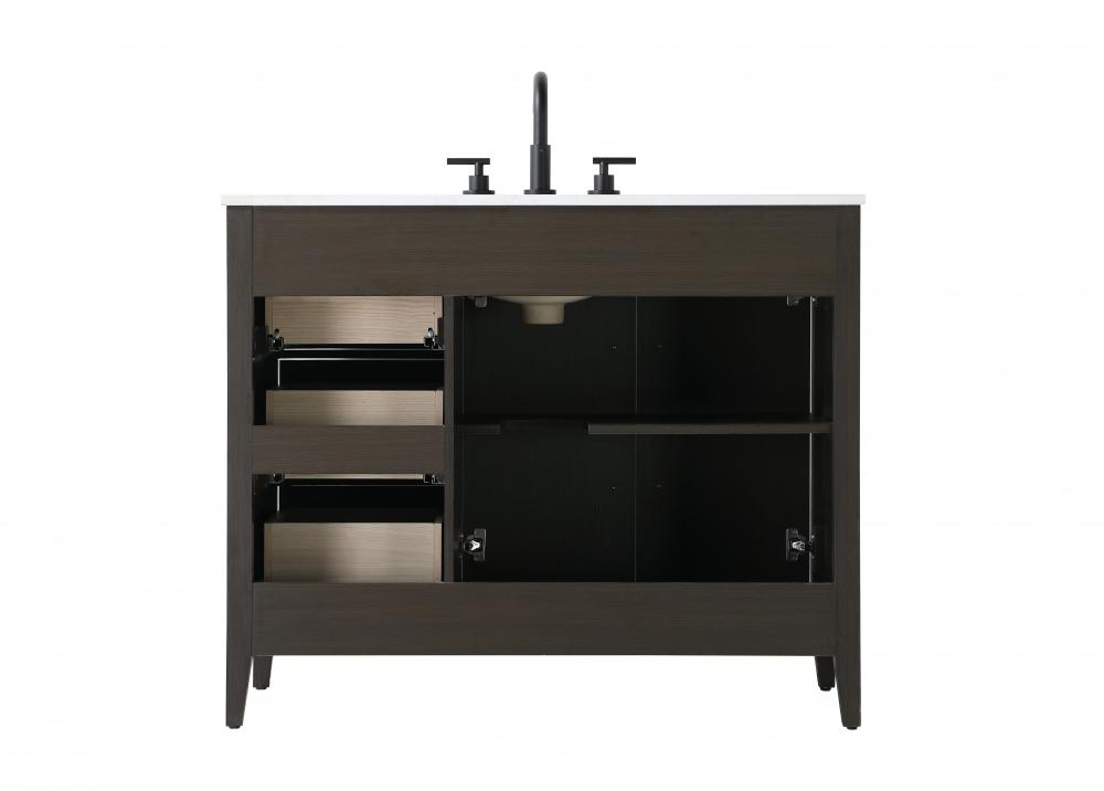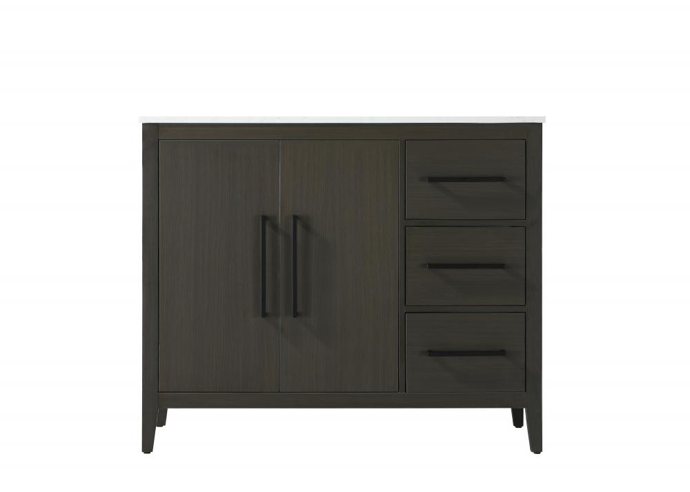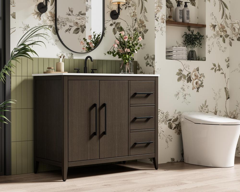 Bring both elegance and practicality to your bathroom with this transitional vanity, available in a selection of rich finishes that highlight the beauty of faux wood grain in shades of mocha, chestnut, and honey, along with classic white and modern grey. The flat door panels and sleek black metal pulls create a minimalist yet refined aesthetic, while the soft-closing drawers and tapered legs with levelers provide smooth, functional operation. Topped with a luxurious white engineered marble countertop and featuring a porcelain sink, this vanity combines timeless style with modern efficiency. Thoughtfully designed with U-shaped cutout for plumbing, it offers ample storage and easy installation, making it the perfect centerpiece for any bathroom.