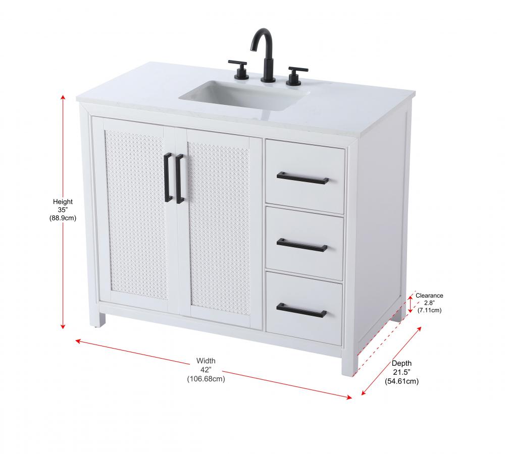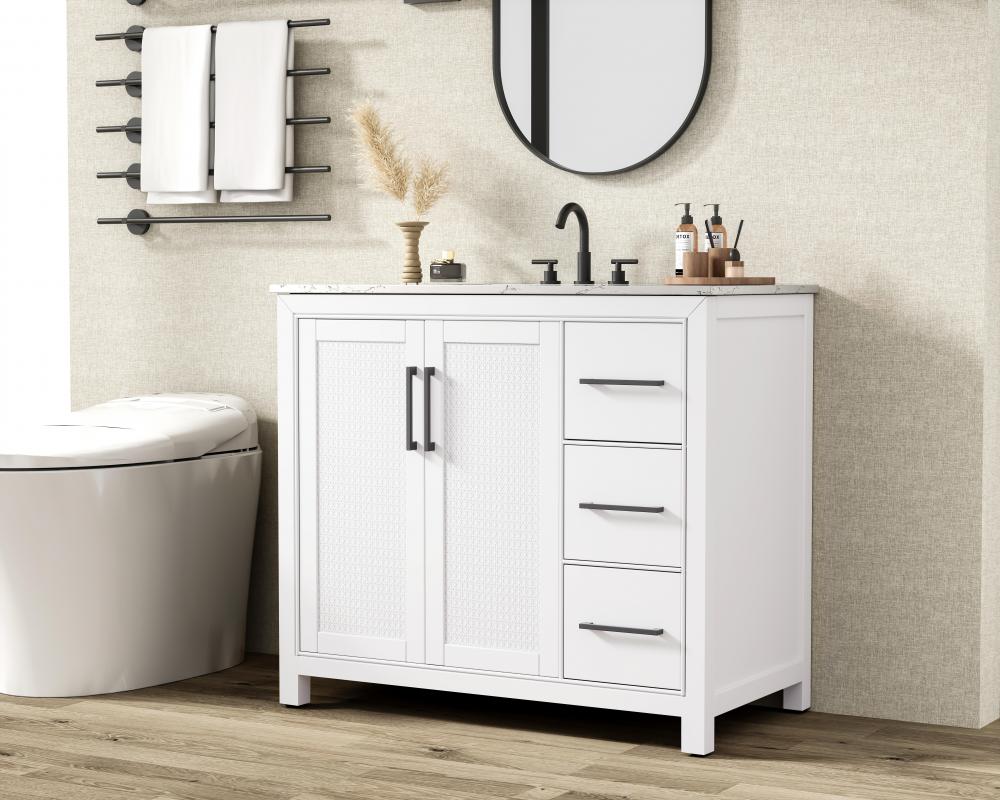 Perfect for those with an eye for detail and quality, this transitional vanity blends modern design with timeless elegance. Available in five stunning finishes, from Crisp White to Linen Oak, the wood grain visuals of the oak options bring warmth and character to any bathroom. The caning design on the Shaker-style door panels adds texture and a touch of refinement, while the soft-closing doors and drawers ensure smooth, quiet functionality. Topped with a white engineered marble countertop, the vanity offers both luxury and practicality, complete with pre-drilled faucet holes for customization. A concealed overflow and U-shaped shelf for plumbing make installation effortless, and the slender black metal pulls provide a sleek contrast.