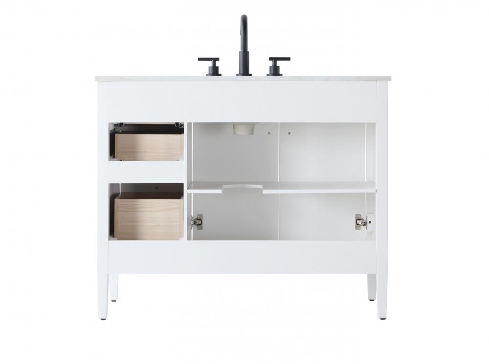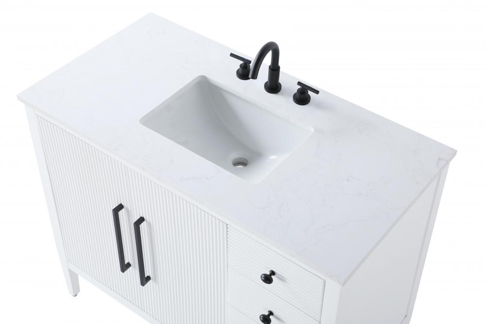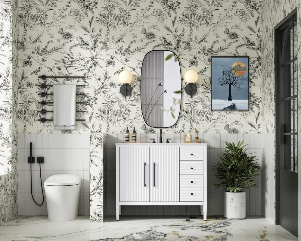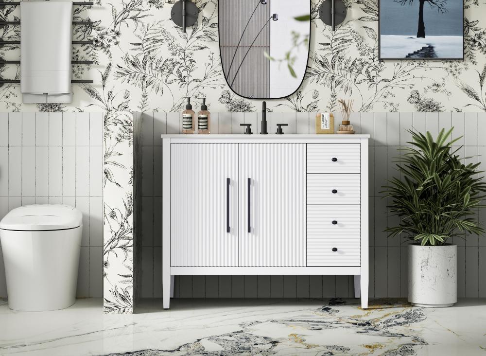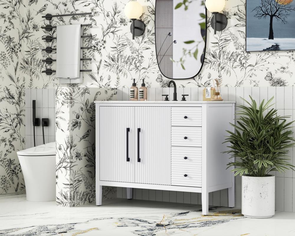 Designed with transitional elegance in mind, this bathroom vanity seamlessly blends traditional elements with modern functionality. Available in five stunning finishes, from the clean sophistication of Crisp White to the natural warmth of Honey Oak, the fluted door and drawer panels add subtle texture and charm. The white engineered marble countertop with natural veining exudes luxury, while the soft-closing doors and drawers with sleek black metal pulls offer a quiet, refined experience. Practicality is never compromised, with features like the U-shaped shelf for plumbing, deeper bottom drawer for ample storage, and pre-drilled faucet holes for easy customization. Whether your style leans modern or classic, this vanity is the perfect balance of beauty and function, appealing to customers with a taste for quality and style.