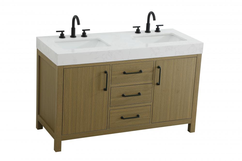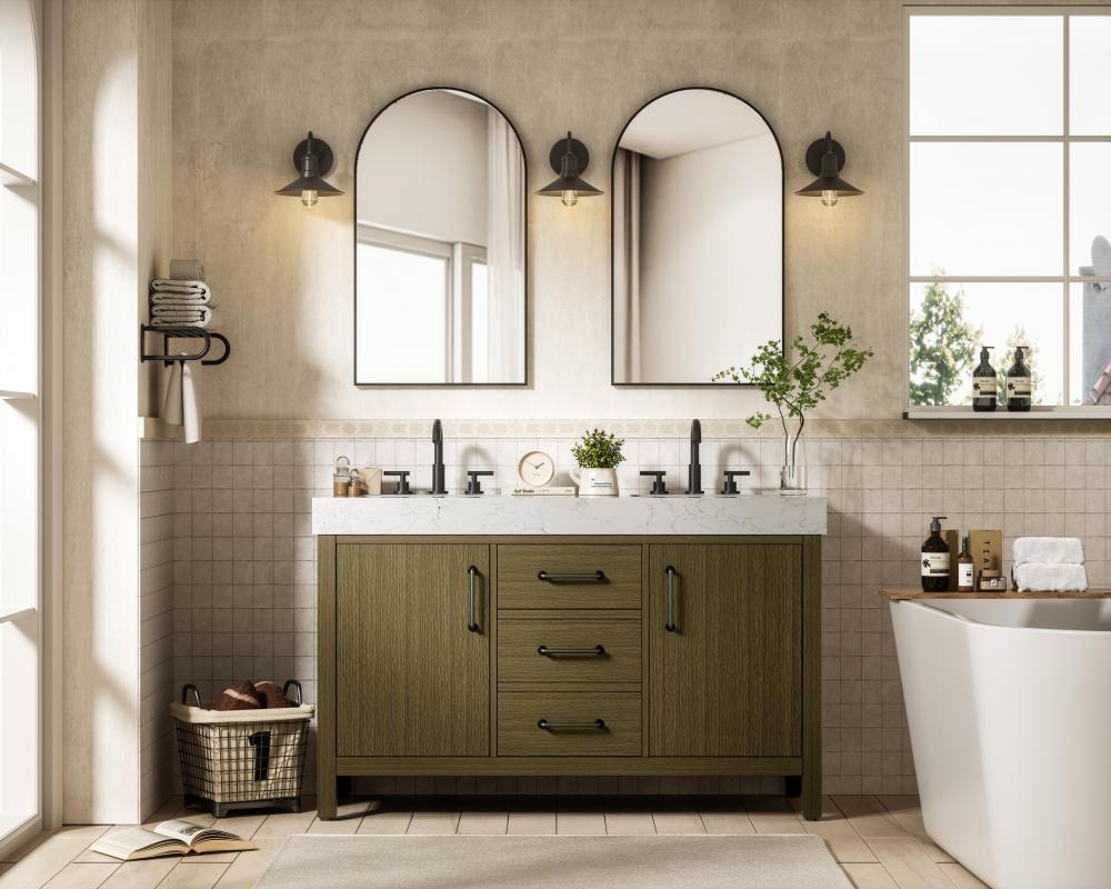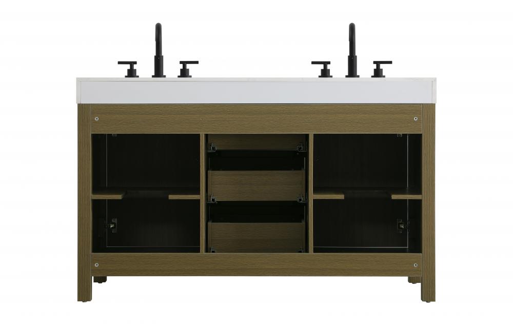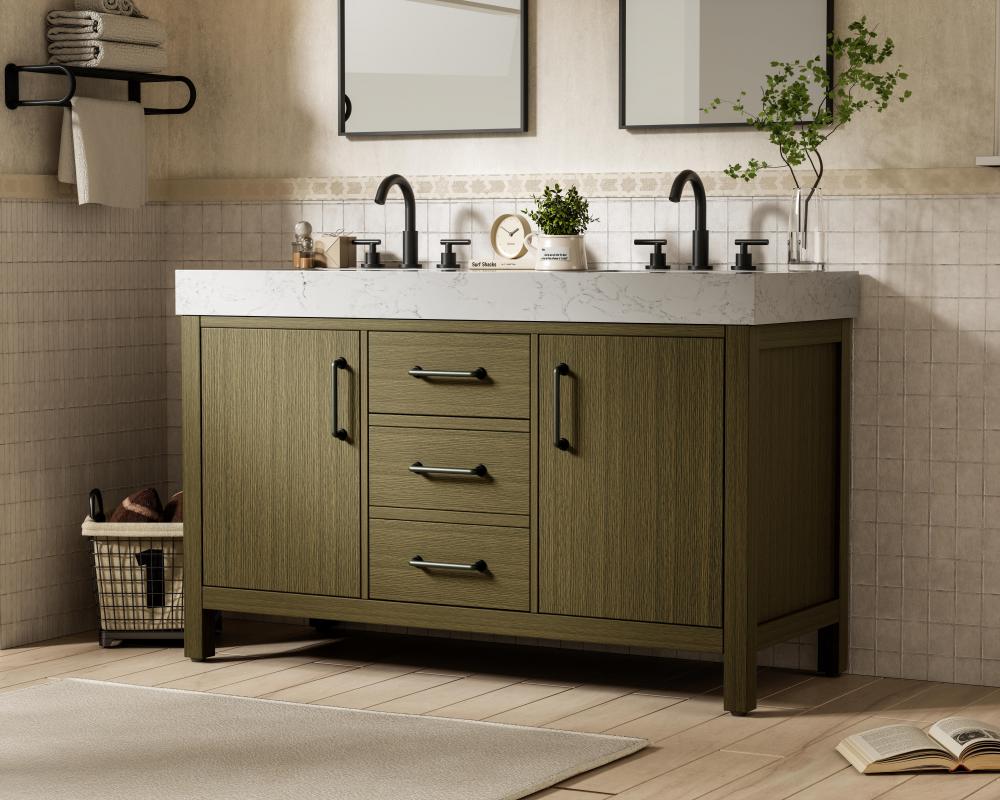This bathroom vanity embodies a clean, minimalist design, perfectly suited for modern and transitional spaces. Its straight, sleek lines and flat-paneled doors create a refined yet approachable look. The warm, honey-toned finish highlights the subtle wood grain, adding texture and visual interest while maintaining a sense of balance and simplicity. The design features a double-sink layout, emphasizing functionality and spaciousness, ideal for shared bathrooms. The central drawers and symmetrical cabinet doors create a sense of balance and structure. Matte black hardware offers a bold contrast to the warm wood tone, reinforcing the modern aesthetic while maintaining a timeless appeal. The thick engineered marble countertop adds a sturdy, minimalist element, with its clean white surface further elevating the overall sophistication of the vanity. This piece is a perfect marriage of style and practicality, effortlessly complementing both modern and transitional bathroom designs. This vanity is delivered fully assembled and equipped with foot levelers for effortless installation and stability. Combining practicality and bold design, this vanity is UPC certified and ready to transform your bathroom space.
