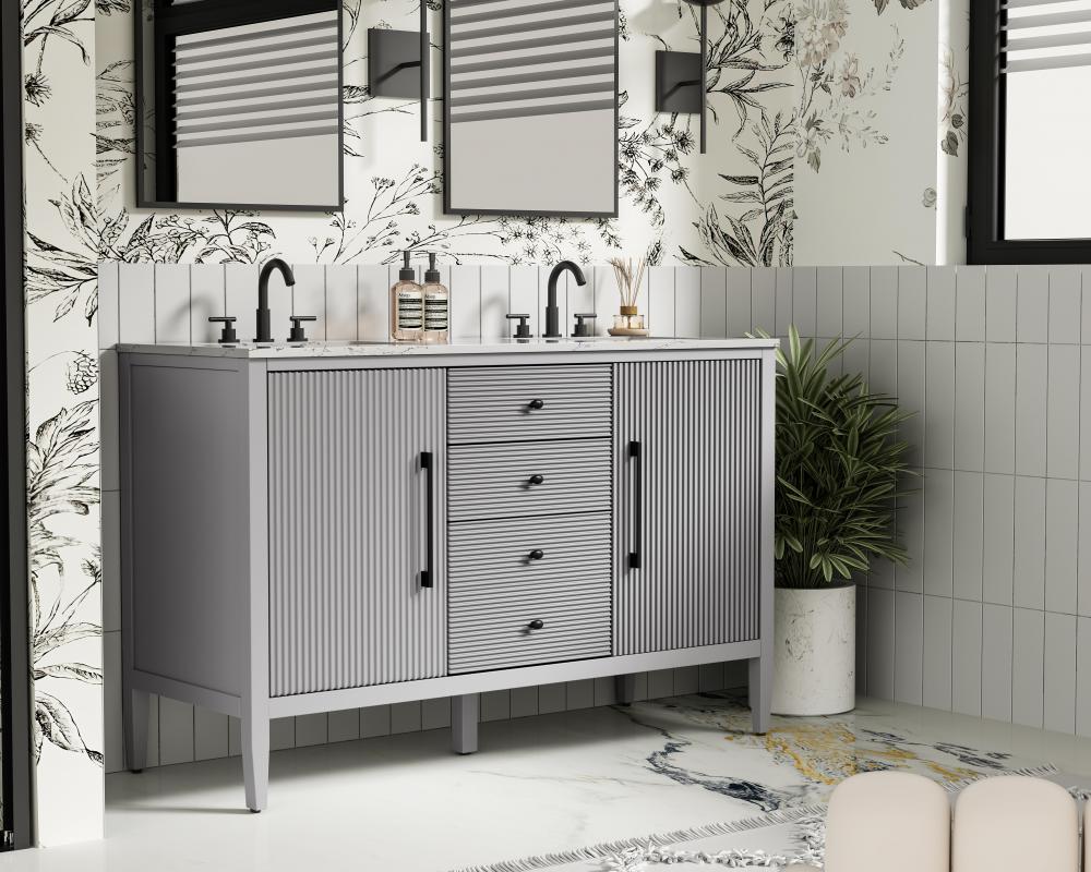 Designed with transitional elegance in mind, this bathroom vanity seamlessly blends traditional elements with modern functionality. Available in five stunning finishes, from the clean sophistication of Crisp White to the natural warmth of Honey Oak, the fluted door and drawer panels add subtle texture and charm. The white engineered marble countertop with natural veining exudes luxury, while the soft-closing doors and drawers with sleek black metal pulls offer a quiet, refined experience. Practicality is never compromised, with features like the U-shaped shelf for plumbing, deeper bottom drawer for ample storage, and pre-drilled faucet holes for easy customization. Whether your style leans modern or classic, this vanity is the perfect balance of beauty and function, appealing to customers with a taste for quality and style.