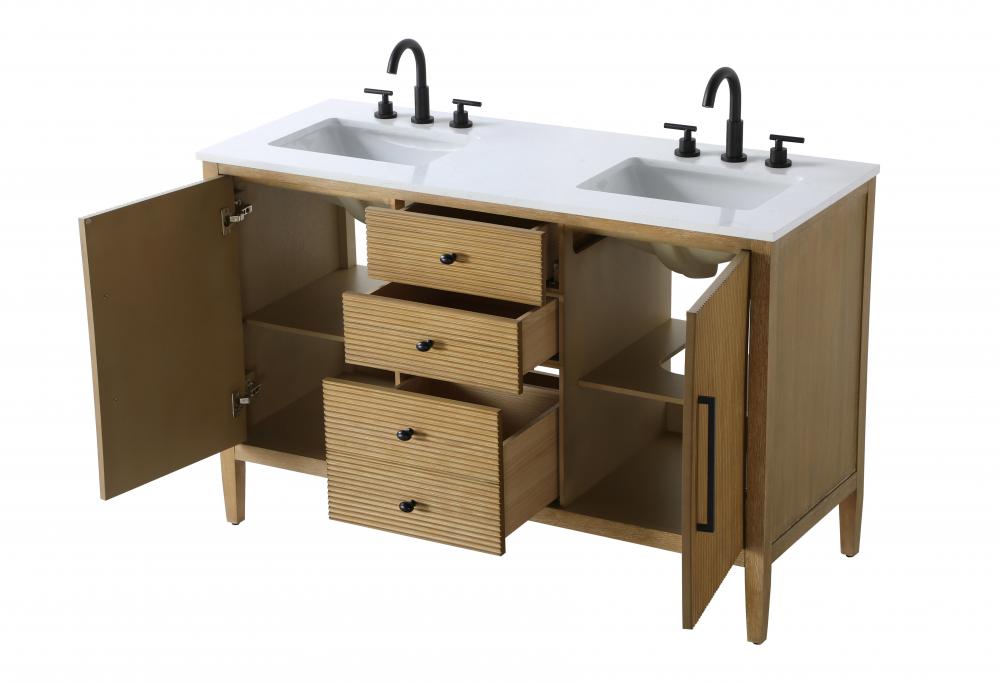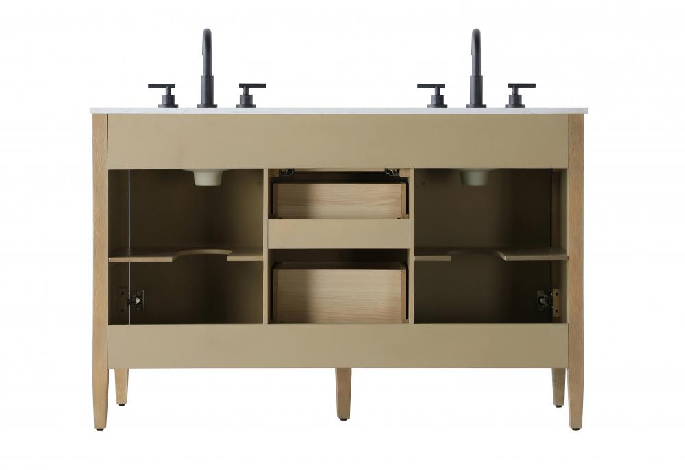 Inside the cabinet, the shelf is thoughtfully designed with a U-shaped cutout to allow for seamless plumbing installation while maintaining storage space.