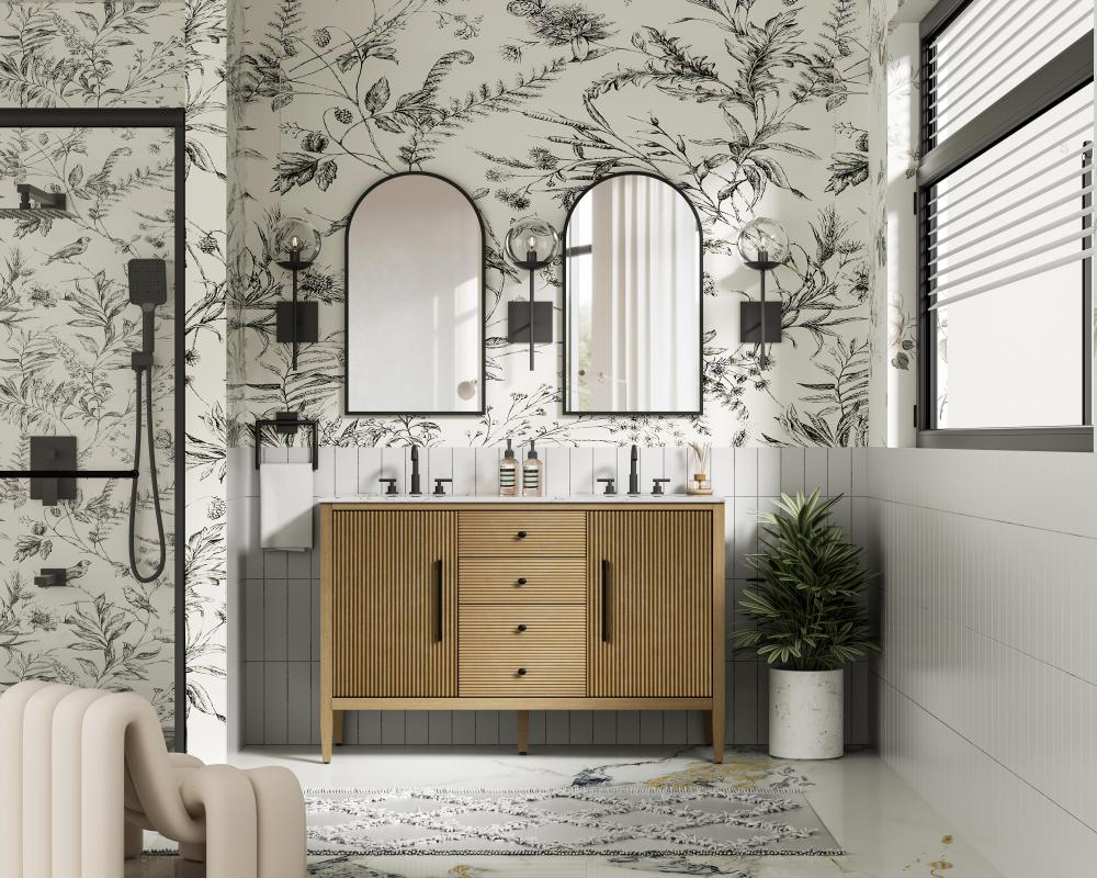 The vanity stands on thin tapered legs with levelers, adding a modern, airy touch while ensuring stability.