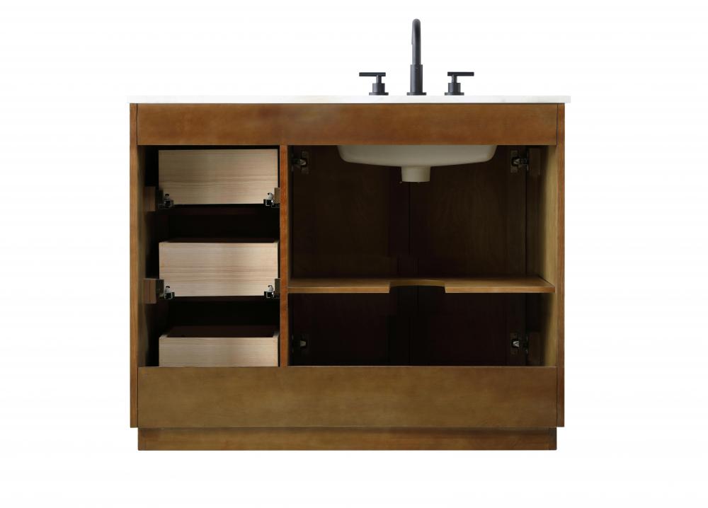 This transitional bathroom vanity offers the perfect blend of timeless style and modern functionality. Available in five refined finishes—crisp white, sleek grey, chocolate oak, honey oak, and linen oak—it complements a range of decor styles, from classic to contemporary. The stunning herringbone design on the Shaker-style door panels adds texture and craftsmanship to the piece. Topped with a white engineered marble countertop featuring subtle veining, it provides both beauty and durability. The long black metal pulls on the soft-closing doors and the thin bar pulls on the drawers add sleek, modern detailing. Practical features include a concealed overflow, a back panel cutout for easy plumbing installation, and a U-shaped cutout shelf to fit plumbing while maximizing storage space. with a toe kick all around the base, this vanity is thoughtfully designed to blend form and function in any bathroom setting.