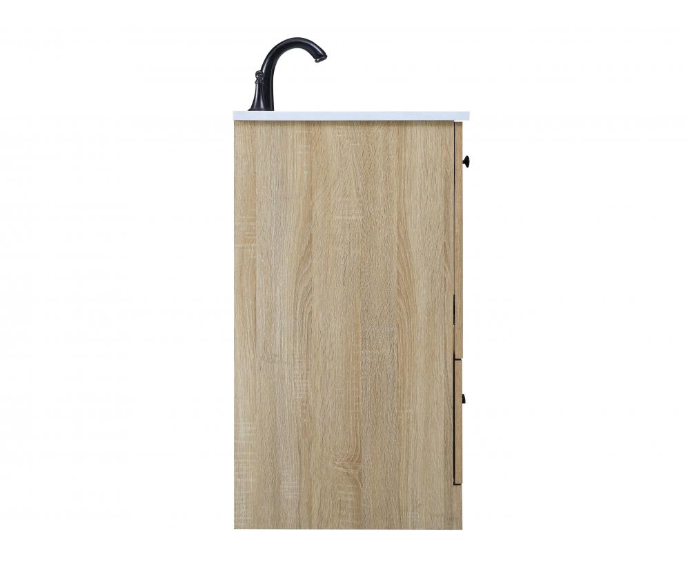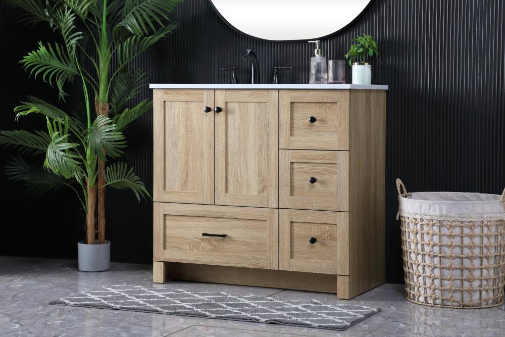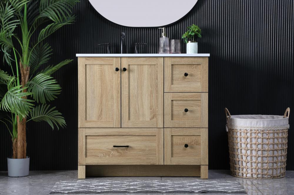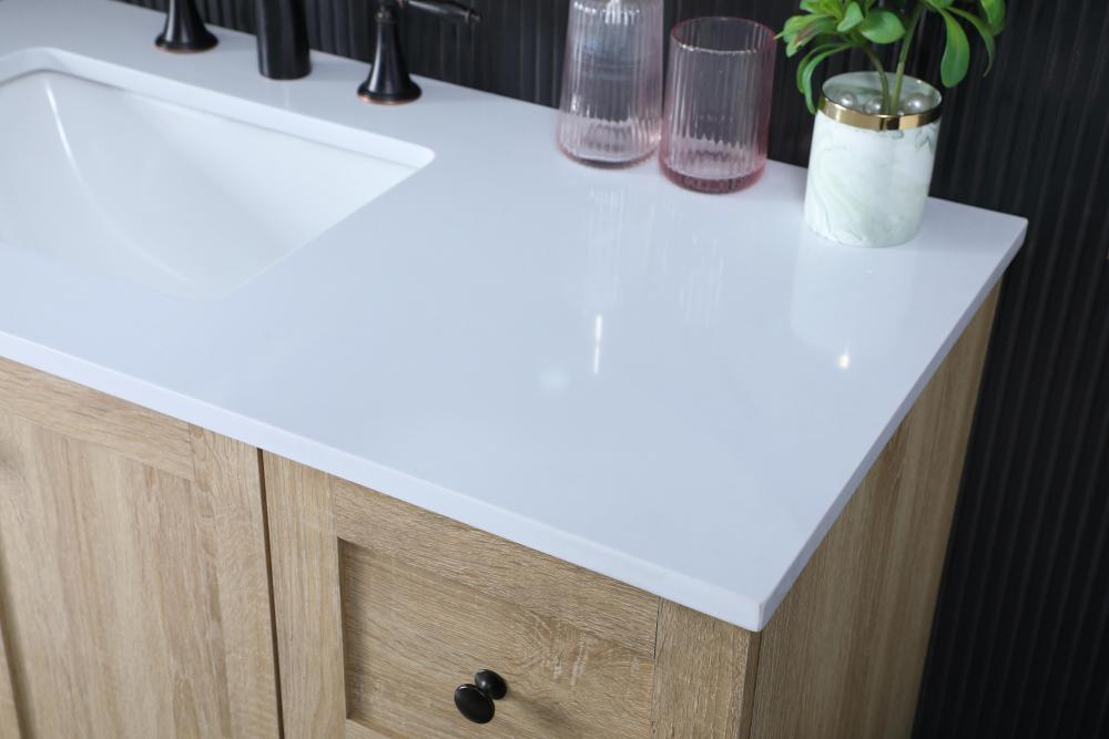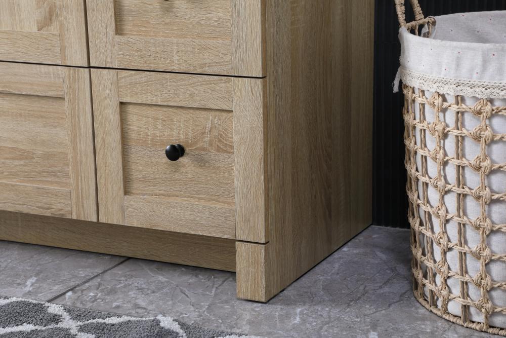 Revel in the beauty of a vanity that mimics the charm of real wood without the maintenance, boasting a faux wood look that adds a touch of natural warmth and rustic sophistication to your bathroom.