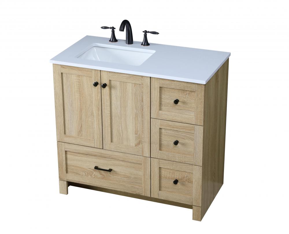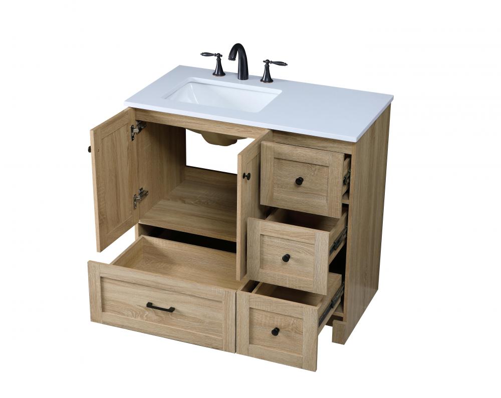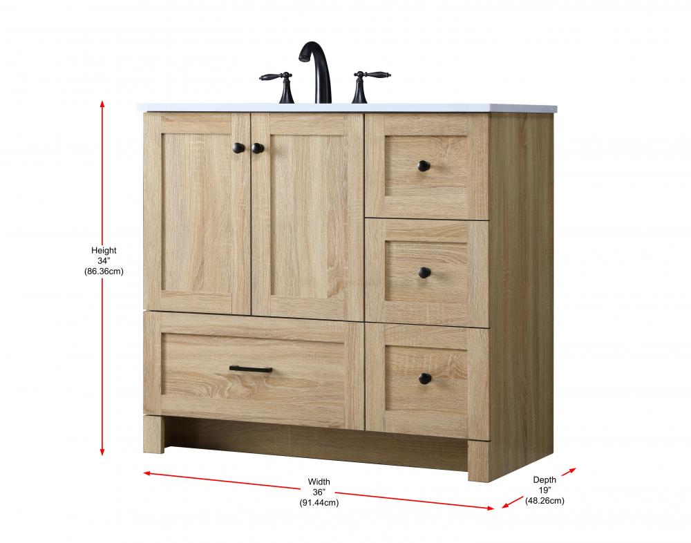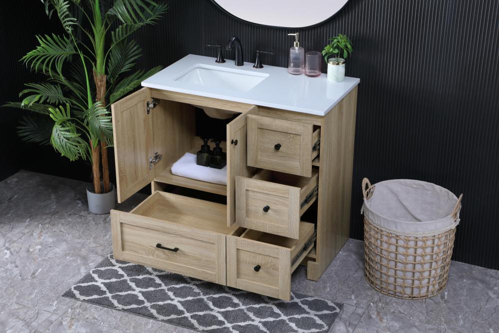 Revel in the beauty of a vanity that mimics the charm of real wood without the maintenance, boasting a faux wood look that adds a touch of natural warmth and rustic sophistication to your bathroom.