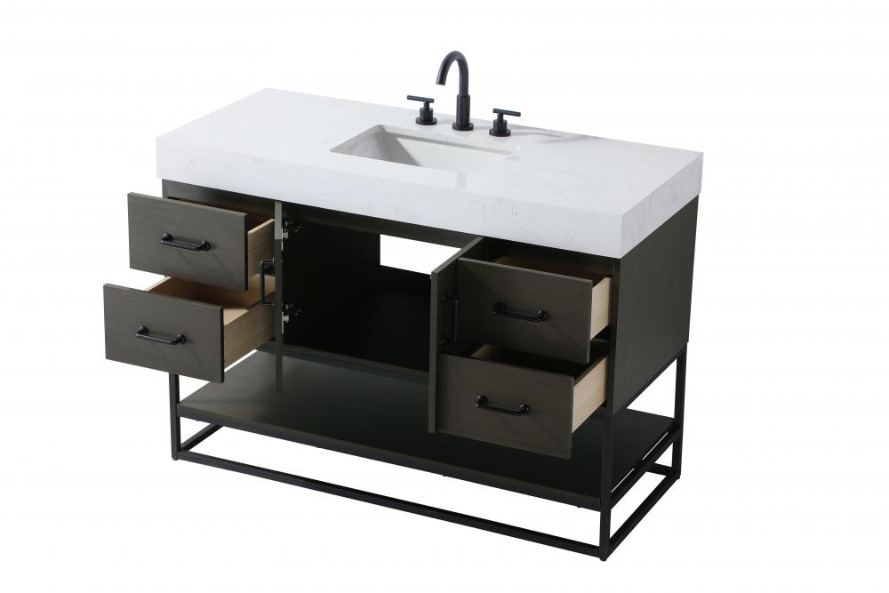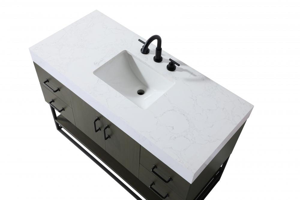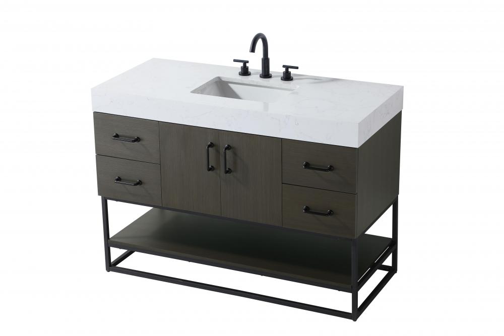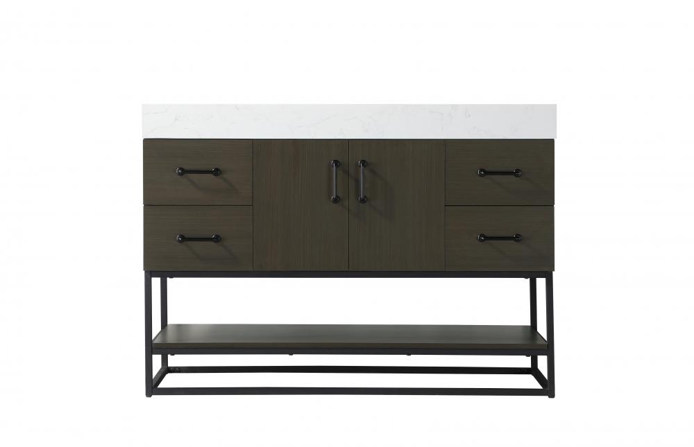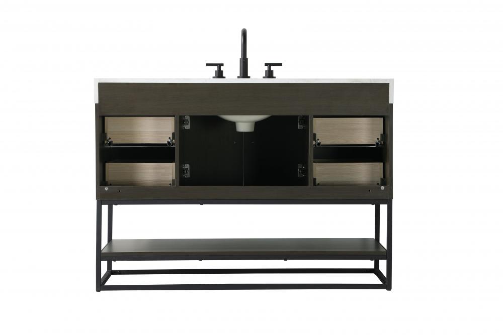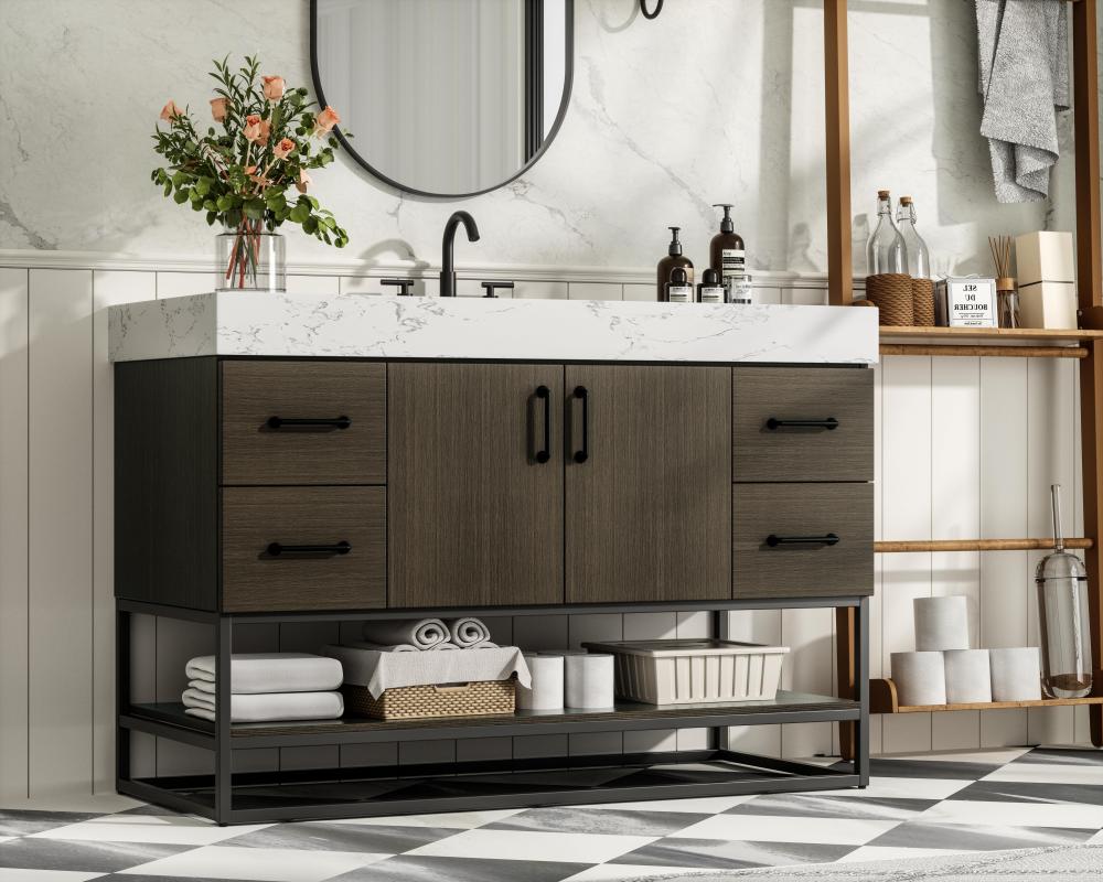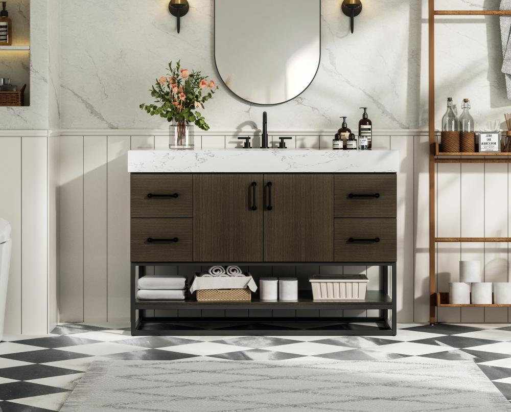 Upgrade your bathroom with this stylish transitional vanity, available in five stunning finishes, from crisp white to warm honey brown, designed to suit a variety of decor styles. The minimalist flat door panels and open wood shelf create a functional yet visually appealing storage solution, while the slender black metal legs elevate the look with modern sophistication. The 4-inch thick white engineered marble countertop, accented with natural veining, adds a luxurious touch, perfectly complemented by soft-closing doors with sleek black metal bar pulls. Thoughtful details like the concealed overflow, back panel cutout for plumbing, and 3 pre-drilled holes for an 8-inch faucet make installation easy and efficient. with a porcelain sink and farmhouse-inspired touches, this vanity brings both elegance and practicality to any bathroom setting.