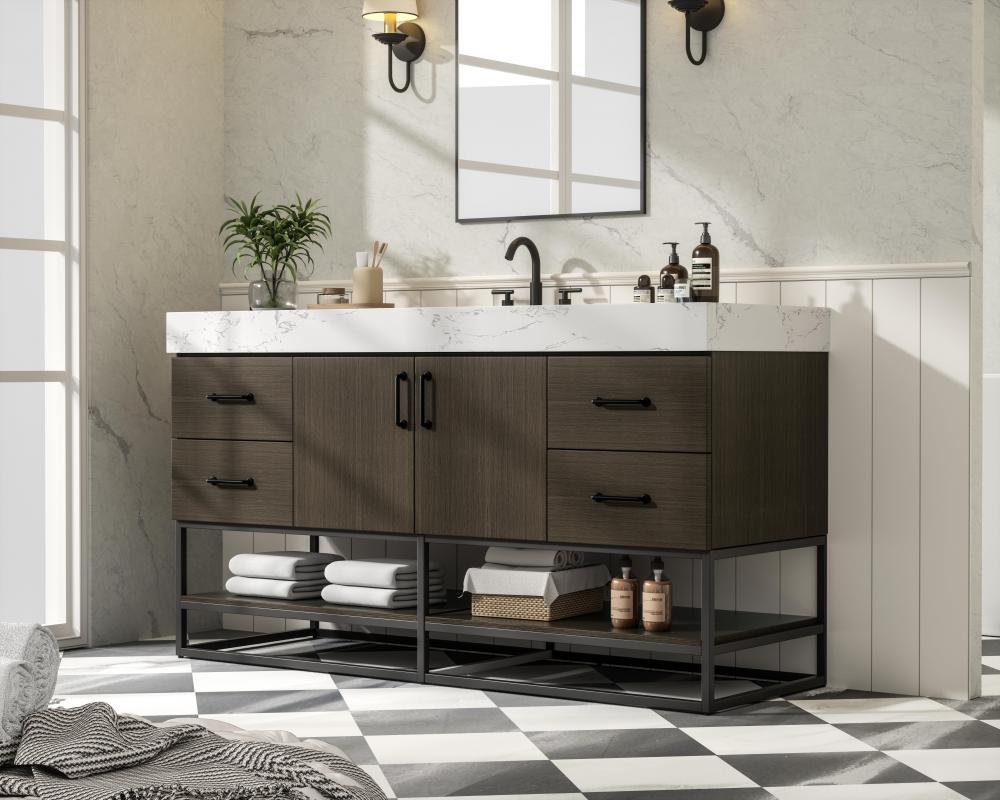 Upgrade your bathroom with this stylish transitional vanity, available in five stunning finishes, from crisp white to warm honey brown, designed to suit a variety of decor styles. The minimalist flat door panels and open wood shelf create a functional yet visually appealing storage solution, while the slender black metal legs elevate the look with modern sophistication. The 4-inch thick white engineered marble countertop, accented with natural veining, adds a luxurious touch, perfectly complemented by soft-closing doors with sleek black metal bar pulls. Thoughtful details like the concealed overflow, back panel cutout for plumbing, and 3 pre-drilled holes for an 8-inch faucet make installation easy and efficient. with a porcelain sink and farmhouse-inspired touches, this vanity brings both elegance and practicality to any bathroom setting.
