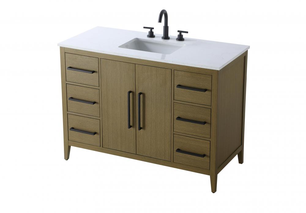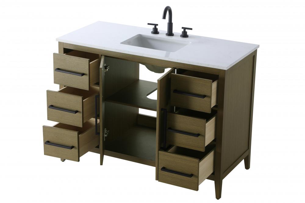 Bring both elegance and practicality to your bathroom with this transitional vanity, available in a selection of rich finishes that highlight the beauty of faux wood grain in shades of mocha, chestnut, and honey, along with classic white and modern grey. The flat door panels and sleek black metal pulls create a minimalist yet refined aesthetic, while the soft-closing drawers and tapered legs with levelers provide smooth, functional operation. Topped with a luxurious white engineered marble countertop and featuring a porcelain sink, this vanity combines timeless style with modern efficiency. Thoughtfully designed with U-shaped cutout for plumbing, it offers ample storage and easy installation, making it the perfect centerpiece for any bathroom.