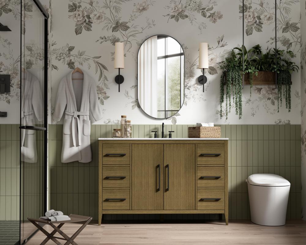 The minimalist flat door panels create a sleek, modern appearance, perfect for blending into transitional and contemporary bathroom designs.