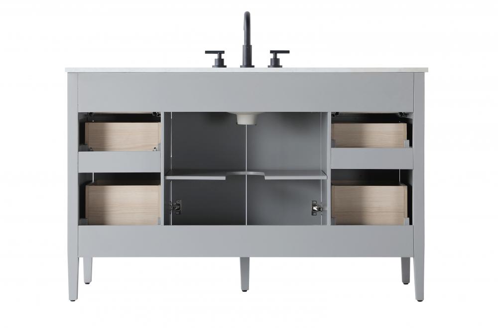 Inside the cabinet, the shelf is thoughtfully designed with a U-shaped cutout to allow for seamless plumbing installation while maintaining storage space.