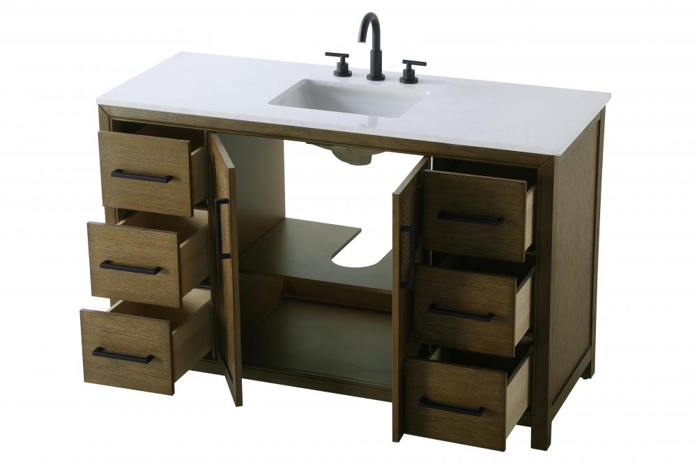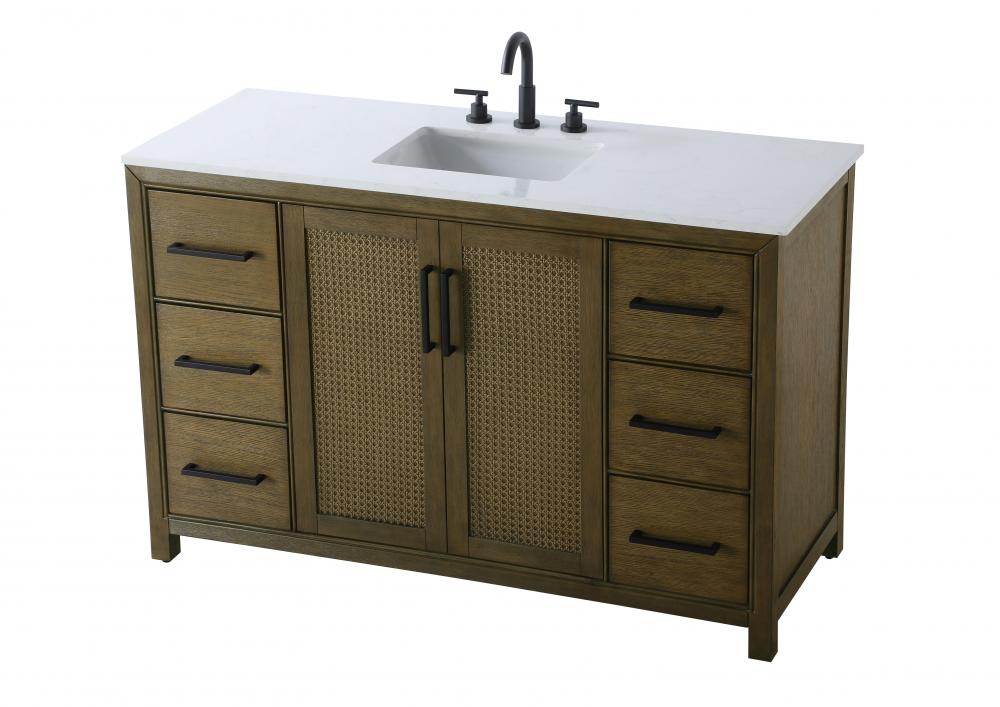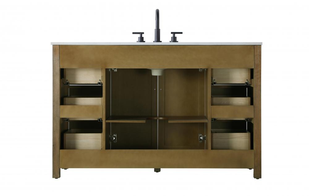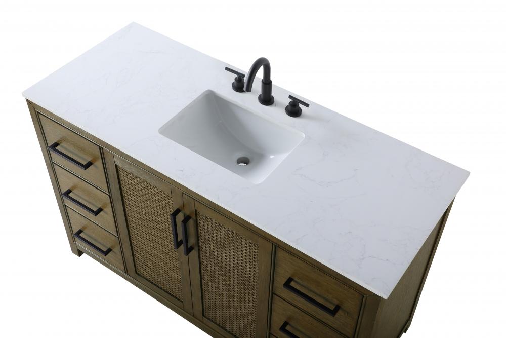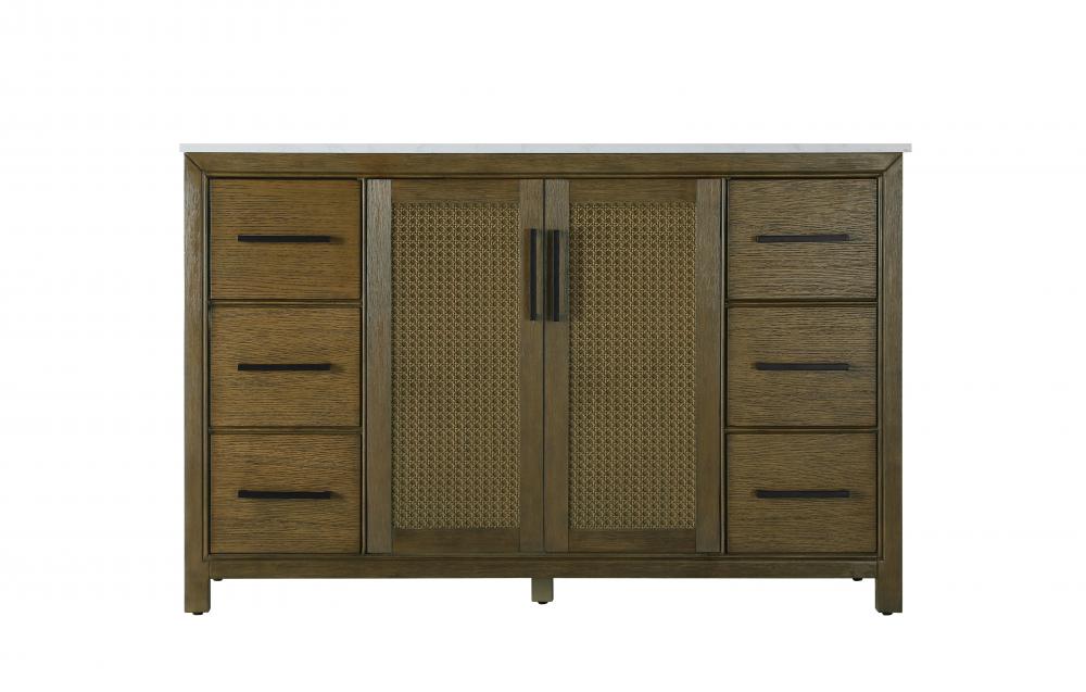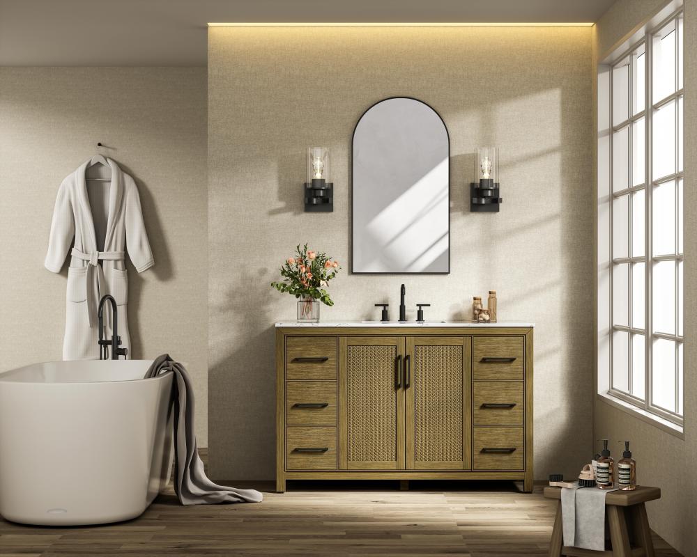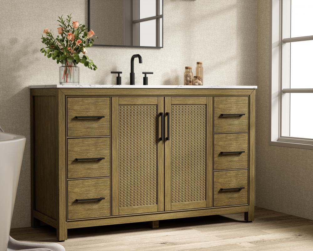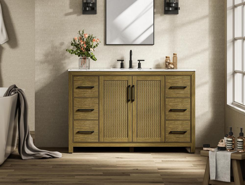Perfect for those with an eye for detail and quality, this transitional vanity blends modern design with timeless elegance. Available in five stunning finishes, from Crisp White to Linen Oak, the wood grain visuals of the oak options bring warmth and character to any bathroom. The caning design on the Shaker-style door panels adds texture and a touch of refinement, while the soft-closing doors and drawers ensure smooth, quiet functionality. Topped with a white engineered marble countertop, the vanity offers both luxury and practicality, complete with pre-drilled faucet holes for customization. A concealed overflow and U-shaped shelf for plumbing make installation effortless, and the slender black metal pulls provide a sleek contrast.