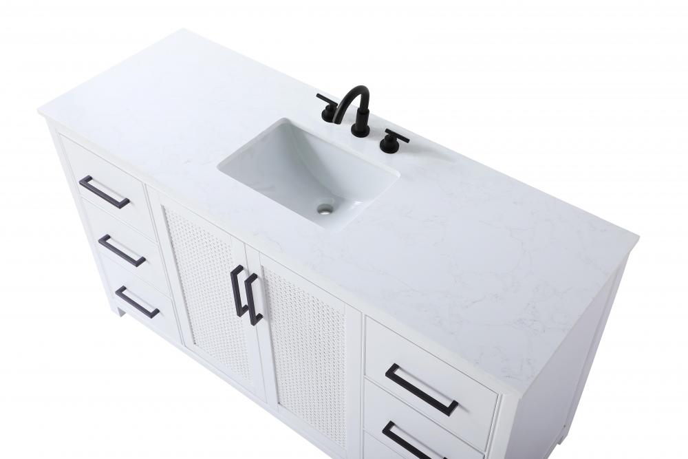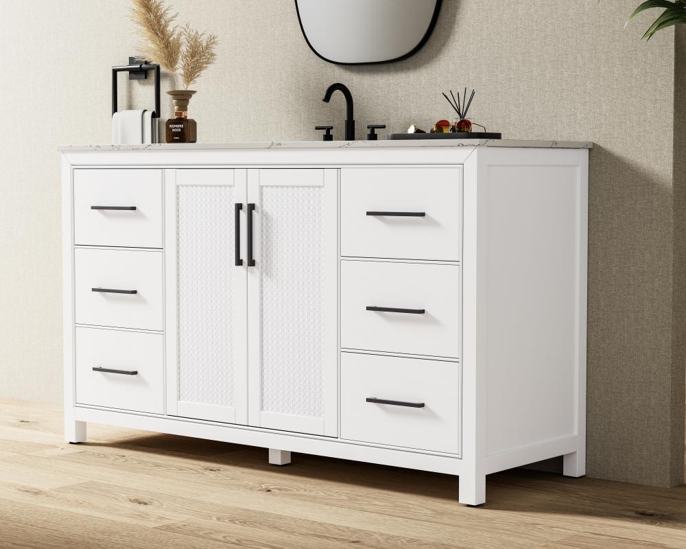 Perfect for those with an eye for detail and quality, this transitional vanity blends modern design with timeless elegance. Available in five stunning finishes, from Crisp White to Linen Oak, the wood grain visuals of the oak options bring warmth and character to any bathroom. The caning design on the Shaker-style door panels adds texture and a touch of refinement, while the soft-closing doors and drawers ensure smooth, quiet functionality. Topped with a white engineered marble countertop, the vanity offers both luxury and practicality, complete with pre-drilled faucet holes for customization. A concealed overflow and U-shaped shelf for plumbing make installation effortless, and the slender black metal pulls provide a sleek contrast.